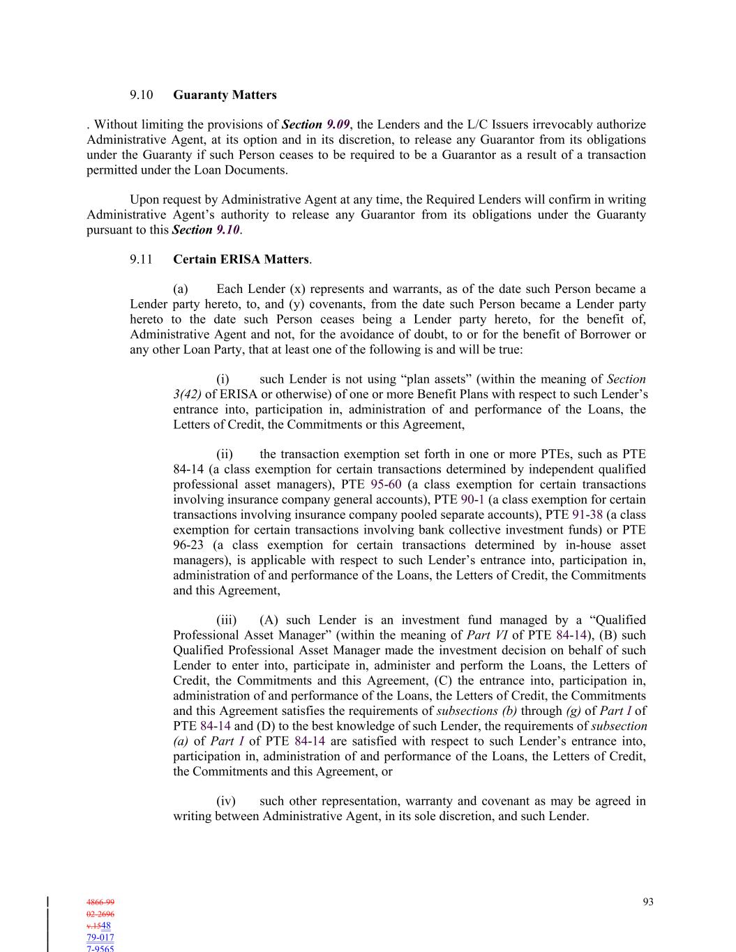 4866-99 02-2696 v.1548 79-017 7-9565 93 9.10 Guaranty Matters . Without limiting the provisions of Section 9.09, the Lenders and the L/C Issuers irrevocably authorize Administrative Agent, at its option and in its discretion, to release any Guarantor from its obligations under the Guaranty if such Person ceases to be required to be a Guarantor as a result of a transaction permitted under the Loan Documents. Upon request by Administrative Agent at any time, the Required Lenders will confirm in writing Administrative Agent’s authority to release any Guarantor from its obligations under the Guaranty pursuant to this Section 9.10. 9.11 Certain ERISA Matters. (a) Each Lender (x) represents and warrants, as of the date such Person became a Lender party hereto, to, and (y) covenants, from the date such Person became a Lender party hereto to the date such Person ceases being a Lender party hereto, for the benefit of, Administrative Agent and not, for the avoidance of doubt, to or for the benefit of Borrower or any other Loan Party, that at least one of the following is and will be true: (i) such Lender is not using “plan assets” (within the meaning of Section 3(42) of ERISA or otherwise) of one or more Benefit Plans with respect to such Lender’s entrance into, participation in, administration of and performance of the Loans, the Letters of Credit, the Commitments or this Agreement, (ii) the transaction exemption set forth in one or more PTEs, such as PTE 84-14 (a class exemption for certain transactions determined by independent qualified professional asset managers), PTE 95-60 (a class exemption for certain transactions involving insurance company general accounts), PTE 90-1 (a class exemption for certain transactions involving insurance company pooled separate accounts), PTE 91-38 (a class exemption for certain transactions involving bank collective investment funds) or PTE 96-23 (a class exemption for certain transactions determined by in-house asset managers), is applicable with respect to such Lender’s entrance into, participation in, administration of and performance of the Loans, the Letters of Credit, the Commitments and this Agreement, (iii) (A) such Lender is an investment fund managed by a “Qualified Professional Asset Manager” (within the meaning of Part VI of PTE 84-14), (B) such Qualified Professional Asset Manager made the investment decision on behalf of such Lender to enter into, participate in, administer and perform the Loans, the Letters of Credit, the Commitments and this Agreement, (C) the entrance into, participation in, administration of and performance of the Loans, the Letters of Credit, the Commitments and this Agreement satisfies the requirements of subsections (b) through (g) of Part I of PTE 84-14 and (D) to the best knowledge of such Lender, the requirements of subsection (a) of Part I of PTE 84-14 are satisfied with respect to such Lender’s entrance into, participation in, administration of and performance of the Loans, the Letters of Credit, the Commitments and this Agreement, or (iv) such other representation, warranty and covenant as may be agreed in writing between Administrative Agent, in its sole discretion, and such Lender.