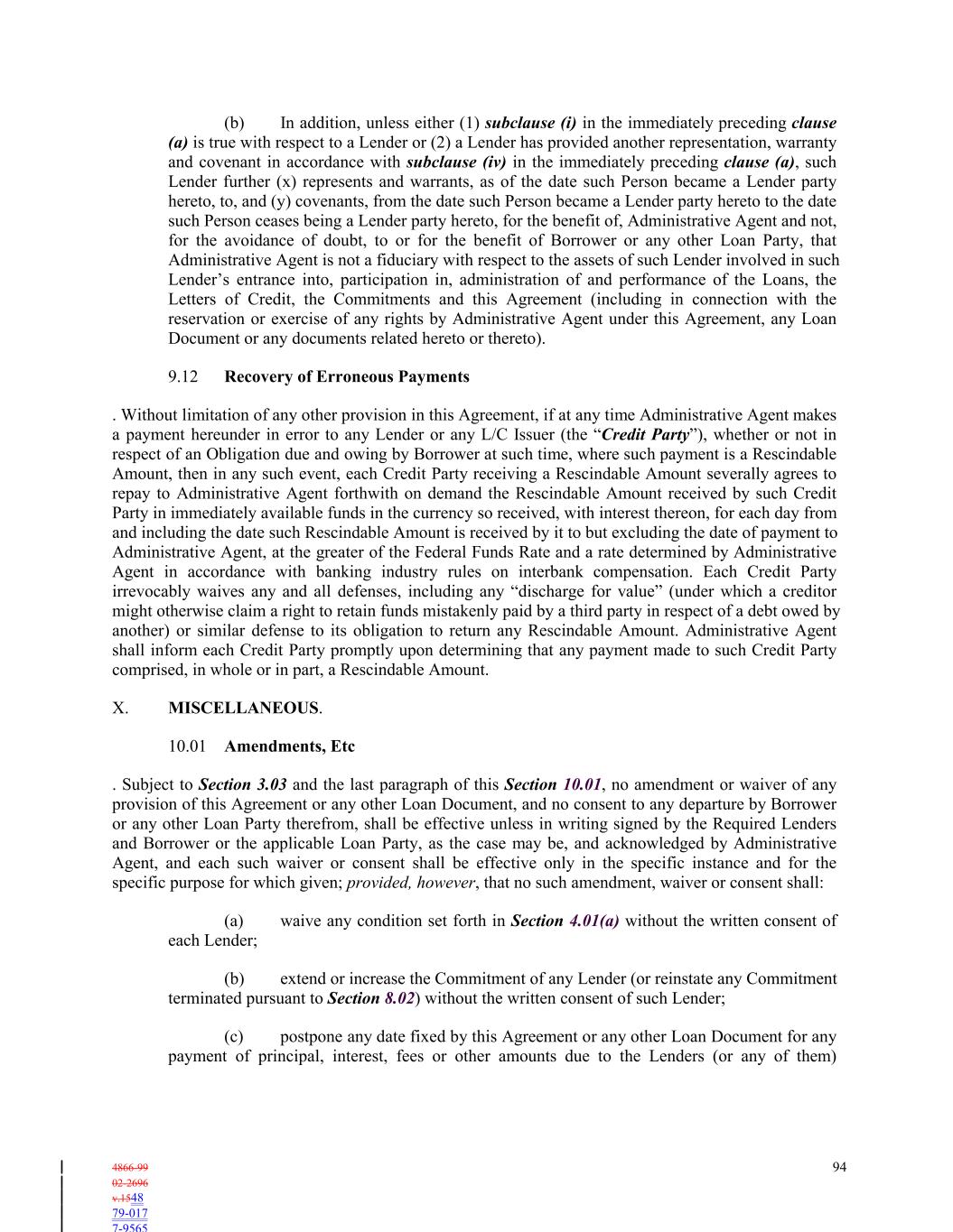 4866-99 02-2696 v.1548 79-017 7-9565 94 (b) In addition, unless either (1) subclause (i) in the immediately preceding clause (a) is true with respect to a Lender or (2) a Lender has provided another representation, warranty and covenant in accordance with subclause (iv) in the immediately preceding clause (a), such Lender further (x) represents and warrants, as of the date such Person became a Lender party hereto, to, and (y) covenants, from the date such Person became a Lender party hereto to the date such Person ceases being a Lender party hereto, for the benefit of, Administrative Agent and not, for the avoidance of doubt, to or for the benefit of Borrower or any other Loan Party, that Administrative Agent is not a fiduciary with respect to the assets of such Lender involved in such Lender’s entrance into, participation in, administration of and performance of the Loans, the Letters of Credit, the Commitments and this Agreement (including in connection with the reservation or exercise of any rights by Administrative Agent under this Agreement, any Loan Document or any documents related hereto or thereto). 9.12 Recovery of Erroneous Payments . Without limitation of any other provision in this Agreement, if at any time Administrative Agent makes a payment hereunder in error to any Lender or any L/C Issuer (the “Credit Party”), whether or not in respect of an Obligation due and owing by Borrower at such time, where such payment is a Rescindable Amount, then in any such event, each Credit Party receiving a Rescindable Amount severally agrees to repay to Administrative Agent forthwith on demand the Rescindable Amount received by such Credit Party in immediately available funds in the currency so received, with interest thereon, for each day from and including the date such Rescindable Amount is received by it to but excluding the date of payment to Administrative Agent, at the greater of the Federal Funds Rate and a rate determined by Administrative Agent in accordance with banking industry rules on interbank compensation. Each Credit Party irrevocably waives any and all defenses, including any “discharge for value” (under which a creditor might otherwise claim a right to retain funds mistakenly paid by a third party in respect of a debt owed by another) or similar defense to its obligation to return any Rescindable Amount. Administrative Agent shall inform each Credit Party promptly upon determining that any payment made to such Credit Party comprised, in whole or in part, a Rescindable Amount. X. MISCELLANEOUS. 10.01 Amendments, Etc . Subject to Section 3.03 and the last paragraph of this Section 10.01, no amendment or waiver of any provision of this Agreement or any other Loan Document, and no consent to any departure by Borrower or any other Loan Party therefrom, shall be effective unless in writing signed by the Required Lenders and Borrower or the applicable Loan Party, as the case may be, and acknowledged by Administrative Agent, and each such waiver or consent shall be effective only in the specific instance and for the specific purpose for which given; provided, however, that no such amendment, waiver or consent shall: (a) waive any condition set forth in Section 4.01(a) without the written consent of each Lender; (b) extend or increase the Commitment of any Lender (or reinstate any Commitment terminated pursuant to Section 8.02) without the written consent of such Lender; (c) postpone any date fixed by this Agreement or any other Loan Document for any payment of principal, interest, fees or other amounts due to the Lenders (or any of them)