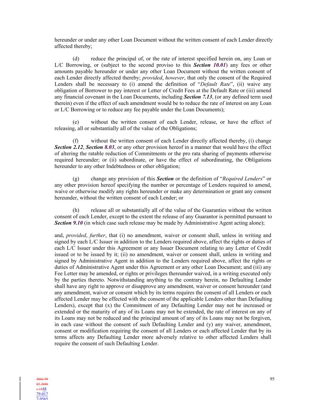 4866-99 02-2696 v.1548 79-017 7-9565 95 hereunder or under any other Loan Document without the written consent of each Lender directly affected thereby; (d) reduce the principal of, or the rate of interest specified herein on, any Loan or L/C Borrowing, or (subject to the second proviso to this Section 10.01) any fees or other amounts payable hereunder or under any other Loan Document without the written consent of each Lender directly affected thereby; provided, however, that only the consent of the Required Lenders shall be necessary to (i) amend the definition of “Default Rate”, (ii) waive any obligation of Borrower to pay interest or Letter of Credit Fees at the Default Rate or (iii) amend any financial covenant in the Loan Documents, including Section 7.13, (or any defined term used therein) even if the effect of such amendment would be to reduce the rate of interest on any Loan or L/C Borrowing or to reduce any fee payable under the Loan Documents); (e) without the written consent of each Lender, release, or have the effect of releasing, all or substantially all of the value of the Obligations; (f) without the written consent of each Lender directly affected thereby, (i) change Section 2.12, Section 8.03, or any other provision hereof in a manner that would have the effect of altering the ratable reduction of Commitments or the pro rata sharing of payments otherwise required hereunder; or (ii) subordinate, or have the effect of subordinating, the Obligations hereunder to any other Indebtedness or other obligation; (g) change any provision of this Section or the definition of “Required Lenders” or any other provision hereof specifying the number or percentage of Lenders required to amend, waive or otherwise modify any rights hereunder or make any determination or grant any consent hereunder, without the written consent of each Lender; or (h) release all or substantially all of the value of the Guaranties without the written consent of each Lender, except to the extent the release of any Guarantor is permitted pursuant to Section 9.10 (in which case such release may be made by Administrative Agent acting alone); and, provided, further, that (i) no amendment, waiver or consent shall, unless in writing and signed by each L/C Issuer in addition to the Lenders required above, affect the rights or duties of each L/C Issuer under this Agreement or any Issuer Document relating to any Letter of Credit issued or to be issued by it; (ii) no amendment, waiver or consent shall, unless in writing and signed by Administrative Agent in addition to the Lenders required above, affect the rights or duties of Administrative Agent under this Agreement or any other Loan Document; and (iii) any Fee Letter may be amended, or rights or privileges thereunder waived, in a writing executed only by the parties thereto. Notwithstanding anything to the contrary herein, no Defaulting Lender shall have any right to approve or disapprove any amendment, waiver or consent hereunder (and any amendment, waiver or consent which by its terms requires the consent of all Lenders or each affected Lender may be effected with the consent of the applicable Lenders other than Defaulting Lenders), except that (x) the Commitment of any Defaulting Lender may not be increased or extended or the maturity of any of its Loans may not be extended, the rate of interest on any of its Loans may not be reduced and the principal amount of any of its Loans may not be forgiven, in each case without the consent of such Defaulting Lender and (y) any waiver, amendment, consent or modification requiring the consent of all Lenders or each affected Lender that by its terms affects any Defaulting Lender more adversely relative to other affected Lenders shall require the consent of such Defaulting Lender.