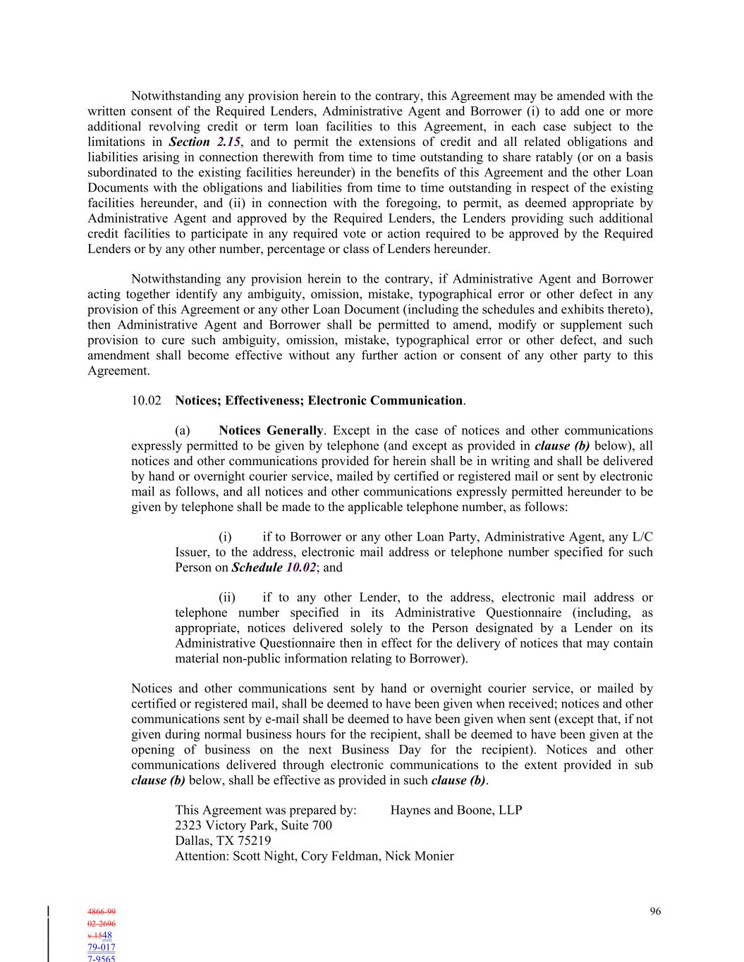 4866-99 02-2696 v.1548 79-017 7-9565 96 Notwithstanding any provision herein to the contrary, this Agreement may be amended with the written consent of the Required Lenders, Administrative Agent and Borrower (i) to add one or more additional revolving credit or term loan facilities to this Agreement, in each case subject to the limitations in Section 2.15, and to permit the extensions of credit and all related obligations and liabilities arising in connection therewith from time to time outstanding to share ratably (or on a basis subordinated to the existing facilities hereunder) in the benefits of this Agreement and the other Loan Documents with the obligations and liabilities from time to time outstanding in respect of the existing facilities hereunder, and (ii) in connection with the foregoing, to permit, as deemed appropriate by Administrative Agent and approved by the Required Lenders, the Lenders providing such additional credit facilities to participate in any required vote or action required to be approved by the Required Lenders or by any other number, percentage or class of Lenders hereunder. Notwithstanding any provision herein to the contrary, if Administrative Agent and Borrower acting together identify any ambiguity, omission, mistake, typographical error or other defect in any provision of this Agreement or any other Loan Document (including the schedules and exhibits thereto), then Administrative Agent and Borrower shall be permitted to amend, modify or supplement such provision to cure such ambiguity, omission, mistake, typographical error or other defect, and such amendment shall become effective without any further action or consent of any other party to this Agreement. 10.02 Notices; Effectiveness; Electronic Communication. (a) Notices Generally. Except in the case of notices and other communications expressly permitted to be given by telephone (and except as provided in clause (b) below), all notices and other communications provided for herein shall be in writing and shall be delivered by hand or overnight courier service, mailed by certified or registered mail or sent by electronic mail as follows, and all notices and other communications expressly permitted hereunder to be given by telephone shall be made to the applicable telephone number, as follows: (i) if to Borrower or any other Loan Party, Administrative Agent, any L/C Issuer, to the address, electronic mail address or telephone number specified for such Person on Schedule 10.02; and (ii) if to any other Lender, to the address, electronic mail address or telephone number specified in its Administrative Questionnaire (including, as appropriate, notices delivered solely to the Person designated by a Lender on its Administrative Questionnaire then in effect for the delivery of notices that may contain material non-public information relating to Borrower). Notices and other communications sent by hand or overnight courier service, or mailed by certified or registered mail, shall be deemed to have been given when received; notices and other communications sent by e-mail shall be deemed to have been given when sent (except that, if not given during normal business hours for the recipient, shall be deemed to have been given at the opening of business on the next Business Day for the recipient). Notices and other communications delivered through electronic communications to the extent provided in sub clause (b) below, shall be effective as provided in such clause (b). This Agreement was prepared by: Haynes and Boone, LLP 2323 Victory Park, Suite 700 Dallas, TX 75219 Attention: Scott Night, Cory Feldman, Nick Monier
