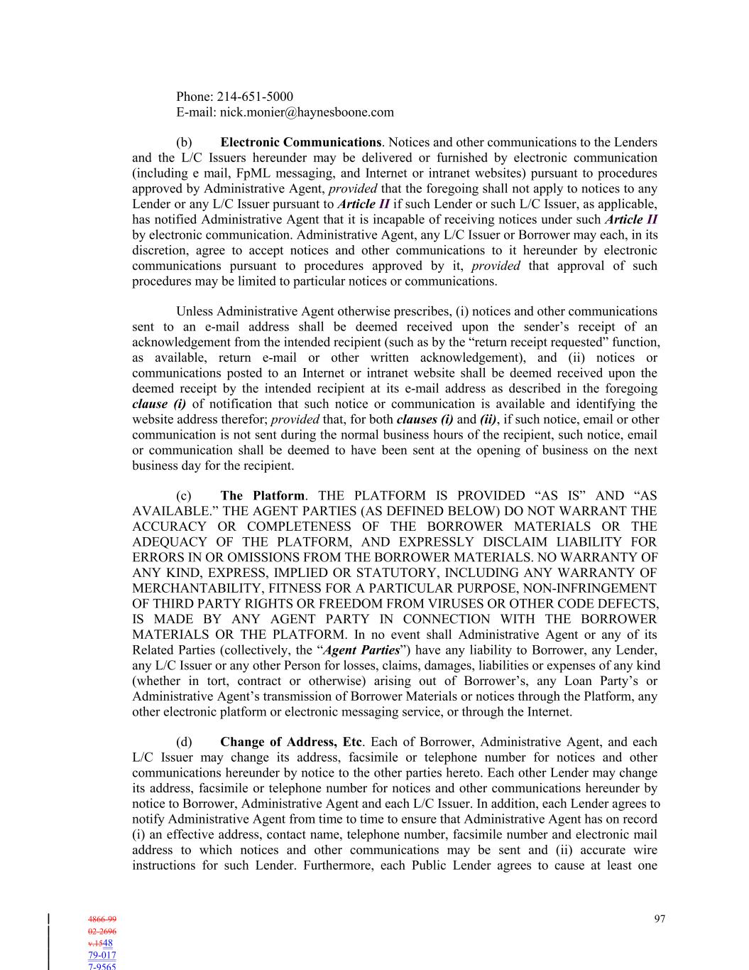 4866-99 02-2696 v.1548 79-017 7-9565 97 Phone: 214-651-5000 E-mail: nick.monier@haynesboone.com (b) Electronic Communications. Notices and other communications to the Lenders and the L/C Issuers hereunder may be delivered or furnished by electronic communication (including e mail, FpML messaging, and Internet or intranet websites) pursuant to procedures approved by Administrative Agent, provided that the foregoing shall not apply to notices to any Lender or any L/C Issuer pursuant to Article II if such Lender or such L/C Issuer, as applicable, has notified Administrative Agent that it is incapable of receiving notices under such Article II by electronic communication. Administrative Agent, any L/C Issuer or Borrower may each, in its discretion, agree to accept notices and other communications to it hereunder by electronic communications pursuant to procedures approved by it, provided that approval of such procedures may be limited to particular notices or communications. Unless Administrative Agent otherwise prescribes, (i) notices and other communications sent to an e-mail address shall be deemed received upon the sender’s receipt of an acknowledgement from the intended recipient (such as by the “return receipt requested” function, as available, return e-mail or other written acknowledgement), and (ii) notices or communications posted to an Internet or intranet website shall be deemed received upon the deemed receipt by the intended recipient at its e-mail address as described in the foregoing clause (i) of notification that such notice or communication is available and identifying the website address therefor; provided that, for both clauses (i) and (ii), if such notice, email or other communication is not sent during the normal business hours of the recipient, such notice, email or communication shall be deemed to have been sent at the opening of business on the next business day for the recipient. (c) The Platform. THE PLATFORM IS PROVIDED “AS IS” AND “AS AVAILABLE.” THE AGENT PARTIES (AS DEFINED BELOW) DO NOT WARRANT THE ACCURACY OR COMPLETENESS OF THE BORROWER MATERIALS OR THE ADEQUACY OF THE PLATFORM, AND EXPRESSLY DISCLAIM LIABILITY FOR ERRORS IN OR OMISSIONS FROM THE BORROWER MATERIALS. NO WARRANTY OF ANY KIND, EXPRESS, IMPLIED OR STATUTORY, INCLUDING ANY WARRANTY OF MERCHANTABILITY, FITNESS FOR A PARTICULAR PURPOSE, NON-INFRINGEMENT OF THIRD PARTY RIGHTS OR FREEDOM FROM VIRUSES OR OTHER CODE DEFECTS, IS MADE BY ANY AGENT PARTY IN CONNECTION WITH THE BORROWER MATERIALS OR THE PLATFORM. In no event shall Administrative Agent or any of its Related Parties (collectively, the “Agent Parties”) have any liability to Borrower, any Lender, any L/C Issuer or any other Person for losses, claims, damages, liabilities or expenses of any kind (whether in tort, contract or otherwise) arising out of Borrower’s, any Loan Party’s or Administrative Agent’s transmission of Borrower Materials or notices through the Platform, any other electronic platform or electronic messaging service, or through the Internet. (d) Change of Address, Etc. Each of Borrower, Administrative Agent, and each L/C Issuer may change its address, facsimile or telephone number for notices and other communications hereunder by notice to the other parties hereto. Each other Lender may change its address, facsimile or telephone number for notices and other communications hereunder by notice to Borrower, Administrative Agent and each L/C Issuer. In addition, each Lender agrees to notify Administrative Agent from time to time to ensure that Administrative Agent has on record (i) an effective address, contact name, telephone number, facsimile number and electronic mail address to which notices and other communications may be sent and (ii) accurate wire instructions for such Lender. Furthermore, each Public Lender agrees to cause at least one