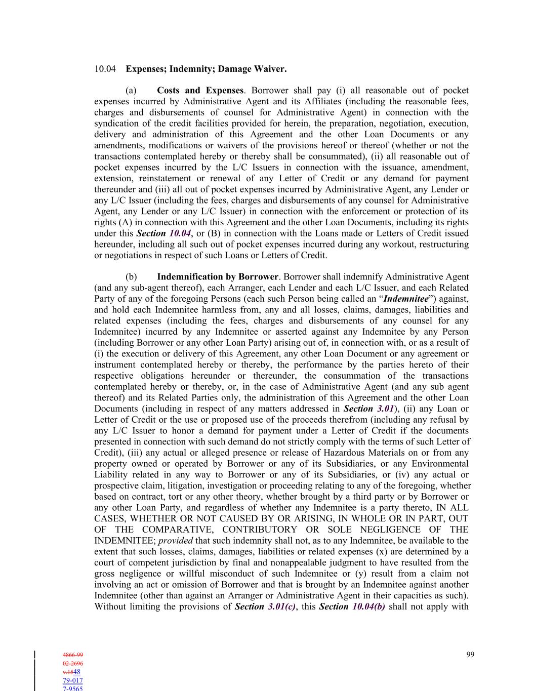 4866-99 02-2696 v.1548 79-017 7-9565 99 10.04 Expenses; Indemnity; Damage Waiver. (a) Costs and Expenses. Borrower shall pay (i) all reasonable out of pocket expenses incurred by Administrative Agent and its Affiliates (including the reasonable fees, charges and disbursements of counsel for Administrative Agent) in connection with the syndication of the credit facilities provided for herein, the preparation, negotiation, execution, delivery and administration of this Agreement and the other Loan Documents or any amendments, modifications or waivers of the provisions hereof or thereof (whether or not the transactions contemplated hereby or thereby shall be consummated), (ii) all reasonable out of pocket expenses incurred by the L/C Issuers in connection with the issuance, amendment, extension, reinstatement or renewal of any Letter of Credit or any demand for payment thereunder and (iii) all out of pocket expenses incurred by Administrative Agent, any Lender or any L/C Issuer (including the fees, charges and disbursements of any counsel for Administrative Agent, any Lender or any L/C Issuer) in connection with the enforcement or protection of its rights (A) in connection with this Agreement and the other Loan Documents, including its rights under this Section 10.04, or (B) in connection with the Loans made or Letters of Credit issued hereunder, including all such out of pocket expenses incurred during any workout, restructuring or negotiations in respect of such Loans or Letters of Credit. (b) Indemnification by Borrower. Borrower shall indemnify Administrative Agent (and any sub-agent thereof), each Arranger, each Lender and each L/C Issuer, and each Related Party of any of the foregoing Persons (each such Person being called an “Indemnitee”) against, and hold each Indemnitee harmless from, any and all losses, claims, damages, liabilities and related expenses (including the fees, charges and disbursements of any counsel for any Indemnitee) incurred by any Indemnitee or asserted against any Indemnitee by any Person (including Borrower or any other Loan Party) arising out of, in connection with, or as a result of (i) the execution or delivery of this Agreement, any other Loan Document or any agreement or instrument contemplated hereby or thereby, the performance by the parties hereto of their respective obligations hereunder or thereunder, the consummation of the transactions contemplated hereby or thereby, or, in the case of Administrative Agent (and any sub agent thereof) and its Related Parties only, the administration of this Agreement and the other Loan Documents (including in respect of any matters addressed in Section 3.01), (ii) any Loan or Letter of Credit or the use or proposed use of the proceeds therefrom (including any refusal by any L/C Issuer to honor a demand for payment under a Letter of Credit if the documents presented in connection with such demand do not strictly comply with the terms of such Letter of Credit), (iii) any actual or alleged presence or release of Hazardous Materials on or from any property owned or operated by Borrower or any of its Subsidiaries, or any Environmental Liability related in any way to Borrower or any of its Subsidiaries, or (iv) any actual or prospective claim, litigation, investigation or proceeding relating to any of the foregoing, whether based on contract, tort or any other theory, whether brought by a third party or by Borrower or any other Loan Party, and regardless of whether any Indemnitee is a party thereto, IN ALL CASES, WHETHER OR NOT CAUSED BY OR ARISING, IN WHOLE OR IN PART, OUT OF THE COMPARATIVE, CONTRIBUTORY OR SOLE NEGLIGENCE OF THE INDEMNITEE; provided that such indemnity shall not, as to any Indemnitee, be available to the extent that such losses, claims, damages, liabilities or related expenses (x) are determined by a court of competent jurisdiction by final and nonappealable judgment to have resulted from the gross negligence or willful misconduct of such Indemnitee or (y) result from a claim not involving an act or omission of Borrower and that is brought by an Indemnitee against another Indemnitee (other than against an Arranger or Administrative Agent in their capacities as such). Without limiting the provisions of Section 3.01(c), this Section 10.04(b) shall not apply with