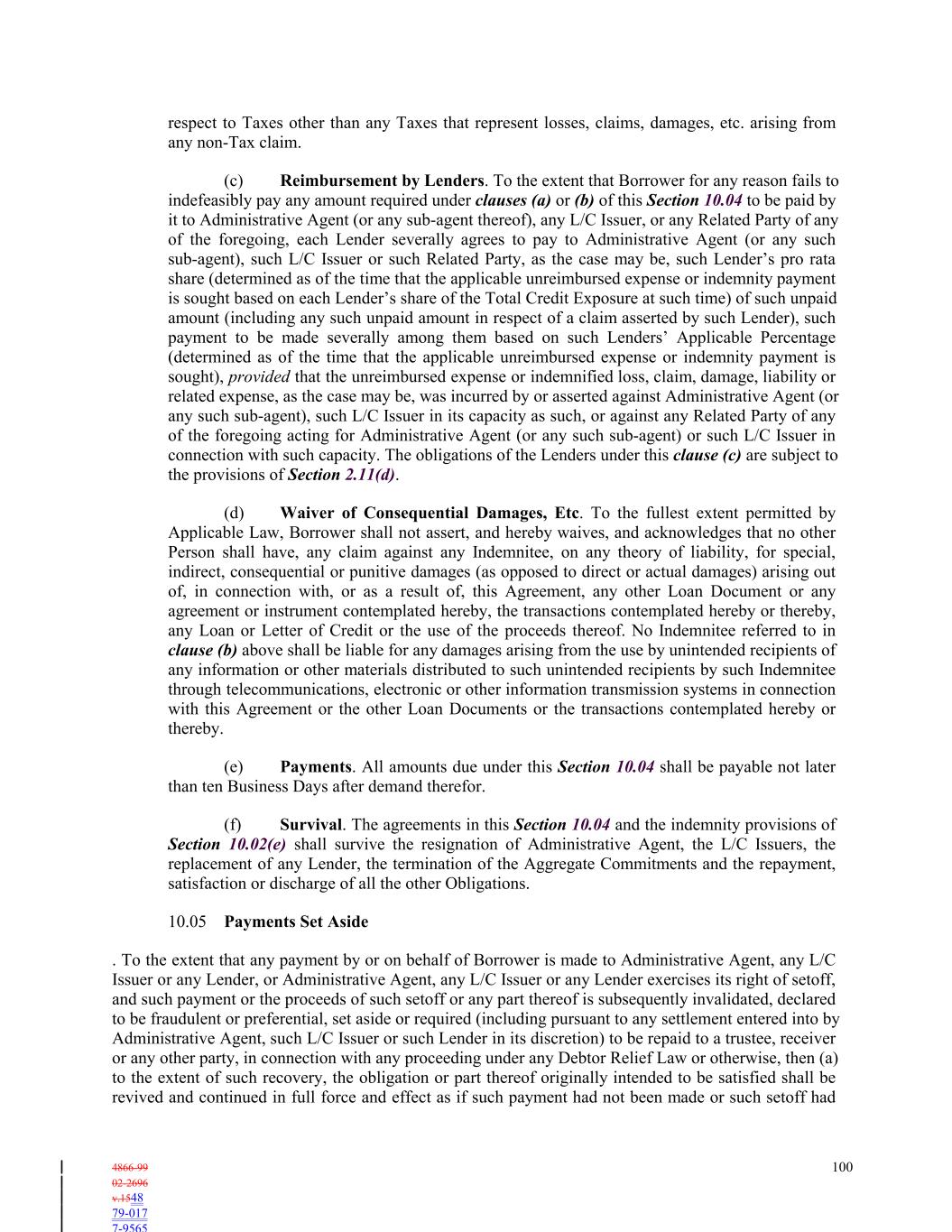 4866-99 02-2696 v.1548 79-017 7-9565 100 respect to Taxes other than any Taxes that represent losses, claims, damages, etc. arising from any non-Tax claim. (c) Reimbursement by Lenders. To the extent that Borrower for any reason fails to indefeasibly pay any amount required under clauses (a) or (b) of this Section 10.04 to be paid by it to Administrative Agent (or any sub-agent thereof), any L/C Issuer, or any Related Party of any of the foregoing, each Lender severally agrees to pay to Administrative Agent (or any such sub-agent), such L/C Issuer or such Related Party, as the case may be, such Lender’s pro rata share (determined as of the time that the applicable unreimbursed expense or indemnity payment is sought based on each Lender’s share of the Total Credit Exposure at such time) of such unpaid amount (including any such unpaid amount in respect of a claim asserted by such Lender), such payment to be made severally among them based on such Lenders’ Applicable Percentage (determined as of the time that the applicable unreimbursed expense or indemnity payment is sought), provided that the unreimbursed expense or indemnified loss, claim, damage, liability or related expense, as the case may be, was incurred by or asserted against Administrative Agent (or any such sub-agent), such L/C Issuer in its capacity as such, or against any Related Party of any of the foregoing acting for Administrative Agent (or any such sub-agent) or such L/C Issuer in connection with such capacity. The obligations of the Lenders under this clause (c) are subject to the provisions of Section 2.11(d). (d) Waiver of Consequential Damages, Etc. To the fullest extent permitted by Applicable Law, Borrower shall not assert, and hereby waives, and acknowledges that no other Person shall have, any claim against any Indemnitee, on any theory of liability, for special, indirect, consequential or punitive damages (as opposed to direct or actual damages) arising out of, in connection with, or as a result of, this Agreement, any other Loan Document or any agreement or instrument contemplated hereby, the transactions contemplated hereby or thereby, any Loan or Letter of Credit or the use of the proceeds thereof. No Indemnitee referred to in clause (b) above shall be liable for any damages arising from the use by unintended recipients of any information or other materials distributed to such unintended recipients by such Indemnitee through telecommunications, electronic or other information transmission systems in connection with this Agreement or the other Loan Documents or the transactions contemplated hereby or thereby. (e) Payments. All amounts due under this Section 10.04 shall be payable not later than ten Business Days after demand therefor. (f) Survival. The agreements in this Section 10.04 and the indemnity provisions of Section 10.02(e) shall survive the resignation of Administrative Agent, the L/C Issuers, the replacement of any Lender, the termination of the Aggregate Commitments and the repayment, satisfaction or discharge of all the other Obligations. 10.05 Payments Set Aside . To the extent that any payment by or on behalf of Borrower is made to Administrative Agent, any L/C Issuer or any Lender, or Administrative Agent, any L/C Issuer or any Lender exercises its right of setoff, and such payment or the proceeds of such setoff or any part thereof is subsequently invalidated, declared to be fraudulent or preferential, set aside or required (including pursuant to any settlement entered into by Administrative Agent, such L/C Issuer or such Lender in its discretion) to be repaid to a trustee, receiver or any other party, in connection with any proceeding under any Debtor Relief Law or otherwise, then (a) to the extent of such recovery, the obligation or part thereof originally intended to be satisfied shall be revived and continued in full force and effect as if such payment had not been made or such setoff had