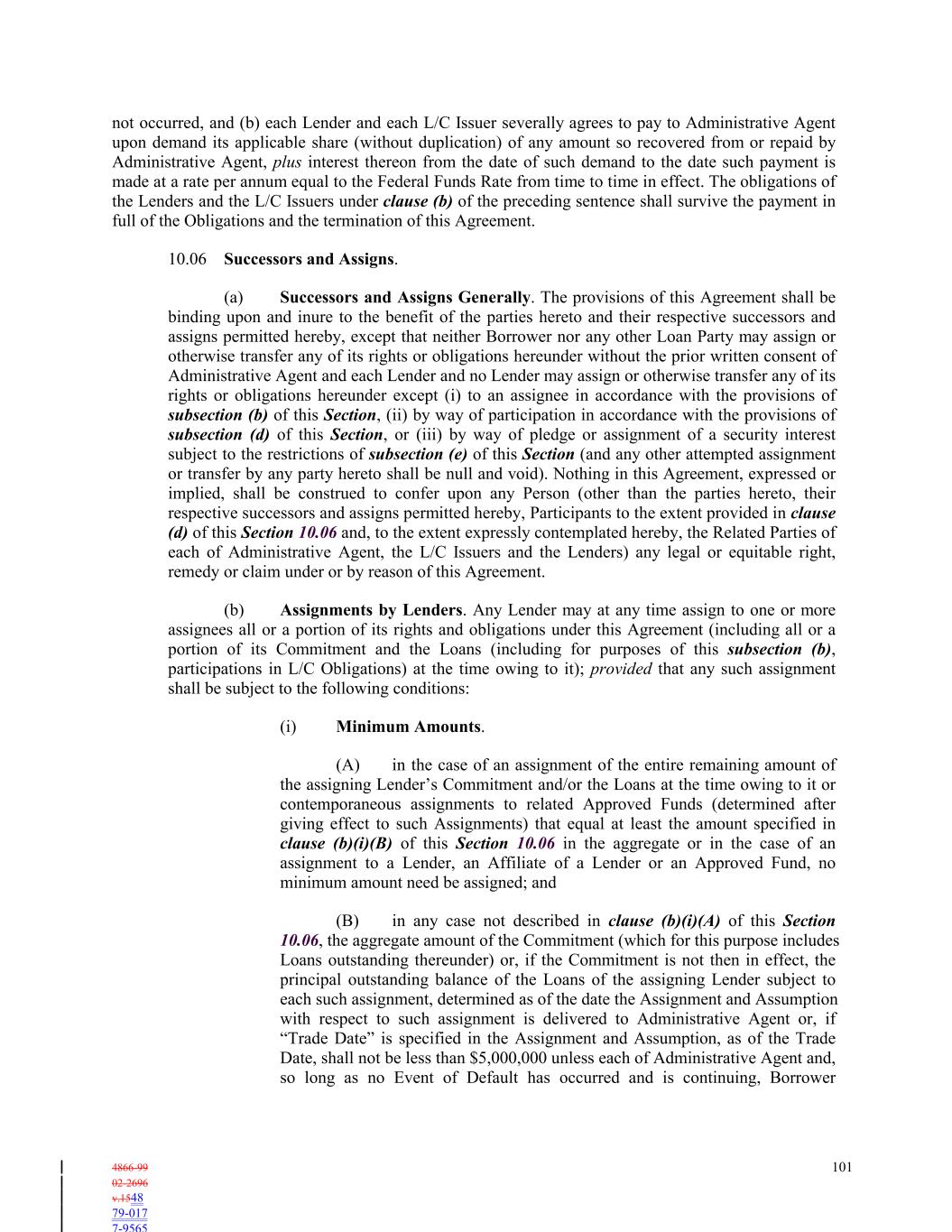 4866-99 02-2696 v.1548 79-017 7-9565 101 not occurred, and (b) each Lender and each L/C Issuer severally agrees to pay to Administrative Agent upon demand its applicable share (without duplication) of any amount so recovered from or repaid by Administrative Agent, plus interest thereon from the date of such demand to the date such payment is made at a rate per annum equal to the Federal Funds Rate from time to time in effect. The obligations of the Lenders and the L/C Issuers under clause (b) of the preceding sentence shall survive the payment in full of the Obligations and the termination of this Agreement. 10.06 Successors and Assigns. (a) Successors and Assigns Generally. The provisions of this Agreement shall be binding upon and inure to the benefit of the parties hereto and their respective successors and assigns permitted hereby, except that neither Borrower nor any other Loan Party may assign or otherwise transfer any of its rights or obligations hereunder without the prior written consent of Administrative Agent and each Lender and no Lender may assign or otherwise transfer any of its rights or obligations hereunder except (i) to an assignee in accordance with the provisions of subsection (b) of this Section, (ii) by way of participation in accordance with the provisions of subsection (d) of this Section, or (iii) by way of pledge or assignment of a security interest subject to the restrictions of subsection (e) of this Section (and any other attempted assignment or transfer by any party hereto shall be null and void). Nothing in this Agreement, expressed or implied, shall be construed to confer upon any Person (other than the parties hereto, their respective successors and assigns permitted hereby, Participants to the extent provided in clause (d) of this Section 10.06 and, to the extent expressly contemplated hereby, the Related Parties of each of Administrative Agent, the L/C Issuers and the Lenders) any legal or equitable right, remedy or claim under or by reason of this Agreement. (b) Assignments by Lenders. Any Lender may at any time assign to one or more assignees all or a portion of its rights and obligations under this Agreement (including all or a portion of its Commitment and the Loans (including for purposes of this subsection (b), participations in L/C Obligations) at the time owing to it); provided that any such assignment shall be subject to the following conditions: (i) Minimum Amounts. (A) in the case of an assignment of the entire remaining amount of the assigning Lender’s Commitment and/or the Loans at the time owing to it or contemporaneous assignments to related Approved Funds (determined after giving effect to such Assignments) that equal at least the amount specified in clause (b)(i)(B) of this Section 10.06 in the aggregate or in the case of an assignment to a Lender, an Affiliate of a Lender or an Approved Fund, no minimum amount need be assigned; and (B) in any case not described in clause (b)(i)(A) of this Section 10.06, the aggregate amount of the Commitment (which for this purpose includes Loans outstanding thereunder) or, if the Commitment is not then in effect, the principal outstanding balance of the Loans of the assigning Lender subject to each such assignment, determined as of the date the Assignment and Assumption with respect to such assignment is delivered to Administrative Agent or, if “Trade Date” is specified in the Assignment and Assumption, as of the Trade Date, shall not be less than $5,000,000 unless each of Administrative Agent and, so long as no Event of Default has occurred and is continuing, Borrower