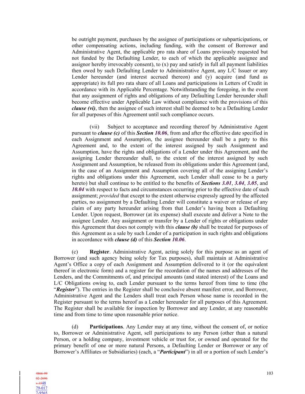4866-99 02-2696 v.1548 79-017 7-9565 103 be outright payment, purchases by the assignee of participations or subparticipations, or other compensating actions, including funding, with the consent of Borrower and Administrative Agent, the applicable pro rata share of Loans previously requested but not funded by the Defaulting Lender, to each of which the applicable assignee and assignor hereby irrevocably consent), to (x) pay and satisfy in full all payment liabilities then owed by such Defaulting Lender to Administrative Agent, any L/C Issuer or any Lender hereunder (and interest accrued thereon) and (y) acquire (and fund as appropriate) its full pro rata share of all Loans and participations in Letters of Credit in accordance with its Applicable Percentage. Notwithstanding the foregoing, in the event that any assignment of rights and obligations of any Defaulting Lender hereunder shall become effective under Applicable Law without compliance with the provisions of this clause (vi), then the assignee of such interest shall be deemed to be a Defaulting Lender for all purposes of this Agreement until such compliance occurs. (vii) Subject to acceptance and recording thereof by Administrative Agent pursuant to clause (c) of this Section 10.06, from and after the effective date specified in each Assignment and Assumption, the assignee thereunder shall be a party to this Agreement and, to the extent of the interest assigned by such Assignment and Assumption, have the rights and obligations of a Lender under this Agreement, and the assigning Lender thereunder shall, to the extent of the interest assigned by such Assignment and Assumption, be released from its obligations under this Agreement (and, in the case of an Assignment and Assumption covering all of the assigning Lender’s rights and obligations under this Agreement, such Lender shall cease to be a party hereto) but shall continue to be entitled to the benefits of Sections 3.01, 3.04, 3.05, and 10.04 with respect to facts and circumstances occurring prior to the effective date of such assignment; provided that except to the extent otherwise expressly agreed by the affected parties, no assignment by a Defaulting Lender will constitute a waiver or release of any claim of any party hereunder arising from that Lender’s having been a Defaulting Lender. Upon request, Borrower (at its expense) shall execute and deliver a Note to the assignee Lender. Any assignment or transfer by a Lender of rights or obligations under this Agreement that does not comply with this clause (b) shall be treated for purposes of this Agreement as a sale by such Lender of a participation in such rights and obligations in accordance with clause (d) of this Section 10.06. (c) Register. Administrative Agent, acting solely for this purpose as an agent of Borrower (and such agency being solely for Tax purposes), shall maintain at Administrative Agent’s Office a copy of each Assignment and Assumption delivered to it (or the equivalent thereof in electronic form) and a register for the recordation of the names and addresses of the Lenders, and the Commitments of, and principal amounts (and stated interest) of the Loans and L/C Obligations owing to, each Lender pursuant to the terms hereof from time to time (the “Register”). The entries in the Register shall be conclusive absent manifest error, and Borrower, Administrative Agent and the Lenders shall treat each Person whose name is recorded in the Register pursuant to the terms hereof as a Lender hereunder for all purposes of this Agreement. The Register shall be available for inspection by Borrower and any Lender, at any reasonable time and from time to time upon reasonable prior notice. (d) Participations. Any Lender may at any time, without the consent of, or notice to, Borrower or Administrative Agent, sell participations to any Person (other than a natural Person, or a holding company, investment vehicle or trust for, or owned and operated for the primary benefit of one or more natural Persons, a Defaulting Lender or Borrower or any of Borrower’s Affiliates or Subsidiaries) (each, a “Participant”) in all or a portion of such Lender’s