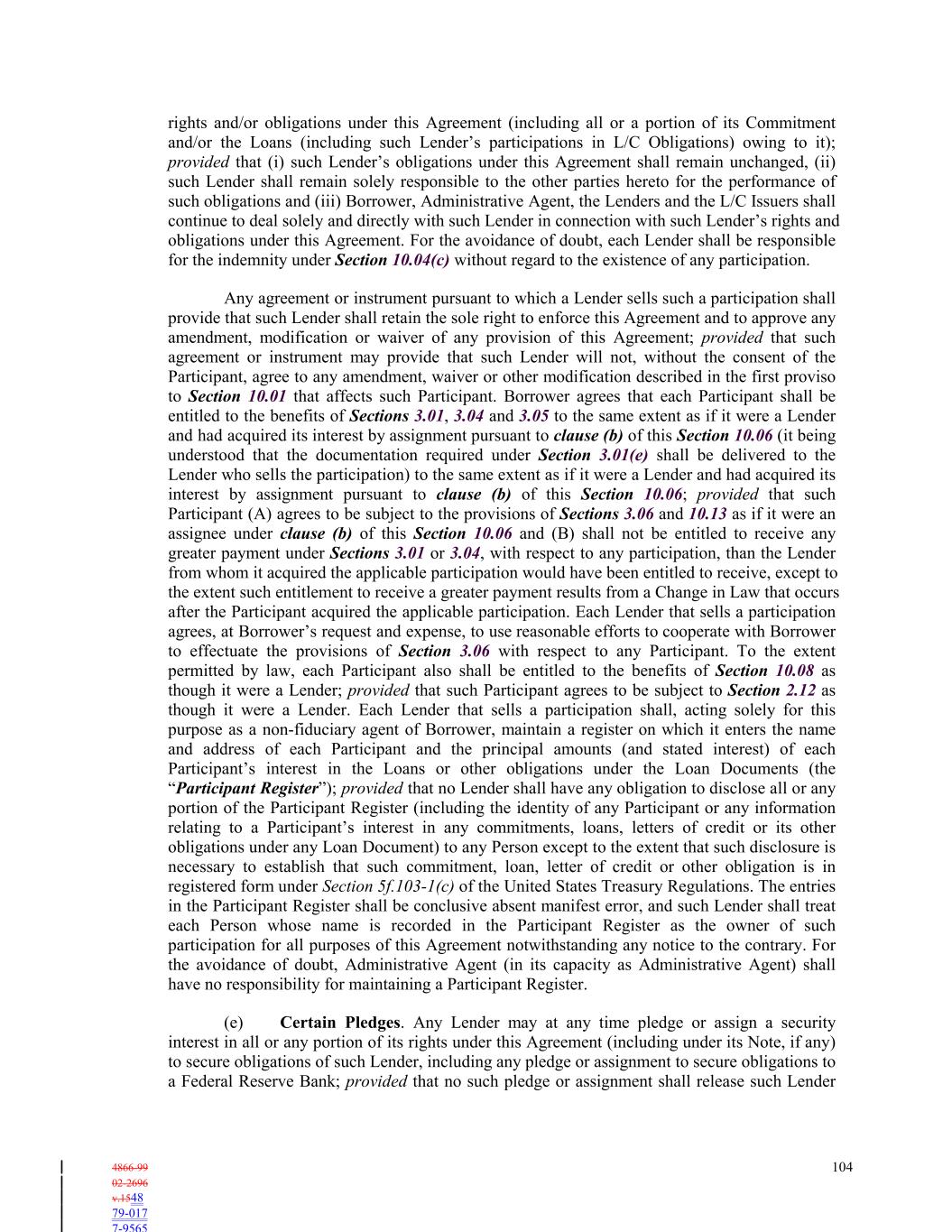 4866-99 02-2696 v.1548 79-017 7-9565 104 rights and/or obligations under this Agreement (including all or a portion of its Commitment and/or the Loans (including such Lender’s participations in L/C Obligations) owing to it); provided that (i) such Lender’s obligations under this Agreement shall remain unchanged, (ii) such Lender shall remain solely responsible to the other parties hereto for the performance of such obligations and (iii) Borrower, Administrative Agent, the Lenders and the L/C Issuers shall continue to deal solely and directly with such Lender in connection with such Lender’s rights and obligations under this Agreement. For the avoidance of doubt, each Lender shall be responsible for the indemnity under Section 10.04(c) without regard to the existence of any participation. Any agreement or instrument pursuant to which a Lender sells such a participation shall provide that such Lender shall retain the sole right to enforce this Agreement and to approve any amendment, modification or waiver of any provision of this Agreement; provided that such agreement or instrument may provide that such Lender will not, without the consent of the Participant, agree to any amendment, waiver or other modification described in the first proviso to Section 10.01 that affects such Participant. Borrower agrees that each Participant shall be entitled to the benefits of Sections 3.01, 3.04 and 3.05 to the same extent as if it were a Lender and had acquired its interest by assignment pursuant to clause (b) of this Section 10.06 (it being understood that the documentation required under Section 3.01(e) shall be delivered to the Lender who sells the participation) to the same extent as if it were a Lender and had acquired its interest by assignment pursuant to clause (b) of this Section 10.06; provided that such Participant (A) agrees to be subject to the provisions of Sections 3.06 and 10.13 as if it were an assignee under clause (b) of this Section 10.06 and (B) shall not be entitled to receive any greater payment under Sections 3.01 or 3.04, with respect to any participation, than the Lender from whom it acquired the applicable participation would have been entitled to receive, except to the extent such entitlement to receive a greater payment results from a Change in Law that occurs after the Participant acquired the applicable participation. Each Lender that sells a participation agrees, at Borrower’s request and expense, to use reasonable efforts to cooperate with Borrower to effectuate the provisions of Section 3.06 with respect to any Participant. To the extent permitted by law, each Participant also shall be entitled to the benefits of Section 10.08 as though it were a Lender; provided that such Participant agrees to be subject to Section 2.12 as though it were a Lender. Each Lender that sells a participation shall, acting solely for this purpose as a non-fiduciary agent of Borrower, maintain a register on which it enters the name and address of each Participant and the principal amounts (and stated interest) of each Participant’s interest in the Loans or other obligations under the Loan Documents (the “Participant Register”); provided that no Lender shall have any obligation to disclose all or any portion of the Participant Register (including the identity of any Participant or any information relating to a Participant’s interest in any commitments, loans, letters of credit or its other obligations under any Loan Document) to any Person except to the extent that such disclosure is necessary to establish that such commitment, loan, letter of credit or other obligation is in registered form under Section 5f.103-1(c) of the United States Treasury Regulations. The entries in the Participant Register shall be conclusive absent manifest error, and such Lender shall treat each Person whose name is recorded in the Participant Register as the owner of such participation for all purposes of this Agreement notwithstanding any notice to the contrary. For the avoidance of doubt, Administrative Agent (in its capacity as Administrative Agent) shall have no responsibility for maintaining a Participant Register. (e) Certain Pledges. Any Lender may at any time pledge or assign a security interest in all or any portion of its rights under this Agreement (including under its Note, if any) to secure obligations of such Lender, including any pledge or assignment to secure obligations to a Federal Reserve Bank; provided that no such pledge or assignment shall release such Lender