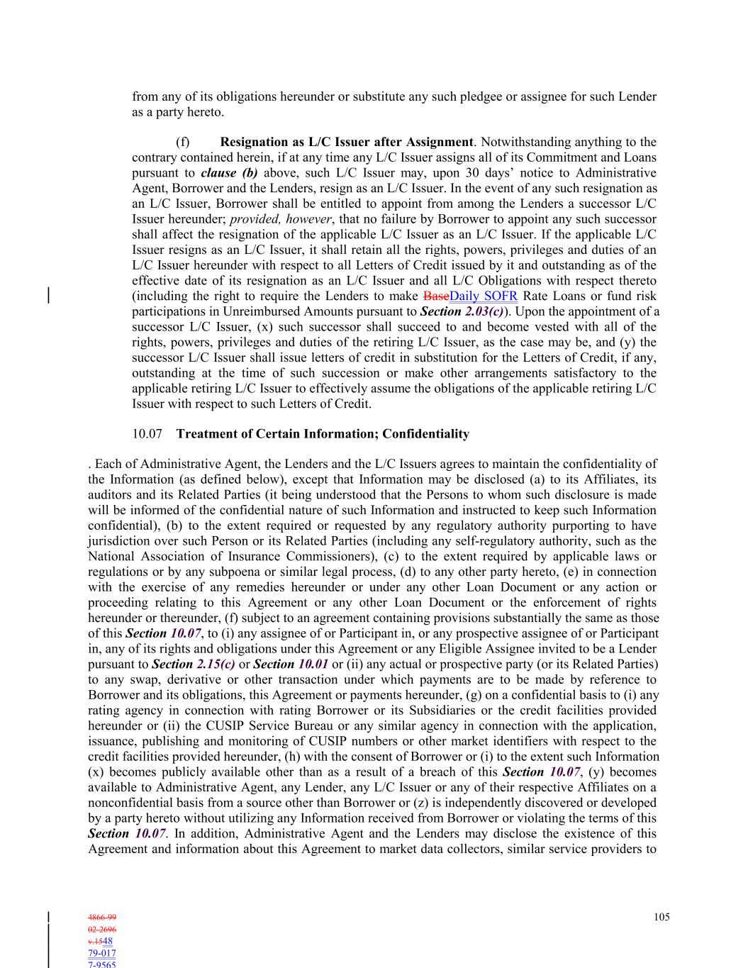 4866-99 02-2696 v.1548 79-017 7-9565 105 from any of its obligations hereunder or substitute any such pledgee or assignee for such Lender as a party hereto. (f) Resignation as L/C Issuer after Assignment. Notwithstanding anything to the contrary contained herein, if at any time any L/C Issuer assigns all of its Commitment and Loans pursuant to clause (b) above, such L/C Issuer may, upon 30 days’ notice to Administrative Agent, Borrower and the Lenders, resign as an L/C Issuer. In the event of any such resignation as an L/C Issuer, Borrower shall be entitled to appoint from among the Lenders a successor L/C Issuer hereunder; provided, however, that no failure by Borrower to appoint any such successor shall affect the resignation of the applicable L/C Issuer as an L/C Issuer. If the applicable L/C Issuer resigns as an L/C Issuer, it shall retain all the rights, powers, privileges and duties of an L/C Issuer hereunder with respect to all Letters of Credit issued by it and outstanding as of the effective date of its resignation as an L/C Issuer and all L/C Obligations with respect thereto (including the right to require the Lenders to make BaseDaily SOFR Rate Loans or fund risk participations in Unreimbursed Amounts pursuant to Section 2.03(c)). Upon the appointment of a successor L/C Issuer, (x) such successor shall succeed to and become vested with all of the rights, powers, privileges and duties of the retiring L/C Issuer, as the case may be, and (y) the successor L/C Issuer shall issue letters of credit in substitution for the Letters of Credit, if any, outstanding at the time of such succession or make other arrangements satisfactory to the applicable retiring L/C Issuer to effectively assume the obligations of the applicable retiring L/C Issuer with respect to such Letters of Credit. 10.07 Treatment of Certain Information; Confidentiality . Each of Administrative Agent, the Lenders and the L/C Issuers agrees to maintain the confidentiality of the Information (as defined below), except that Information may be disclosed (a) to its Affiliates, its auditors and its Related Parties (it being understood that the Persons to whom such disclosure is made will be informed of the confidential nature of such Information and instructed to keep such Information confidential), (b) to the extent required or requested by any regulatory authority purporting to have jurisdiction over such Person or its Related Parties (including any self-regulatory authority, such as the National Association of Insurance Commissioners), (c) to the extent required by applicable laws or regulations or by any subpoena or similar legal process, (d) to any other party hereto, (e) in connection with the exercise of any remedies hereunder or under any other Loan Document or any action or proceeding relating to this Agreement or any other Loan Document or the enforcement of rights hereunder or thereunder, (f) subject to an agreement containing provisions substantially the same as those of this Section 10.07, to (i) any assignee of or Participant in, or any prospective assignee of or Participant in, any of its rights and obligations under this Agreement or any Eligible Assignee invited to be a Lender pursuant to Section 2.15(c) or Section 10.01 or (ii) any actual or prospective party (or its Related Parties) to any swap, derivative or other transaction under which payments are to be made by reference to Borrower and its obligations, this Agreement or payments hereunder, (g) on a confidential basis to (i) any rating agency in connection with rating Borrower or its Subsidiaries or the credit facilities provided hereunder or (ii) the CUSIP Service Bureau or any similar agency in connection with the application, issuance, publishing and monitoring of CUSIP numbers or other market identifiers with respect to the credit facilities provided hereunder, (h) with the consent of Borrower or (i) to the extent such Information (x) becomes publicly available other than as a result of a breach of this Section 10.07, (y) becomes available to Administrative Agent, any Lender, any L/C Issuer or any of their respective Affiliates on a nonconfidential basis from a source other than Borrower or (z) is independently discovered or developed by a party hereto without utilizing any Information received from Borrower or violating the terms of this Section 10.07. In addition, Administrative Agent and the Lenders may disclose the existence of this Agreement and information about this Agreement to market data collectors, similar service providers to