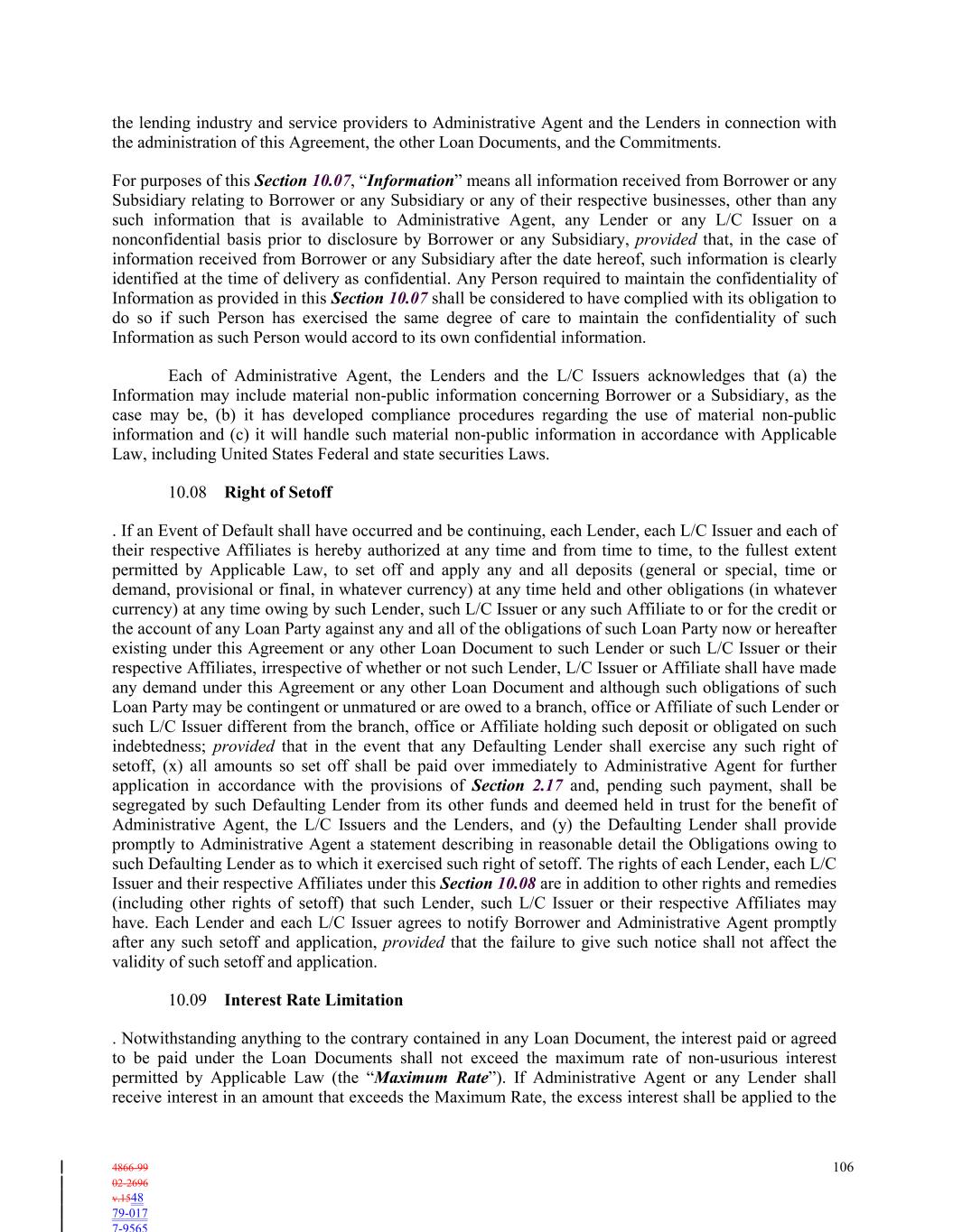 4866-99 02-2696 v.1548 79-017 7-9565 106 the lending industry and service providers to Administrative Agent and the Lenders in connection with the administration of this Agreement, the other Loan Documents, and the Commitments. For purposes of this Section 10.07, “Information” means all information received from Borrower or any Subsidiary relating to Borrower or any Subsidiary or any of their respective businesses, other than any such information that is available to Administrative Agent, any Lender or any L/C Issuer on a nonconfidential basis prior to disclosure by Borrower or any Subsidiary, provided that, in the case of information received from Borrower or any Subsidiary after the date hereof, such information is clearly identified at the time of delivery as confidential. Any Person required to maintain the confidentiality of Information as provided in this Section 10.07 shall be considered to have complied with its obligation to do so if such Person has exercised the same degree of care to maintain the confidentiality of such Information as such Person would accord to its own confidential information. Each of Administrative Agent, the Lenders and the L/C Issuers acknowledges that (a) the Information may include material non-public information concerning Borrower or a Subsidiary, as the case may be, (b) it has developed compliance procedures regarding the use of material non-public information and (c) it will handle such material non-public information in accordance with Applicable Law, including United States Federal and state securities Laws. 10.08 Right of Setoff . If an Event of Default shall have occurred and be continuing, each Lender, each L/C Issuer and each of their respective Affiliates is hereby authorized at any time and from time to time, to the fullest extent permitted by Applicable Law, to set off and apply any and all deposits (general or special, time or demand, provisional or final, in whatever currency) at any time held and other obligations (in whatever currency) at any time owing by such Lender, such L/C Issuer or any such Affiliate to or for the credit or the account of any Loan Party against any and all of the obligations of such Loan Party now or hereafter existing under this Agreement or any other Loan Document to such Lender or such L/C Issuer or their respective Affiliates, irrespective of whether or not such Lender, L/C Issuer or Affiliate shall have made any demand under this Agreement or any other Loan Document and although such obligations of such Loan Party may be contingent or unmatured or are owed to a branch, office or Affiliate of such Lender or such L/C Issuer different from the branch, office or Affiliate holding such deposit or obligated on such indebtedness; provided that in the event that any Defaulting Lender shall exercise any such right of setoff, (x) all amounts so set off shall be paid over immediately to Administrative Agent for further application in accordance with the provisions of Section 2.17 and, pending such payment, shall be segregated by such Defaulting Lender from its other funds and deemed held in trust for the benefit of Administrative Agent, the L/C Issuers and the Lenders, and (y) the Defaulting Lender shall provide promptly to Administrative Agent a statement describing in reasonable detail the Obligations owing to such Defaulting Lender as to which it exercised such right of setoff. The rights of each Lender, each L/C Issuer and their respective Affiliates under this Section 10.08 are in addition to other rights and remedies (including other rights of setoff) that such Lender, such L/C Issuer or their respective Affiliates may have. Each Lender and each L/C Issuer agrees to notify Borrower and Administrative Agent promptly after any such setoff and application, provided that the failure to give such notice shall not affect the validity of such setoff and application. 10.09 Interest Rate Limitation . Notwithstanding anything to the contrary contained in any Loan Document, the interest paid or agreed to be paid under the Loan Documents shall not exceed the maximum rate of non-usurious interest permitted by Applicable Law (the “Maximum Rate”). If Administrative Agent or any Lender shall receive interest in an amount that exceeds the Maximum Rate, the excess interest shall be applied to the