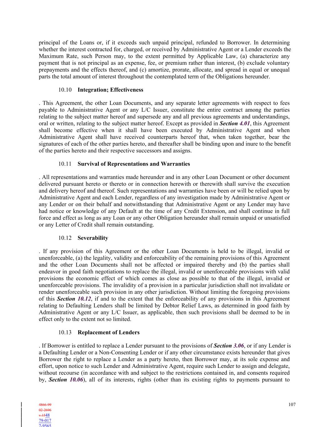 4866-99 02-2696 v.1548 79-017 7-9565 107 principal of the Loans or, if it exceeds such unpaid principal, refunded to Borrower. In determining whether the interest contracted for, charged, or received by Administrative Agent or a Lender exceeds the Maximum Rate, such Person may, to the extent permitted by Applicable Law, (a) characterize any payment that is not principal as an expense, fee, or premium rather than interest, (b) exclude voluntary prepayments and the effects thereof, and (c) amortize, prorate, allocate, and spread in equal or unequal parts the total amount of interest throughout the contemplated term of the Obligations hereunder. 10.10 Integration; Effectiveness . This Agreement, the other Loan Documents, and any separate letter agreements with respect to fees payable to Administrative Agent or any L/C Issuer, constitute the entire contract among the parties relating to the subject matter hereof and supersede any and all previous agreements and understandings, oral or written, relating to the subject matter hereof. Except as provided in Section 4.01, this Agreement shall become effective when it shall have been executed by Administrative Agent and when Administrative Agent shall have received counterparts hereof that, when taken together, bear the signatures of each of the other parties hereto, and thereafter shall be binding upon and inure to the benefit of the parties hereto and their respective successors and assigns. 10.11 Survival of Representations and Warranties . All representations and warranties made hereunder and in any other Loan Document or other document delivered pursuant hereto or thereto or in connection herewith or therewith shall survive the execution and delivery hereof and thereof. Such representations and warranties have been or will be relied upon by Administrative Agent and each Lender, regardless of any investigation made by Administrative Agent or any Lender or on their behalf and notwithstanding that Administrative Agent or any Lender may have had notice or knowledge of any Default at the time of any Credit Extension, and shall continue in full force and effect as long as any Loan or any other Obligation hereunder shall remain unpaid or unsatisfied or any Letter of Credit shall remain outstanding. 10.12 Severability . If any provision of this Agreement or the other Loan Documents is held to be illegal, invalid or unenforceable, (a) the legality, validity and enforceability of the remaining provisions of this Agreement and the other Loan Documents shall not be affected or impaired thereby and (b) the parties shall endeavor in good faith negotiations to replace the illegal, invalid or unenforceable provisions with valid provisions the economic effect of which comes as close as possible to that of the illegal, invalid or unenforceable provisions. The invalidity of a provision in a particular jurisdiction shall not invalidate or render unenforceable such provision in any other jurisdiction. Without limiting the foregoing provisions of this Section 10.12, if and to the extent that the enforceability of any provisions in this Agreement relating to Defaulting Lenders shall be limited by Debtor Relief Laws, as determined in good faith by Administrative Agent or any L/C Issuer, as applicable, then such provisions shall be deemed to be in effect only to the extent not so limited. 10.13 Replacement of Lenders . If Borrower is entitled to replace a Lender pursuant to the provisions of Section 3.06, or if any Lender is a Defaulting Lender or a Non-Consenting Lender or if any other circumstance exists hereunder that gives Borrower the right to replace a Lender as a party hereto, then Borrower may, at its sole expense and effort, upon notice to such Lender and Administrative Agent, require such Lender to assign and delegate, without recourse (in accordance with and subject to the restrictions contained in, and consents required by, Section 10.06), all of its interests, rights (other than its existing rights to payments pursuant to