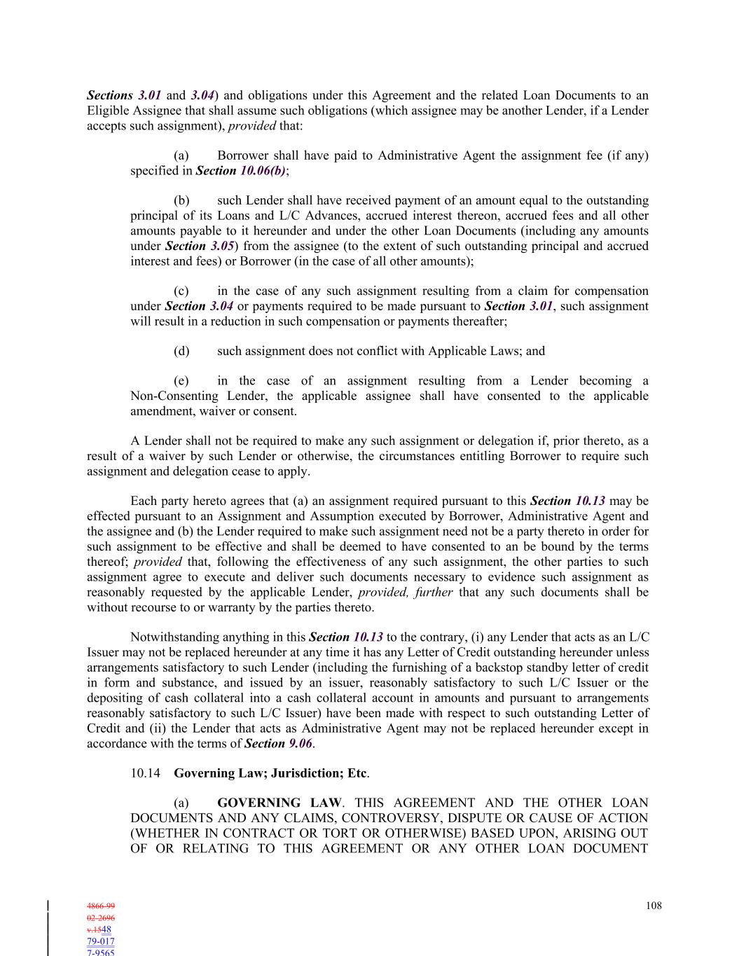 4866-99 02-2696 v.1548 79-017 7-9565 108 Sections 3.01 and 3.04) and obligations under this Agreement and the related Loan Documents to an Eligible Assignee that shall assume such obligations (which assignee may be another Lender, if a Lender accepts such assignment), provided that: (a) Borrower shall have paid to Administrative Agent the assignment fee (if any) specified in Section 10.06(b); (b) such Lender shall have received payment of an amount equal to the outstanding principal of its Loans and L/C Advances, accrued interest thereon, accrued fees and all other amounts payable to it hereunder and under the other Loan Documents (including any amounts under Section 3.05) from the assignee (to the extent of such outstanding principal and accrued interest and fees) or Borrower (in the case of all other amounts); (c) in the case of any such assignment resulting from a claim for compensation under Section 3.04 or payments required to be made pursuant to Section 3.01, such assignment will result in a reduction in such compensation or payments thereafter; (d) such assignment does not conflict with Applicable Laws; and (e) in the case of an assignment resulting from a Lender becoming a Non-Consenting Lender, the applicable assignee shall have consented to the applicable amendment, waiver or consent. A Lender shall not be required to make any such assignment or delegation if, prior thereto, as a result of a waiver by such Lender or otherwise, the circumstances entitling Borrower to require such assignment and delegation cease to apply. Each party hereto agrees that (a) an assignment required pursuant to this Section 10.13 may be effected pursuant to an Assignment and Assumption executed by Borrower, Administrative Agent and the assignee and (b) the Lender required to make such assignment need not be a party thereto in order for such assignment to be effective and shall be deemed to have consented to an be bound by the terms thereof; provided that, following the effectiveness of any such assignment, the other parties to such assignment agree to execute and deliver such documents necessary to evidence such assignment as reasonably requested by the applicable Lender, provided, further that any such documents shall be without recourse to or warranty by the parties thereto. Notwithstanding anything in this Section 10.13 to the contrary, (i) any Lender that acts as an L/C Issuer may not be replaced hereunder at any time it has any Letter of Credit outstanding hereunder unless arrangements satisfactory to such Lender (including the furnishing of a backstop standby letter of credit in form and substance, and issued by an issuer, reasonably satisfactory to such L/C Issuer or the depositing of cash collateral into a cash collateral account in amounts and pursuant to arrangements reasonably satisfactory to such L/C Issuer) have been made with respect to such outstanding Letter of Credit and (ii) the Lender that acts as Administrative Agent may not be replaced hereunder except in accordance with the terms of Section 9.06. 10.14 Governing Law; Jurisdiction; Etc. (a) GOVERNING LAW. THIS AGREEMENT AND THE OTHER LOAN DOCUMENTS AND ANY CLAIMS, CONTROVERSY, DISPUTE OR CAUSE OF ACTION (WHETHER IN CONTRACT OR TORT OR OTHERWISE) BASED UPON, ARISING OUT OF OR RELATING TO THIS AGREEMENT OR ANY OTHER LOAN DOCUMENT
