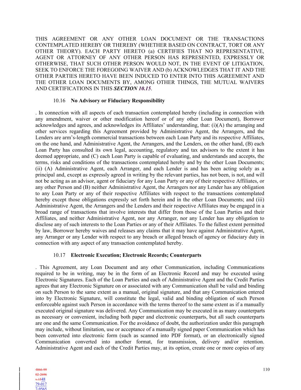 4866-99 02-2696 v.1548 79-017 7-9565 110 THIS AGREEMENT OR ANY OTHER LOAN DOCUMENT OR THE TRANSACTIONS CONTEMPLATED HEREBY OR THEREBY (WHETHER BASED ON CONTRACT, TORT OR ANY OTHER THEORY). EACH PARTY HERETO (a) CERTIFIES THAT NO REPRESENTATIVE, AGENT OR ATTORNEY OF ANY OTHER PERSON HAS REPRESENTED, EXPRESSLY OR OTHERWISE, THAT SUCH OTHER PERSON WOULD NOT, IN THE EVENT OF LITIGATION, SEEK TO ENFORCE THE FOREGOING WAIVER AND (b) ACKNOWLEDGES THAT IT AND THE OTHER PARTIES HERETO HAVE BEEN INDUCED TO ENTER INTO THIS AGREEMENT AND THE OTHER LOAN DOCUMENTS BY, AMONG OTHER THINGS, THE MUTUAL WAIVERS AND CERTIFICATIONS IN THIS SECTION 10.15. 10.16 No Advisory or Fiduciary Responsibility . In connection with all aspects of each transaction contemplated hereby (including in connection with any amendment, waiver or other modification hereof or of any other Loan Document), Borrower acknowledges and agrees, and acknowledges its Affiliates’ understanding, that: (i)(A) the arranging and other services regarding this Agreement provided by Administrative Agent, the Arrangers, and the Lenders are arm’s-length commercial transactions between each Loan Party and its respective Affiliates, on the one hand, and Administrative Agent, the Arrangers, and the Lenders, on the other hand, (B) each Loan Party has consulted its own legal, accounting, regulatory and tax advisors to the extent it has deemed appropriate, and (C) each Loan Party is capable of evaluating, and understands and accepts, the terms, risks and conditions of the transactions contemplated hereby and by the other Loan Documents; (ii) (A) Administrative Agent, each Arranger, and each Lender is and has been acting solely as a principal and, except as expressly agreed in writing by the relevant parties, has not been, is not, and will not be acting as an advisor, agent or fiduciary for any Loan Party or any of their respective Affiliates, or any other Person and (B) neither Administrative Agent, the Arrangers nor any Lender has any obligation to any Loan Party or any of their respective Affiliates with respect to the transactions contemplated hereby except those obligations expressly set forth herein and in the other Loan Documents; and (iii) Administrative Agent, the Arrangers and the Lenders and their respective Affiliates may be engaged in a broad range of transactions that involve interests that differ from those of the Loan Parties and their Affiliates, and neither Administrative Agent, nor any Arranger, nor any Lender has any obligation to disclose any of such interests to the Loan Parties or any of their Affiliates. To the fullest extent permitted by law, Borrower hereby waives and releases any claims that it may have against Administrative Agent, any Arranger or any Lender with respect to any breach or alleged breach of agency or fiduciary duty in connection with any aspect of any transaction contemplated hereby. 10.17 Electronic Execution; Electronic Records; Counterparts . This Agreement, any Loan Document and any other Communication, including Communications required to be in writing, may be in the form of an Electronic Record and may be executed using Electronic Signatures. Each of the Loan Parties and each of Administrative Agent and the Credit Parties agrees that any Electronic Signature on or associated with any Communication shall be valid and binding on such Person to the same extent as a manual, original signature, and that any Communication entered into by Electronic Signature, will constitute the legal, valid and binding obligation of such Person enforceable against such Person in accordance with the terms thereof to the same extent as if a manually executed original signature was delivered. Any Communication may be executed in as many counterparts as necessary or convenient, including both paper and electronic counterparts, but all such counterparts are one and the same Communication. For the avoidance of doubt, the authorization under this paragraph may include, without limitation, use or acceptance of a manually signed paper Communication which has been converted into electronic form (such as scanned into PDF format), or an electronically signed Communication converted into another format, for transmission, delivery and/or retention. Administrative Agent and each of the Credit Parties may, at its option, create one or more copies of any