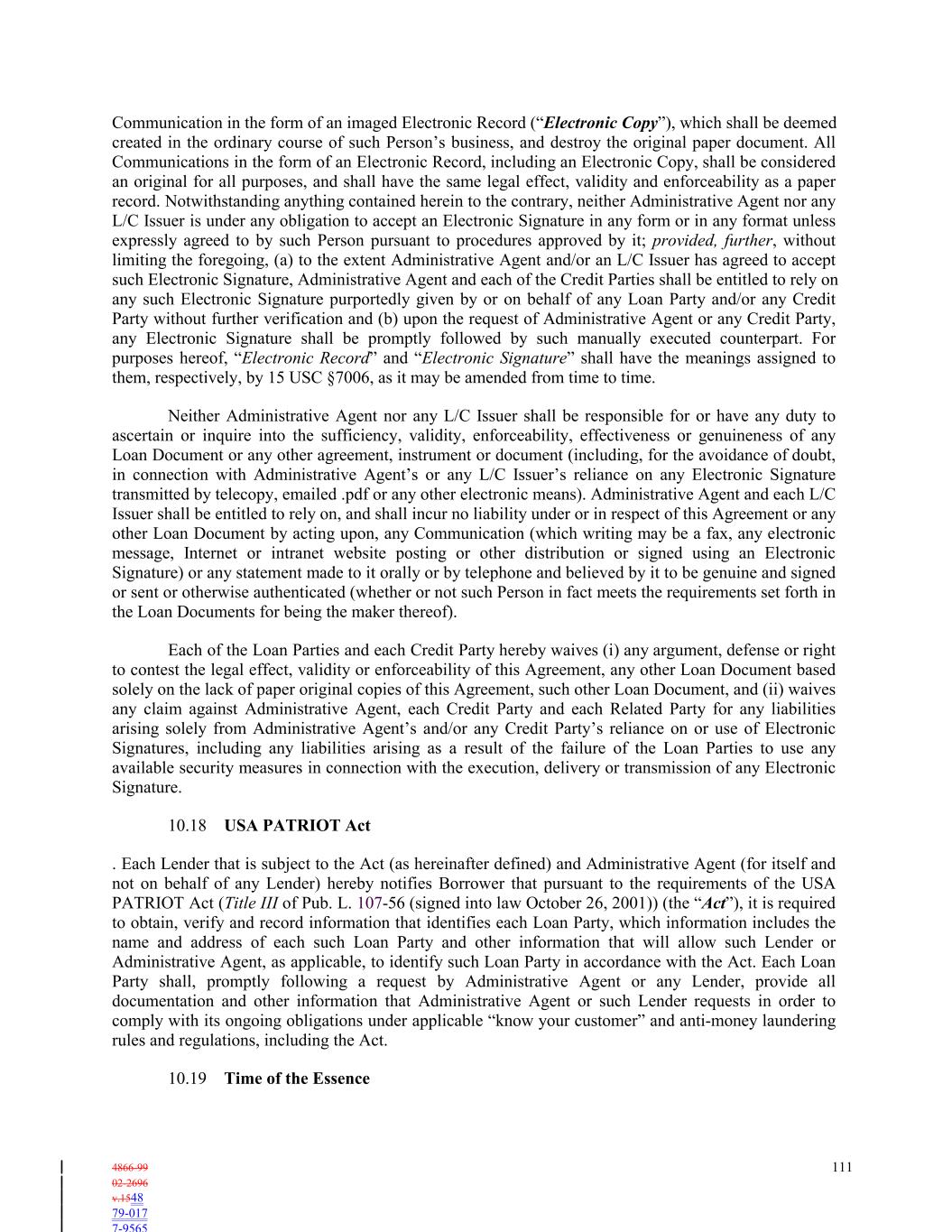 4866-99 02-2696 v.1548 79-017 7-9565 111 Communication in the form of an imaged Electronic Record (“Electronic Copy”), which shall be deemed created in the ordinary course of such Person’s business, and destroy the original paper document. All Communications in the form of an Electronic Record, including an Electronic Copy, shall be considered an original for all purposes, and shall have the same legal effect, validity and enforceability as a paper record. Notwithstanding anything contained herein to the contrary, neither Administrative Agent nor any L/C Issuer is under any obligation to accept an Electronic Signature in any form or in any format unless expressly agreed to by such Person pursuant to procedures approved by it; provided, further, without limiting the foregoing, (a) to the extent Administrative Agent and/or an L/C Issuer has agreed to accept such Electronic Signature, Administrative Agent and each of the Credit Parties shall be entitled to rely on any such Electronic Signature purportedly given by or on behalf of any Loan Party and/or any Credit Party without further verification and (b) upon the request of Administrative Agent or any Credit Party, any Electronic Signature shall be promptly followed by such manually executed counterpart. For purposes hereof, “Electronic Record” and “Electronic Signature” shall have the meanings assigned to them, respectively, by 15 USC §7006, as it may be amended from time to time. Neither Administrative Agent nor any L/C Issuer shall be responsible for or have any duty to ascertain or inquire into the sufficiency, validity, enforceability, effectiveness or genuineness of any Loan Document or any other agreement, instrument or document (including, for the avoidance of doubt, in connection with Administrative Agent’s or any L/C Issuer’s reliance on any Electronic Signature transmitted by telecopy, emailed .pdf or any other electronic means). Administrative Agent and each L/C Issuer shall be entitled to rely on, and shall incur no liability under or in respect of this Agreement or any other Loan Document by acting upon, any Communication (which writing may be a fax, any electronic message, Internet or intranet website posting or other distribution or signed using an Electronic Signature) or any statement made to it orally or by telephone and believed by it to be genuine and signed or sent or otherwise authenticated (whether or not such Person in fact meets the requirements set forth in the Loan Documents for being the maker thereof). Each of the Loan Parties and each Credit Party hereby waives (i) any argument, defense or right to contest the legal effect, validity or enforceability of this Agreement, any other Loan Document based solely on the lack of paper original copies of this Agreement, such other Loan Document, and (ii) waives any claim against Administrative Agent, each Credit Party and each Related Party for any liabilities arising solely from Administrative Agent’s and/or any Credit Party’s reliance on or use of Electronic Signatures, including any liabilities arising as a result of the failure of the Loan Parties to use any available security measures in connection with the execution, delivery or transmission of any Electronic Signature. 10.18 USA PATRIOT Act . Each Lender that is subject to the Act (as hereinafter defined) and Administrative Agent (for itself and not on behalf of any Lender) hereby notifies Borrower that pursuant to the requirements of the USA PATRIOT Act (Title III of Pub. L. 107-56 (signed into law October 26, 2001)) (the “Act”), it is required to obtain, verify and record information that identifies each Loan Party, which information includes the name and address of each such Loan Party and other information that will allow such Lender or Administrative Agent, as applicable, to identify such Loan Party in accordance with the Act. Each Loan Party shall, promptly following a request by Administrative Agent or any Lender, provide all documentation and other information that Administrative Agent or such Lender requests in order to comply with its ongoing obligations under applicable “know your customer” and anti-money laundering rules and regulations, including the Act. 10.19 Time of the Essence
