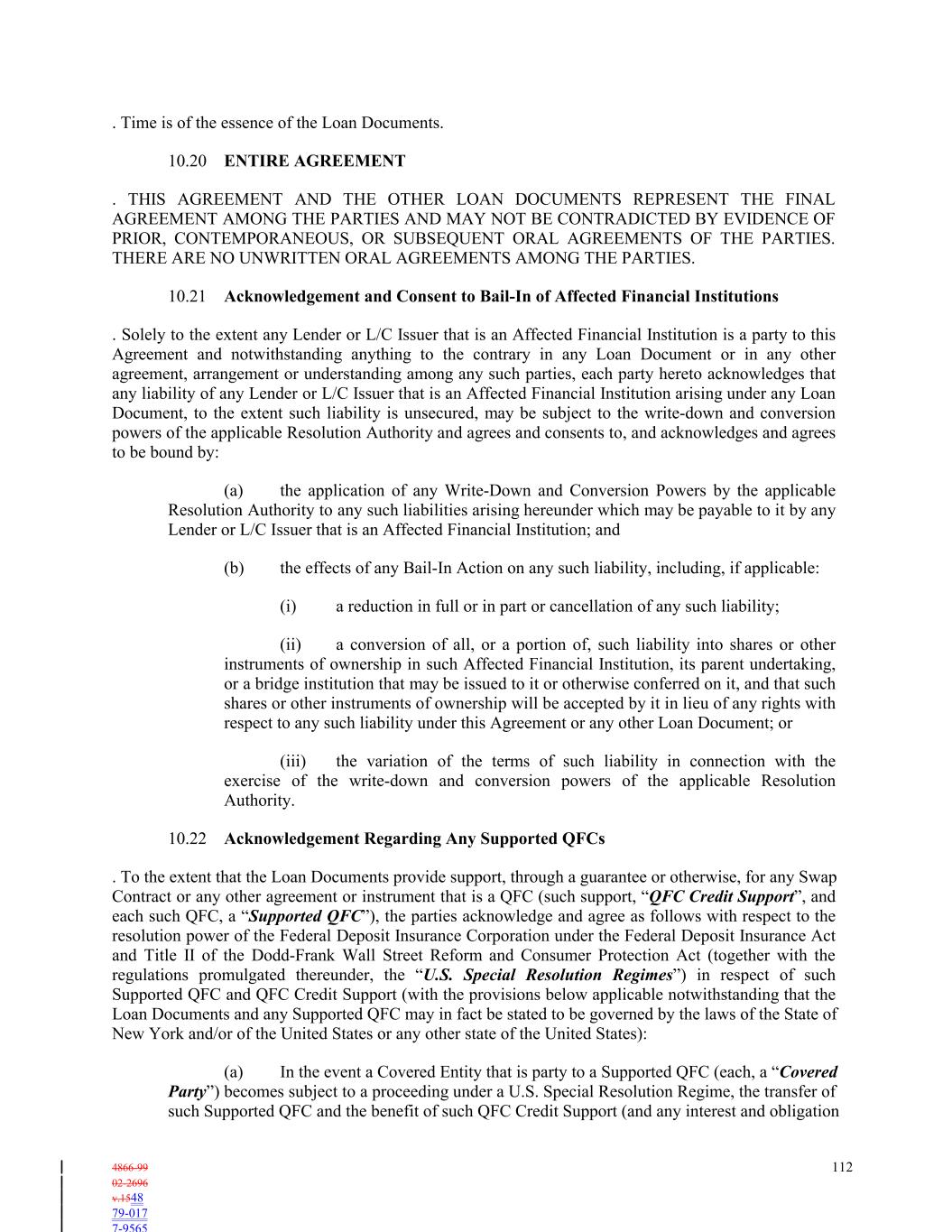 4866-99 02-2696 v.1548 79-017 7-9565 112 . Time is of the essence of the Loan Documents. 10.20 ENTIRE AGREEMENT . THIS AGREEMENT AND THE OTHER LOAN DOCUMENTS REPRESENT THE FINAL AGREEMENT AMONG THE PARTIES AND MAY NOT BE CONTRADICTED BY EVIDENCE OF PRIOR, CONTEMPORANEOUS, OR SUBSEQUENT ORAL AGREEMENTS OF THE PARTIES. THERE ARE NO UNWRITTEN ORAL AGREEMENTS AMONG THE PARTIES. 10.21 Acknowledgement and Consent to Bail-In of Affected Financial Institutions . Solely to the extent any Lender or L/C Issuer that is an Affected Financial Institution is a party to this Agreement and notwithstanding anything to the contrary in any Loan Document or in any other agreement, arrangement or understanding among any such parties, each party hereto acknowledges that any liability of any Lender or L/C Issuer that is an Affected Financial Institution arising under any Loan Document, to the extent such liability is unsecured, may be subject to the write-down and conversion powers of the applicable Resolution Authority and agrees and consents to, and acknowledges and agrees to be bound by: (a) the application of any Write-Down and Conversion Powers by the applicable Resolution Authority to any such liabilities arising hereunder which may be payable to it by any Lender or L/C Issuer that is an Affected Financial Institution; and (b) the effects of any Bail-In Action on any such liability, including, if applicable: (i) a reduction in full or in part or cancellation of any such liability; (ii) a conversion of all, or a portion of, such liability into shares or other instruments of ownership in such Affected Financial Institution, its parent undertaking, or a bridge institution that may be issued to it or otherwise conferred on it, and that such shares or other instruments of ownership will be accepted by it in lieu of any rights with respect to any such liability under this Agreement or any other Loan Document; or (iii) the variation of the terms of such liability in connection with the exercise of the write-down and conversion powers of the applicable Resolution Authority. 10.22 Acknowledgement Regarding Any Supported QFCs . To the extent that the Loan Documents provide support, through a guarantee or otherwise, for any Swap Contract or any other agreement or instrument that is a QFC (such support, “QFC Credit Support”, and each such QFC, a “Supported QFC”), the parties acknowledge and agree as follows with respect to the resolution power of the Federal Deposit Insurance Corporation under the Federal Deposit Insurance Act and Title II of the Dodd-Frank Wall Street Reform and Consumer Protection Act (together with the regulations promulgated thereunder, the “U.S. Special Resolution Regimes”) in respect of such Supported QFC and QFC Credit Support (with the provisions below applicable notwithstanding that the Loan Documents and any Supported QFC may in fact be stated to be governed by the laws of the State of New York and/or of the United States or any other state of the United States): (a) In the event a Covered Entity that is party to a Supported QFC (each, a “Covered Party”) becomes subject to a proceeding under a U.S. Special Resolution Regime, the transfer of such Supported QFC and the benefit of such QFC Credit Support (and any interest and obligation