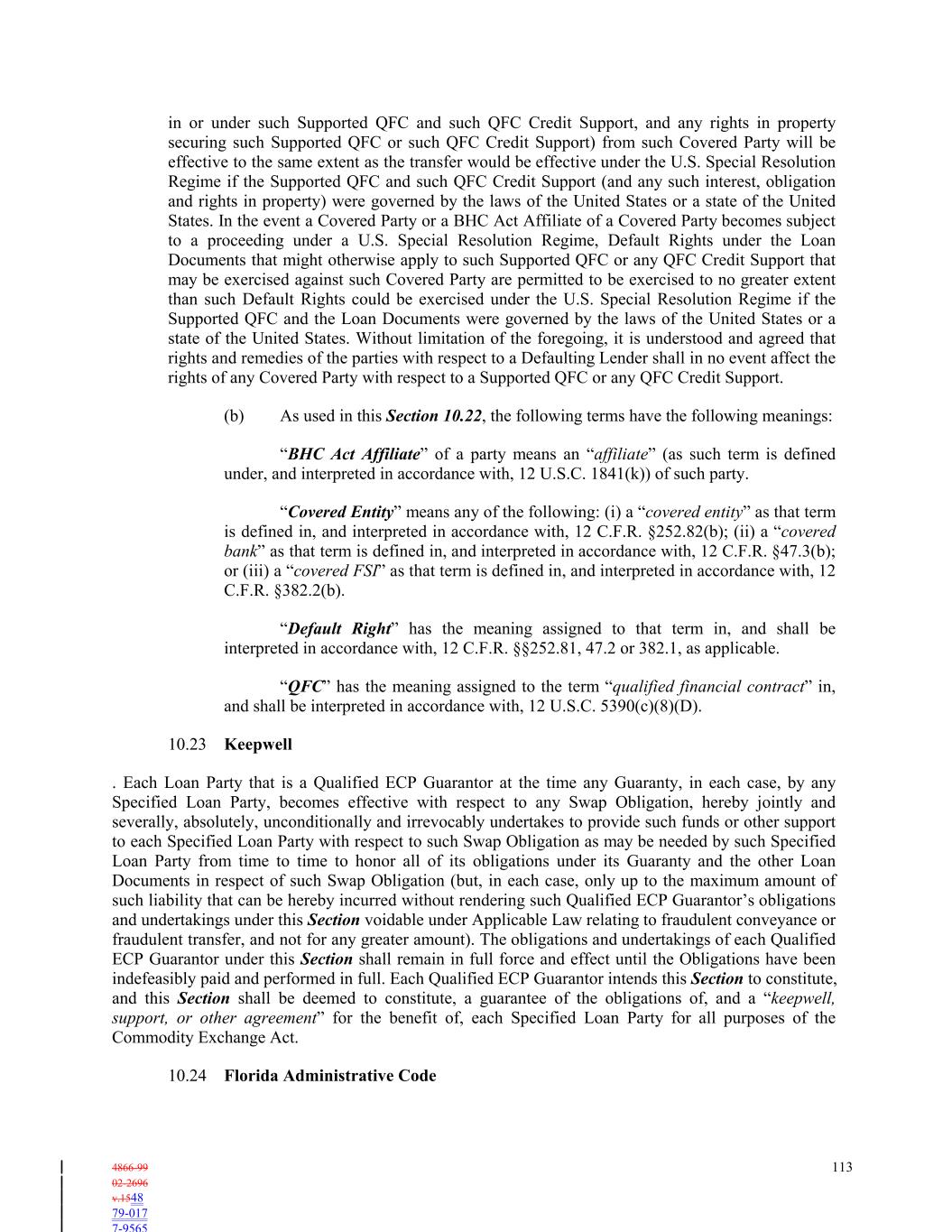 4866-99 02-2696 v.1548 79-017 7-9565 113 in or under such Supported QFC and such QFC Credit Support, and any rights in property securing such Supported QFC or such QFC Credit Support) from such Covered Party will be effective to the same extent as the transfer would be effective under the U.S. Special Resolution Regime if the Supported QFC and such QFC Credit Support (and any such interest, obligation and rights in property) were governed by the laws of the United States or a state of the United States. In the event a Covered Party or a BHC Act Affiliate of a Covered Party becomes subject to a proceeding under a U.S. Special Resolution Regime, Default Rights under the Loan Documents that might otherwise apply to such Supported QFC or any QFC Credit Support that may be exercised against such Covered Party are permitted to be exercised to no greater extent than such Default Rights could be exercised under the U.S. Special Resolution Regime if the Supported QFC and the Loan Documents were governed by the laws of the United States or a state of the United States. Without limitation of the foregoing, it is understood and agreed that rights and remedies of the parties with respect to a Defaulting Lender shall in no event affect the rights of any Covered Party with respect to a Supported QFC or any QFC Credit Support. (b) As used in this Section 10.22, the following terms have the following meanings: “BHC Act Affiliate” of a party means an “affiliate” (as such term is defined under, and interpreted in accordance with, 12 U.S.C. 1841(k)) of such party. “Covered Entity” means any of the following: (i) a “covered entity” as that term is defined in, and interpreted in accordance with, 12 C.F.R. §252.82(b); (ii) a “covered bank” as that term is defined in, and interpreted in accordance with, 12 C.F.R. §47.3(b); or (iii) a “covered FSI” as that term is defined in, and interpreted in accordance with, 12 C.F.R. §382.2(b). “Default Right” has the meaning assigned to that term in, and shall be interpreted in accordance with, 12 C.F.R. §§252.81, 47.2 or 382.1, as applicable. “QFC” has the meaning assigned to the term “qualified financial contract” in, and shall be interpreted in accordance with, 12 U.S.C. 5390(c)(8)(D). 10.23 Keepwell . Each Loan Party that is a Qualified ECP Guarantor at the time any Guaranty, in each case, by any Specified Loan Party, becomes effective with respect to any Swap Obligation, hereby jointly and severally, absolutely, unconditionally and irrevocably undertakes to provide such funds or other support to each Specified Loan Party with respect to such Swap Obligation as may be needed by such Specified Loan Party from time to time to honor all of its obligations under its Guaranty and the other Loan Documents in respect of such Swap Obligation (but, in each case, only up to the maximum amount of such liability that can be hereby incurred without rendering such Qualified ECP Guarantor’s obligations and undertakings under this Section voidable under Applicable Law relating to fraudulent conveyance or fraudulent transfer, and not for any greater amount). The obligations and undertakings of each Qualified ECP Guarantor under this Section shall remain in full force and effect until the Obligations have been indefeasibly paid and performed in full. Each Qualified ECP Guarantor intends this Section to constitute, and this Section shall be deemed to constitute, a guarantee of the obligations of, and a “keepwell, support, or other agreement” for the benefit of, each Specified Loan Party for all purposes of the Commodity Exchange Act. 10.24 Florida Administrative Code