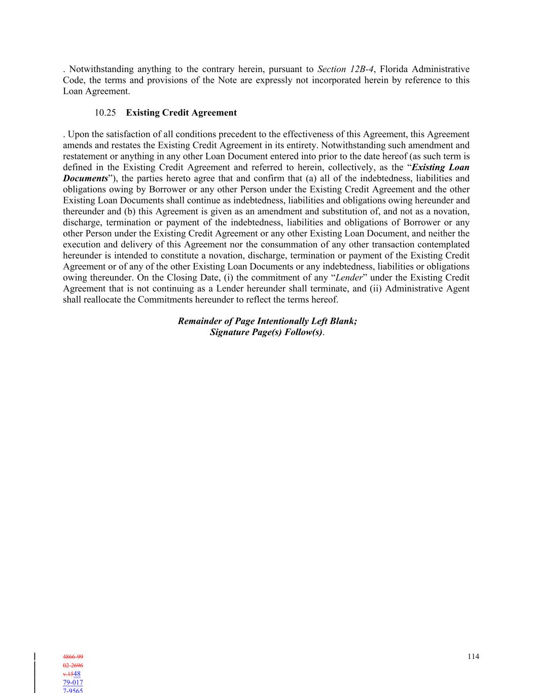 4866-99 02-2696 v.1548 79-017 7-9565 114 . Notwithstanding anything to the contrary herein, pursuant to Section 12B-4, Florida Administrative Code, the terms and provisions of the Note are expressly not incorporated herein by reference to this Loan Agreement. 10.25 Existing Credit Agreement . Upon the satisfaction of all conditions precedent to the effectiveness of this Agreement, this Agreement amends and restates the Existing Credit Agreement in its entirety. Notwithstanding such amendment and restatement or anything in any other Loan Document entered into prior to the date hereof (as such term is defined in the Existing Credit Agreement and referred to herein, collectively, as the “Existing Loan Documents”), the parties hereto agree that and confirm that (a) all of the indebtedness, liabilities and obligations owing by Borrower or any other Person under the Existing Credit Agreement and the other Existing Loan Documents shall continue as indebtedness, liabilities and obligations owing hereunder and thereunder and (b) this Agreement is given as an amendment and substitution of, and not as a novation, discharge, termination or payment of the indebtedness, liabilities and obligations of Borrower or any other Person under the Existing Credit Agreement or any other Existing Loan Document, and neither the execution and delivery of this Agreement nor the consummation of any other transaction contemplated hereunder is intended to constitute a novation, discharge, termination or payment of the Existing Credit Agreement or of any of the other Existing Loan Documents or any indebtedness, liabilities or obligations owing thereunder. On the Closing Date, (i) the commitment of any “Lender” under the Existing Credit Agreement that is not continuing as a Lender hereunder shall terminate, and (ii) Administrative Agent shall reallocate the Commitments hereunder to reflect the terms hereof. Remainder of Page Intentionally Left Blank; Signature Page(s) Follow(s).
