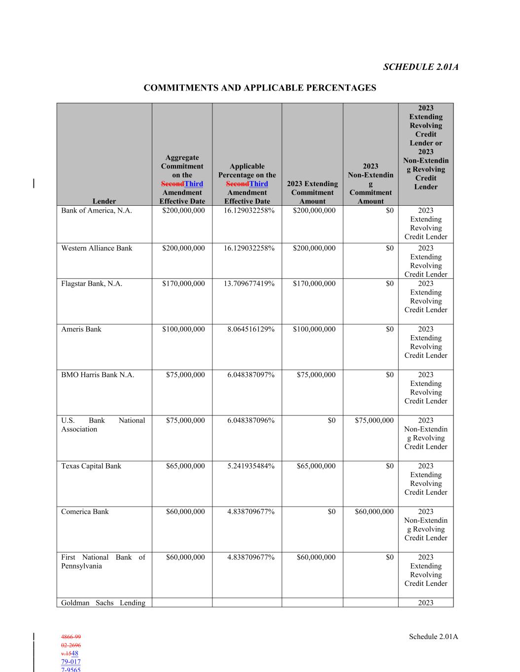 4866-99 02-2696 v.1548 79-017 7-9565 Schedule 2.01A $75,000,000 16.129032258% 6.048387097% $75,000,000 $200,000,000 $0 Aggregate Commitment on the SecondThird Amendment Effective Date 2023 Extending Revolving Credit Lender $0 Bank of America, N.A. U.S. Bank National Association 2023 Extending Revolving Credit Lender $75,000,000 SCHEDULE 2.01A COMMITMENTS AND APPLICABLE PERCENTAGES 6.048387096% $0 $200,000,000 $75,000,000 Flagstar Bank, N.A. 2023 Non-Extendin g Revolving Credit Lender Applicable Percentage on the SecondThird Amendment Effective Date $170,000,000 Texas Capital Bank 16.129032258% $65,000,000 13.709677419% 5.241935484% $65,000,000 $170,000,000 $0 $200,000,000 2023 Extending Revolving Credit Lender $0 2023 Extending Commitment Amount Comerica Bank 2023 Extending Revolving Credit Lender $60,000,000 $0 4.838709677% $0 $60,000,000 Ameris Bank 2023 Non-Extendin g Revolving Credit Lender 2023 Extending Revolving Credit Lender $100,000,000 First National Bank of Pennsylvania 2023 Non-Extendin g Commitment Amount $60,000,000 8.064516129% 4.838709677% $60,000,000 $100,000,000 $0 Lender 2023 Extending Revolving Credit Lender $0 Western Alliance Bank Goldman Sachs Lending 2023 Extending Revolving Credit Lender 2023 2023 Extending Revolving Credit Lender or 2023 Non-Extendin g Revolving Credit Lender $200,000,000 BMO Harris Bank N.A.
