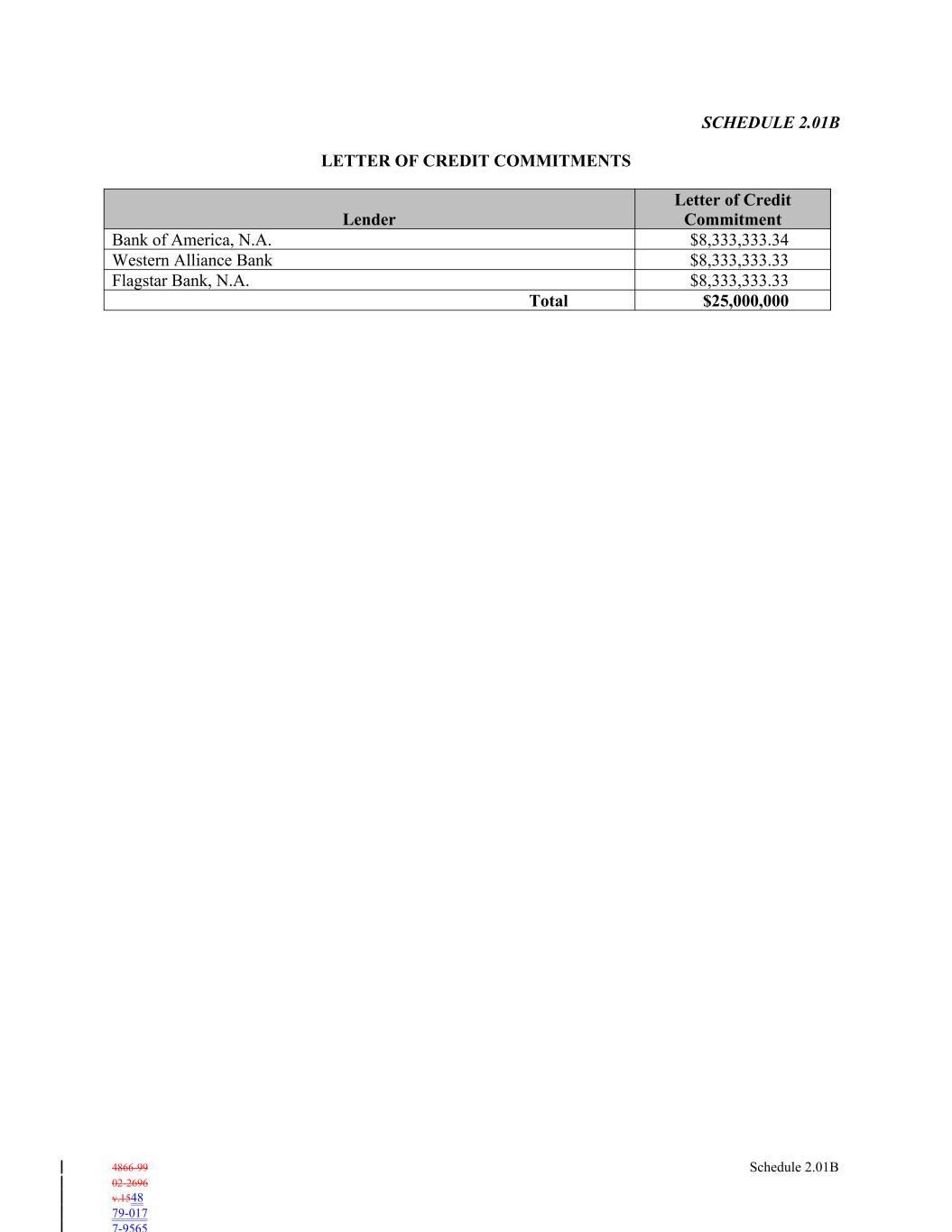 4866-99 02-2696 v.1548 79-017 7-9565 Schedule 2.01B Flagstar Bank, N.A. $8,333,333.33 Bank of America, N.A. Total $8,333,333.34 $25,000,000 Lender Western Alliance Bank Letter of Credit Commitment $8,333,333.33 SCHEDULE 2.01B LETTER OF CREDIT COMMITMENTS