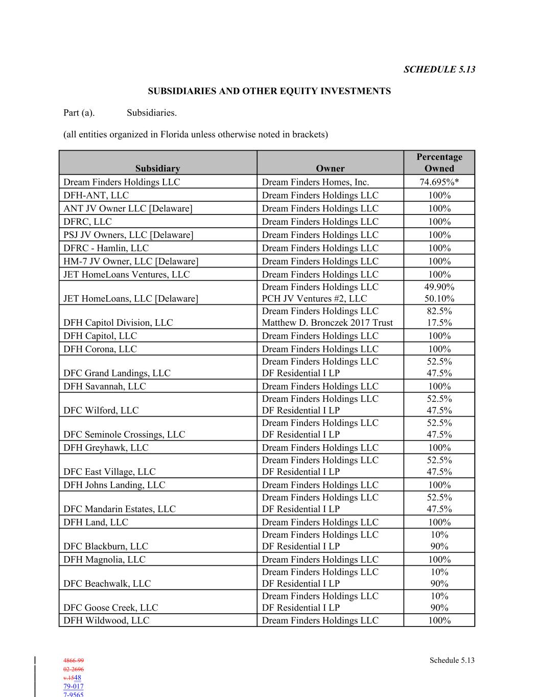 4866-99 02-2696 v.1548 79-017 7-9565 Schedule 5.13 100% 52.5% 47.5% Dream Finders Holdings LLC DFH Savannah, LLC 100% Dream Finders Holdings LLC 100% DFC Wilford, LLC HM-7 JV Owner, LLC [Delaware] Dream Finders Holdings LLC DF Residential I LP ANT JV Owner LLC [Delaware] 52.5% 47.5% Dream Finders Holdings LLC Dream Finders Holdings LLC DFC Seminole Crossings, LLC 100% Dream Finders Holdings LLC DF Residential I LP Dream Finders Holdings LLC 52.5% 47.5% Subsidiary DFH Greyhawk, LLC JET HomeLoans Ventures, LLC Dream Finders Holdings LLC 100% 100% Dream Finders Holdings LLC Dream Finders Homes, Inc. DFC East Village, LLC 100% Dream Finders Holdings LLC DF Residential I LP 52.5% 47.5% DFH Johns Landing, LLC JET HomeLoans, LLC [Delaware] Dream Finders Holdings LLC DFRC, LLC 100% Dream Finders Holdings LLC PCH JV Ventures #2, LLC 74.695%* DFC Mandarin Estates, LLC 49.90% 50.10% Dream Finders Holdings LLC DF Residential I LP Dream Finders Holdings LLC 52.5% 47.5% Owner DFH Land, LLC DFH Capitol Division, LLC Dream Finders Holdings LLC 100% 100% Dream Finders Holdings LLC Matthew D. Bronczek 2017 Trust DFC Blackburn, LLC 82.5% 17.5% Dream Finders Holdings LLC DF Residential I LP 10% 90% SCHEDULE 5.13 SUBSIDIARIES AND OTHER EQUITY INVESTMENTS Part (a). Subsidiaries. (all entities organized in Florida unless otherwise noted in brackets) DFH Magnolia, LLC DFH Capitol, LLC Dream Finders Holdings LLC PSJ JV Owners, LLC [Delaware] 100% Dream Finders Holdings LLC DFH-ANT, LLC DFC Beachwalk, LLC 100% Dream Finders Holdings LLC DF Residential I LP Dream Finders Holdings LLC 10% 90% Percentage Owned DFC Goose Creek, LLC DFH Corona, LLC Dream Finders Holdings LLC DF Residential I LP 100% 10% 90% Dream Finders Holdings LLC Dream Finders Holdings LLC DFH Wildwood, LLC 100% Dream Finders Holdings LLC 100% DFC Grand Landings, LLC DFRC - Hamlin, LLC Dream Finders Holdings LLC DF Residential I LP