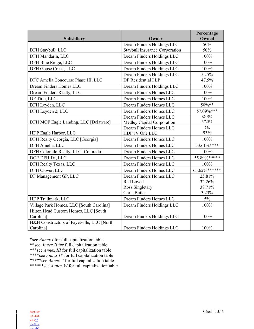4866-99 02-2696 v.1548 79-017 7-9565 Schedule 5.13 7% 93% 100% Dream Finders Homes LLC DFH Realty Georgia, LLC [Georgia] Subsidiary Dream Finders Homes LLC Dream Finders Holdings LLC 100% 100% DFH Amelia, LLC DFH Staybull, LLC Dream Finders Homes LLC 53.61%**** DFH Blue Ridge, LLC Dream Finders Realty, LLC DFH Colorado Realty, LLC [Colorado] Dream Finders Homes LLC Dream Finders Homes LLC 100% Dream Finders Holdings LLC 100% DCE DFH JV, LLC Dream Finders Holdings LLC Staybull Insurance Corporation Dream Finders Homes LLC 55.89%***** 100% DF Title, LLC DFH Realty Texas, LLC Owner Dream Finders Homes LLC Dream Finders Homes LLC 100% 100% DFH Clover, LLC 50% 50% Dream Finders Homes LLC 63.62%****** DFH Goose Creek, LLC DFH Leyden, LLC DF Management GP, LLC Dream Finders Homes LLC Rad Lovett Ross Singletary Chris Butler Dream Finders Homes LLC 25.81% 32.26% 38.71% 3.23% Dream Finders Holdings LLC 50%** HDP Trailmark, LLC Dream Finders Homes LLC 5% 100% DFH Leyden 2, LLC Village Park Homes, LLC [South Carolina] Percentage Owned Dream Finders Holdings LLC Dream Finders Homes LLC 100% 57.09%*** Hilton Head Custom Homes, LLC [South Carolina] DFH Mandarin, LLC Dream Finders Holdings LLC 100% DFC Amelia Concourse Phase III, LLC DFH MOF Eagle Landing, LLC [Delaware] H&H Constructors of Fayetville, LLC [North Carolina] Dream Finders Holdings LLC Dream Finders Homes LLC Medley Capital Corporation 100% Dream Finders Holdings LLC DF Residential I LP 62.5% 37.5% Dream Finders Holdings LLC 52.5% 47.5% *see Annex I for full capitalization table **see Annex II for full capitalization table ***see Annex III for full capitalization table ****see Annex IV for full capitalization table *****see Annex V for full capitalization table ******see Annex VI for full capitalization table HDP Eagle Harbor, LLC Dream Finders Homes LLC HDP JV One LLC