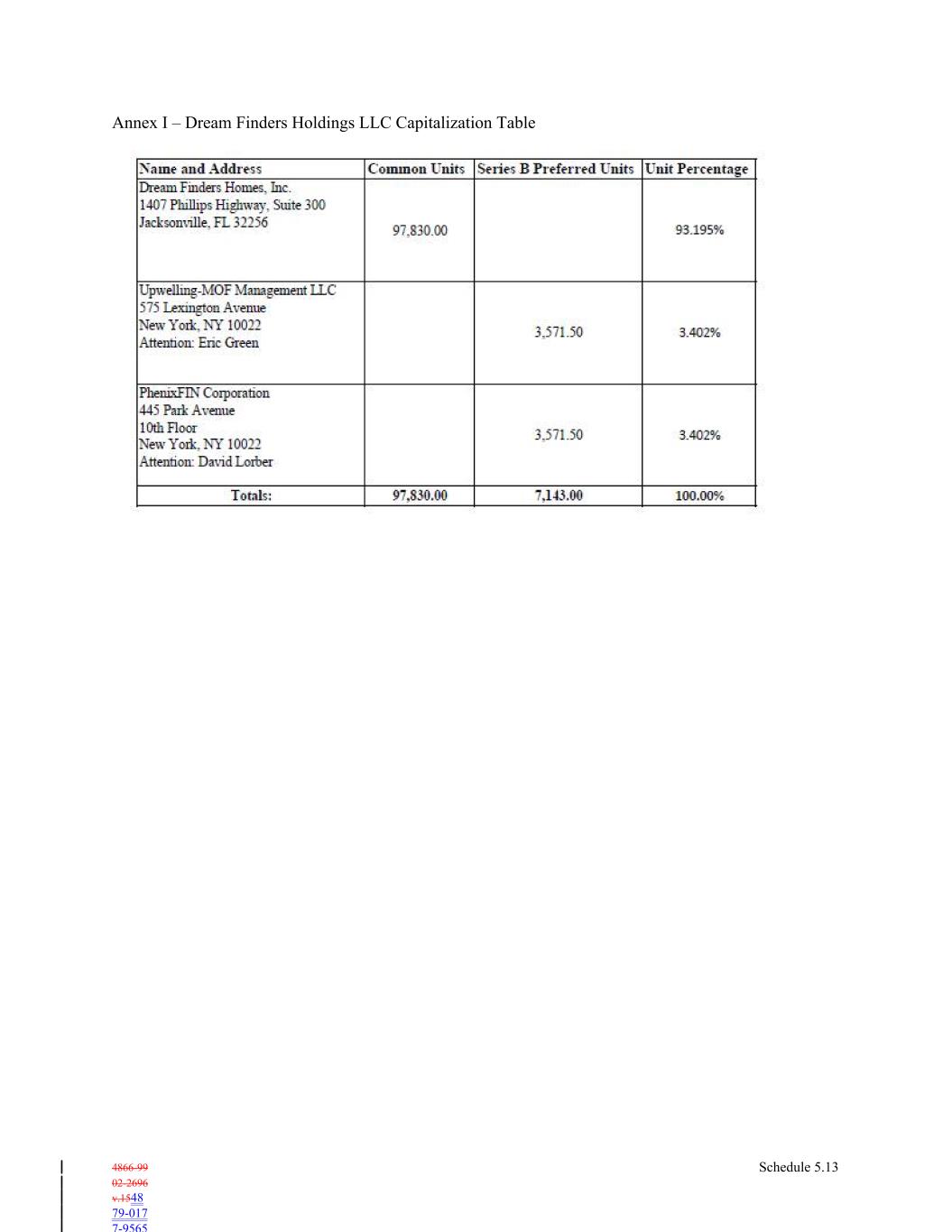 4866-99 02-2696 v.1548 79-017 7-9565 Schedule 5.13 Annex I – Dream Finders Holdings LLC Capitalization Table