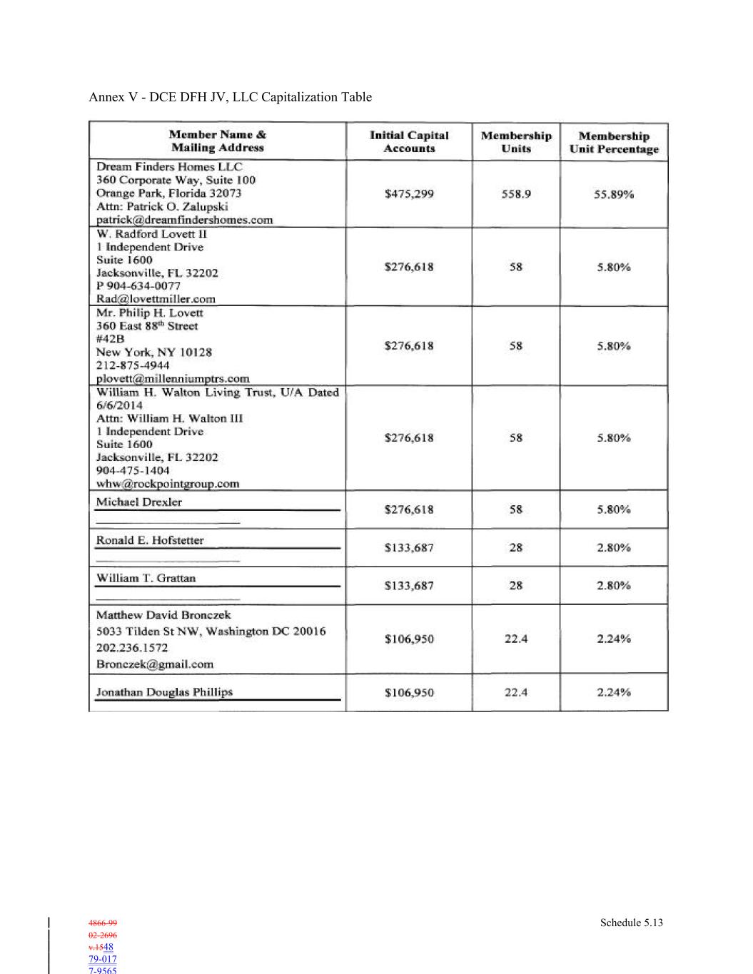 4866-99 02-2696 v.1548 79-017 7-9565 Schedule 5.13 Annex V - DCE DFH JV, LLC Capitalization Table