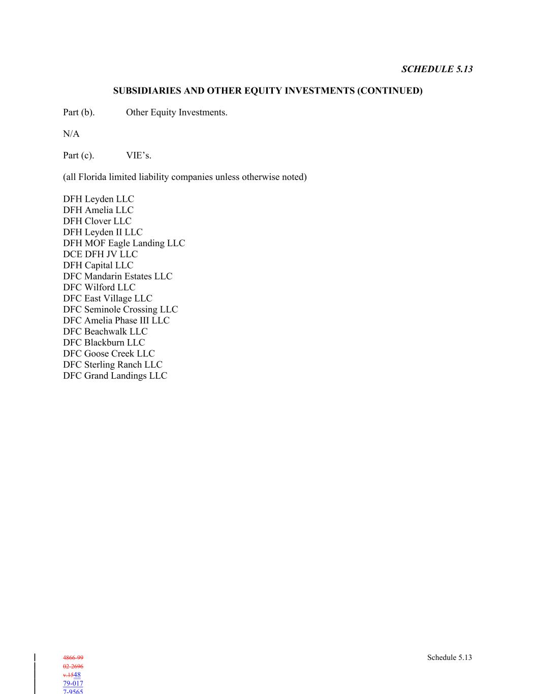 4866-99 02-2696 v.1548 79-017 7-9565 Schedule 5.13 SCHEDULE 5.13 SUBSIDIARIES AND OTHER EQUITY INVESTMENTS (CONTINUED) Part (b). Other Equity Investments. N/A Part (c). VIE’s. (all Florida limited liability companies unless otherwise noted) DFH Leyden LLC DFH Amelia LLC DFH Clover LLC DFH Leyden II LLC DFH MOF Eagle Landing LLC DCE DFH JV LLC DFH Capital LLC DFC Mandarin Estates LLC DFC Wilford LLC DFC East Village LLC DFC Seminole Crossing LLC DFC Amelia Phase III LLC DFC Beachwalk LLC DFC Blackburn LLC DFC Goose Creek LLC DFC Sterling Ranch LLC DFC Grand Landings LLC
