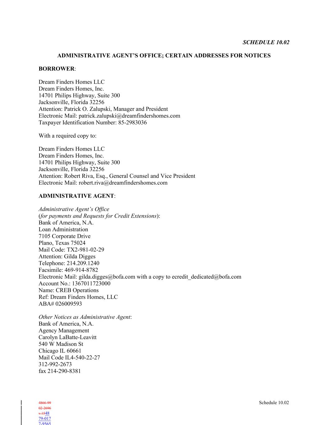 4866-99 02-2696 v.1548 79-017 7-9565 Schedule 10.02 SCHEDULE 10.02 ADMINISTRATIVE AGENT’S OFFICE; CERTAIN ADDRESSES FOR NOTICES BORROWER: Dream Finders Homes LLC Dream Finders Homes, Inc. 14701 Philips Highway, Suite 300 Jacksonville, Florida 32256 Attention: Patrick O. Zalupski, Manager and President Electronic Mail: patrick.zalupski@dreamfindershomes.com Taxpayer Identification Number: 85-2983036 With a required copy to: Dream Finders Homes LLC Dream Finders Homes, Inc. 14701 Philips Highway, Suite 300 Jacksonville, Florida 32256 Attention: Robert Riva, Esq., General Counsel and Vice President Electronic Mail: robert.riva@dreamfindershomes.com ADMINISTRATIVE AGENT: Administrative Agent’s Office (for payments and Requests for Credit Extensions): Bank of America, N.A. Loan Administration 7105 Corporate Drive Plano, Texas 75024 Mail Code: TX2-981-02-29 Attention: Gilda Digges Telephone: 214.209.1240 Facsimile: 469-914-8782 Electronic Mail: gilda.digges@bofa.com with a copy to ecredit_dedicated@bofa.com Account No.: 1367011723000 Name: CREB Operations Ref: Dream Finders Homes, LLC ABA# 026009593 Other Notices as Administrative Agent: Bank of America, N.A. Agency Management Carolyn LaBatte-Leavitt 540 W Madison St Chicago IL 60661 Mail Code IL4-540-22-27 312-992-2673 fax 214-290-8381