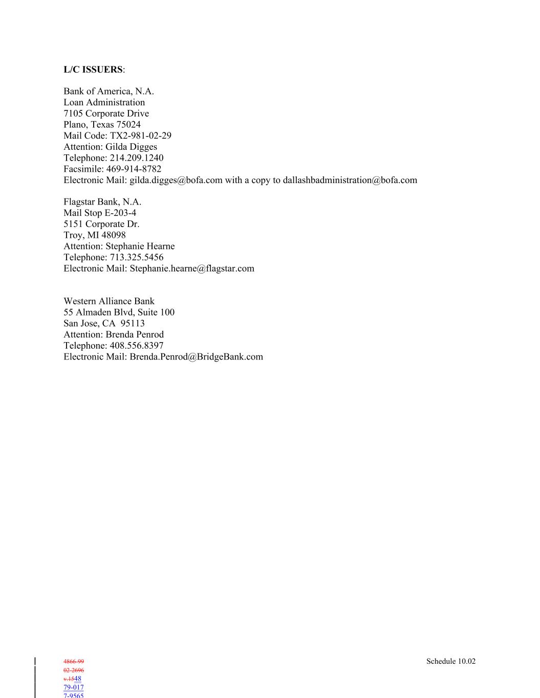 4866-99 02-2696 v.1548 79-017 7-9565 Schedule 10.02 L/C ISSUERS: Bank of America, N.A. Loan Administration 7105 Corporate Drive Plano, Texas 75024 Mail Code: TX2-981-02-29 Attention: Gilda Digges Telephone: 214.209.1240 Facsimile: 469-914-8782 Electronic Mail: gilda.digges@bofa.com with a copy to dallashbadministration@bofa.com Flagstar Bank, N.A. Mail Stop E-203-4 5151 Corporate Dr. Troy, MI 48098 Attention: Stephanie Hearne Telephone: 713.325.5456 Electronic Mail: Stephanie.hearne@flagstar.com Western Alliance Bank 55 Almaden Blvd, Suite 100 San Jose, CA 95113 Attention: Brenda Penrod Telephone: 408.556.8397 Electronic Mail: Brenda.Penrod@BridgeBank.com
