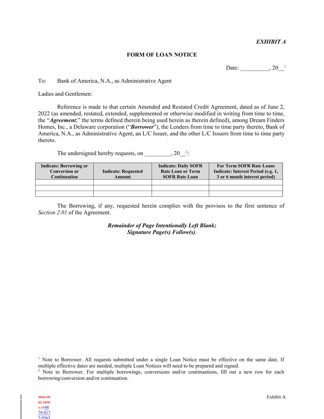 4866-99 02-2696 v.1548 79-017 7-9565 Exhibit A For Term SOFR Rate Loans Indicate: Interest Period (e.g. 1, 3 or 6 month interest period) The undersigned hereby requests, on _________, 20__2: Indicate: Borrowing or Conversion or Continuation Indicate: Requested Amount The Borrowing, if any, requested herein complies with the provisos to the first sentence of Section 2.01 of the Agreement. Remainder of Page Intentionally Left Blank; Signature Page(s) Follow(s). EXHIBIT A FORM OF LOAN NOTICE Indicate: Daily SOFR Rate Loan or Term SOFR Rate Loan Date: __________, 20__1 To: Bank of America, N.A., as Administrative Agent Ladies and Gentlemen: Reference is made to that certain Amended and Restated Credit Agreement, dated as of June 2, 2022 (as amended, restated, extended, supplemented or otherwise modified in writing from time to time, the “Agreement;” the terms defined therein being used herein as therein defined), among Dream Finders Homes, Inc., a Delaware corporation (“Borrower”), the Lenders from time to time party thereto, Bank of America, N.A., as Administrative Agent, an L/C Issuer, and the other L/C Issuers from time to time party thereto. 1 Note to Borrower. All requests submitted under a single Loan Notice must be effective on the same date. If multiple effective dates are needed, multiple Loan Notices will need to be prepared and signed. 2 Note to Borrower. For multiple borrowings, conversions and/or continuations, fill out a new row for each borrowing/conversion and/or continuation.