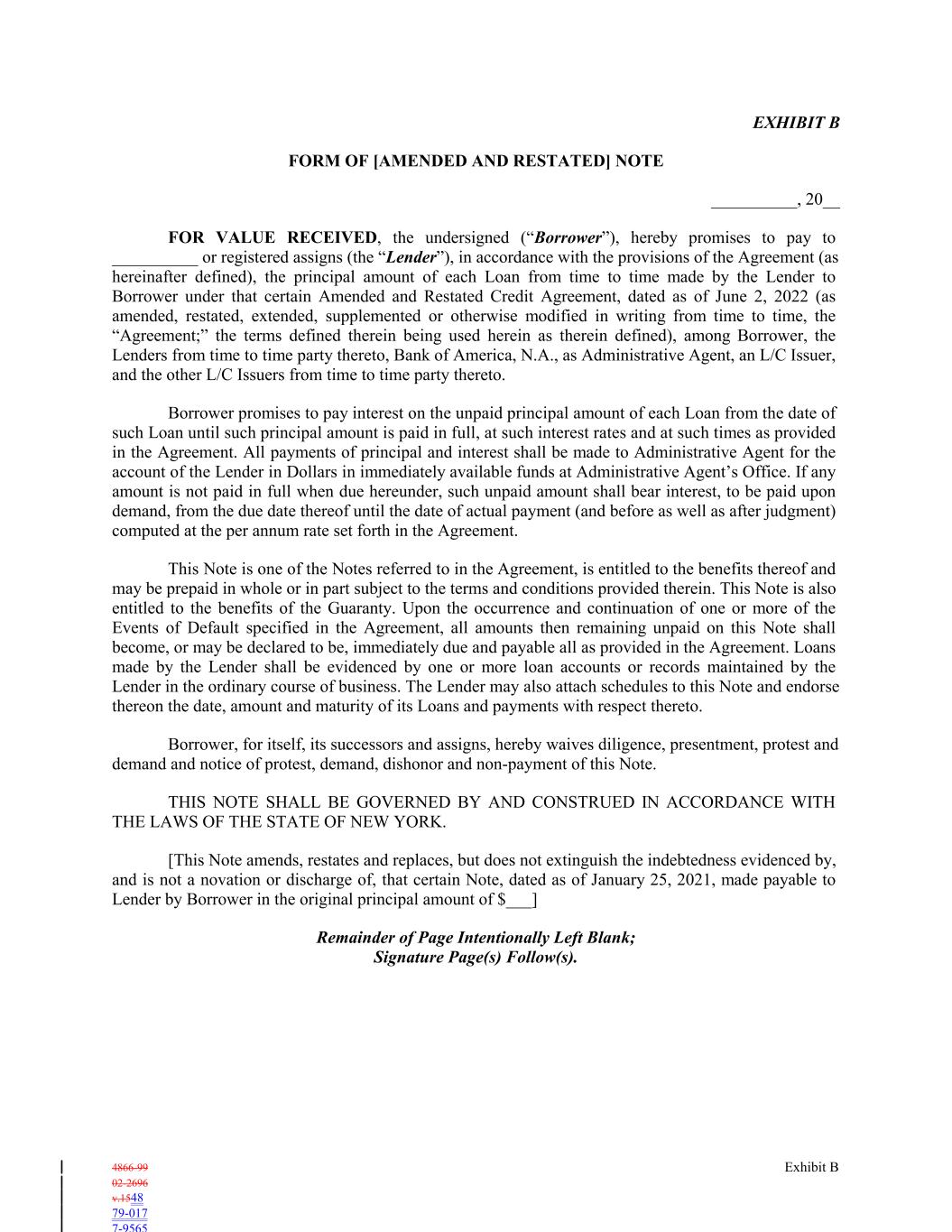 4866-99 02-2696 v.1548 79-017 7-9565 Exhibit B EXHIBIT B FORM OF [AMENDED AND RESTATED] NOTE __________, 20__ FOR VALUE RECEIVED, the undersigned (“Borrower”), hereby promises to pay to __________ or registered assigns (the “Lender”), in accordance with the provisions of the Agreement (as hereinafter defined), the principal amount of each Loan from time to time made by the Lender to Borrower under that certain Amended and Restated Credit Agreement, dated as of June 2, 2022 (as amended, restated, extended, supplemented or otherwise modified in writing from time to time, the “Agreement;” the terms defined therein being used herein as therein defined), among Borrower, the Lenders from time to time party thereto, Bank of America, N.A., as Administrative Agent, an L/C Issuer, and the other L/C Issuers from time to time party thereto. Borrower promises to pay interest on the unpaid principal amount of each Loan from the date of such Loan until such principal amount is paid in full, at such interest rates and at such times as provided in the Agreement. All payments of principal and interest shall be made to Administrative Agent for the account of the Lender in Dollars in immediately available funds at Administrative Agent’s Office. If any amount is not paid in full when due hereunder, such unpaid amount shall bear interest, to be paid upon demand, from the due date thereof until the date of actual payment (and before as well as after judgment) computed at the per annum rate set forth in the Agreement. This Note is one of the Notes referred to in the Agreement, is entitled to the benefits thereof and may be prepaid in whole or in part subject to the terms and conditions provided therein. This Note is also entitled to the benefits of the Guaranty. Upon the occurrence and continuation of one or more of the Events of Default specified in the Agreement, all amounts then remaining unpaid on this Note shall become, or may be declared to be, immediately due and payable all as provided in the Agreement. Loans made by the Lender shall be evidenced by one or more loan accounts or records maintained by the Lender in the ordinary course of business. The Lender may also attach schedules to this Note and endorse thereon the date, amount and maturity of its Loans and payments with respect thereto. Borrower, for itself, its successors and assigns, hereby waives diligence, presentment, protest and demand and notice of protest, demand, dishonor and non-payment of this Note. THIS NOTE SHALL BE GOVERNED BY AND CONSTRUED IN ACCORDANCE WITH THE LAWS OF THE STATE OF NEW YORK. [This Note amends, restates and replaces, but does not extinguish the indebtedness evidenced by, and is not a novation or discharge of, that certain Note, dated as of January 25, 2021, made payable to Lender by Borrower in the original principal amount of $___] Remainder of Page Intentionally Left Blank; Signature Page(s) Follow(s).