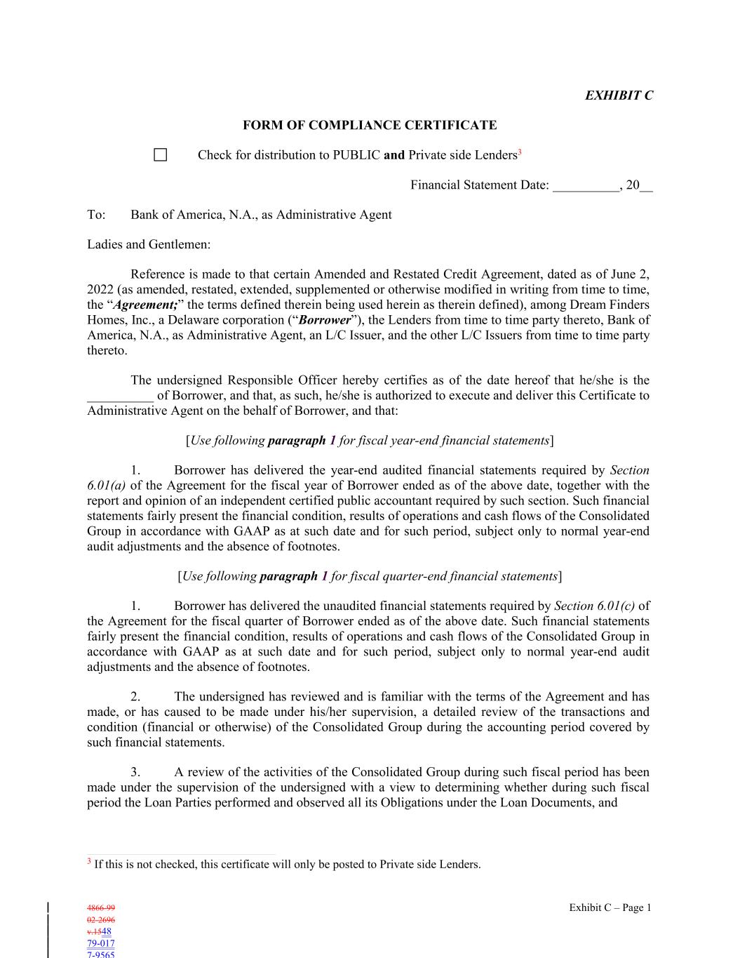 4866-99 02-2696 v.1548 79-017 7-9565 Exhibit C – Page 1 EXHIBIT C FORM OF COMPLIANCE CERTIFICATE Check for distribution to PUBLIC and Private side Lenders3 Financial Statement Date: __________, 20__ To: Bank of America, N.A., as Administrative Agent Ladies and Gentlemen: Reference is made to that certain Amended and Restated Credit Agreement, dated as of June 2, 2022 (as amended, restated, extended, supplemented or otherwise modified in writing from time to time, the “Agreement;” the terms defined therein being used herein as therein defined), among Dream Finders Homes, Inc., a Delaware corporation (“Borrower”), the Lenders from time to time party thereto, Bank of America, N.A., as Administrative Agent, an L/C Issuer, and the other L/C Issuers from time to time party thereto. The undersigned Responsible Officer hereby certifies as of the date hereof that he/she is the __________ of Borrower, and that, as such, he/she is authorized to execute and deliver this Certificate to Administrative Agent on the behalf of Borrower, and that: [Use following paragraph 1 for fiscal year-end financial statements] 1. Borrower has delivered the year-end audited financial statements required by Section 6.01(a) of the Agreement for the fiscal year of Borrower ended as of the above date, together with the report and opinion of an independent certified public accountant required by such section. Such financial statements fairly present the financial condition, results of operations and cash flows of the Consolidated Group in accordance with GAAP as at such date and for such period, subject only to normal year-end audit adjustments and the absence of footnotes. [Use following paragraph 1 for fiscal quarter-end financial statements] 1. Borrower has delivered the unaudited financial statements required by Section 6.01(c) of the Agreement for the fiscal quarter of Borrower ended as of the above date. Such financial statements fairly present the financial condition, results of operations and cash flows of the Consolidated Group in accordance with GAAP as at such date and for such period, subject only to normal year-end audit adjustments and the absence of footnotes. 2. The undersigned has reviewed and is familiar with the terms of the Agreement and has made, or has caused to be made under his/her supervision, a detailed review of the transactions and condition (financial or otherwise) of the Consolidated Group during the accounting period covered by such financial statements. 3. A review of the activities of the Consolidated Group during such fiscal period has been made under the supervision of the undersigned with a view to determining whether during such fiscal period the Loan Parties performed and observed all its Obligations under the Loan Documents, and 3 If this is not checked, this certificate will only be posted to Private side Lenders.