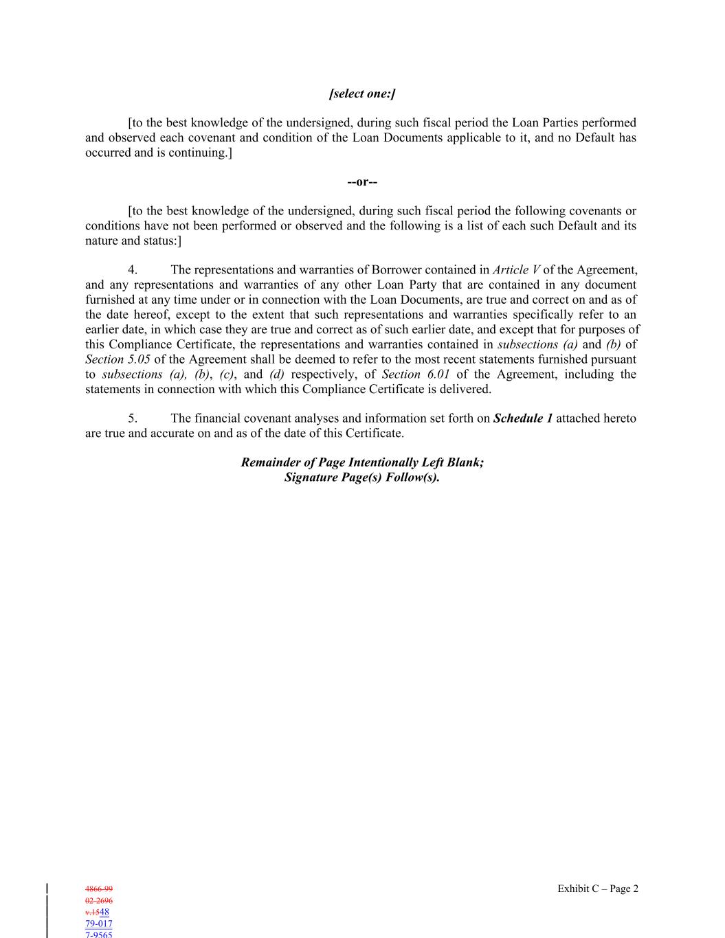 4866-99 02-2696 v.1548 79-017 7-9565 Exhibit C – Page 2 [select one:] [to the best knowledge of the undersigned, during such fiscal period the Loan Parties performed and observed each covenant and condition of the Loan Documents applicable to it, and no Default has occurred and is continuing.] --or-- [to the best knowledge of the undersigned, during such fiscal period the following covenants or conditions have not been performed or observed and the following is a list of each such Default and its nature and status:] 4. The representations and warranties of Borrower contained in Article V of the Agreement, and any representations and warranties of any other Loan Party that are contained in any document furnished at any time under or in connection with the Loan Documents, are true and correct on and as of the date hereof, except to the extent that such representations and warranties specifically refer to an earlier date, in which case they are true and correct as of such earlier date, and except that for purposes of this Compliance Certificate, the representations and warranties contained in subsections (a) and (b) of Section 5.05 of the Agreement shall be deemed to refer to the most recent statements furnished pursuant to subsections (a), (b), (c), and (d) respectively, of Section 6.01 of the Agreement, including the statements in connection with which this Compliance Certificate is delivered. 5. The financial covenant analyses and information set forth on Schedule 1 attached hereto are true and accurate on and as of the date of this Certificate. Remainder of Page Intentionally Left Blank; Signature Page(s) Follow(s).