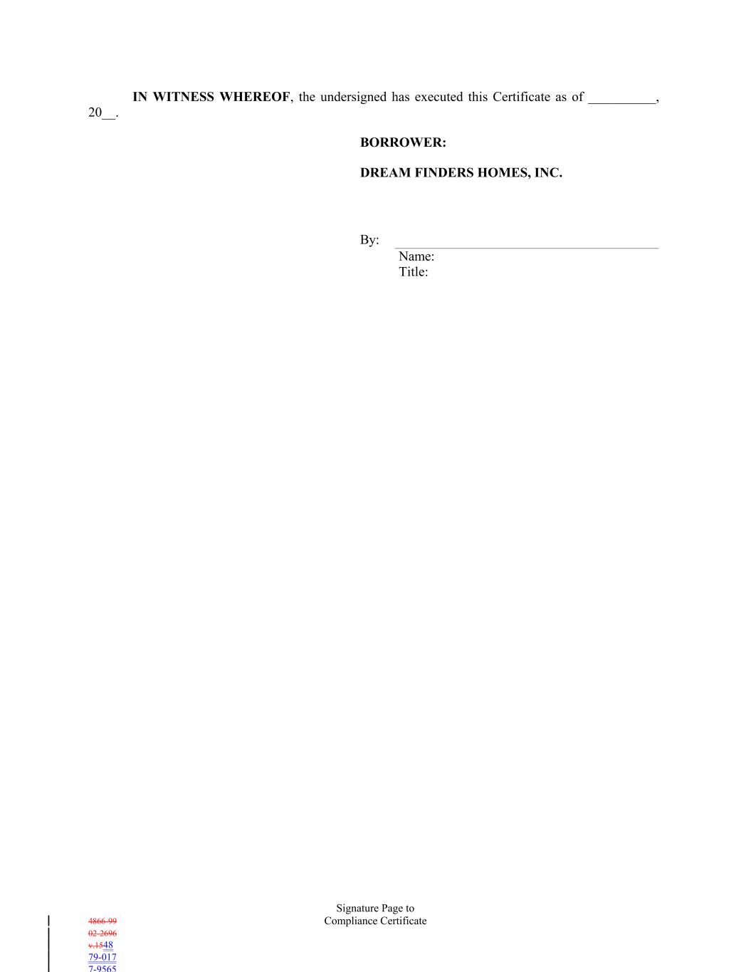 4866-99 02-2696 v.1548 79-017 7-9565 Signature Page to Compliance Certificate IN WITNESS WHEREOF, the undersigned has executed this Certificate as of __________, 20__. Name: DREAM FINDERS HOMES, INC. Title: By: BORROWER: