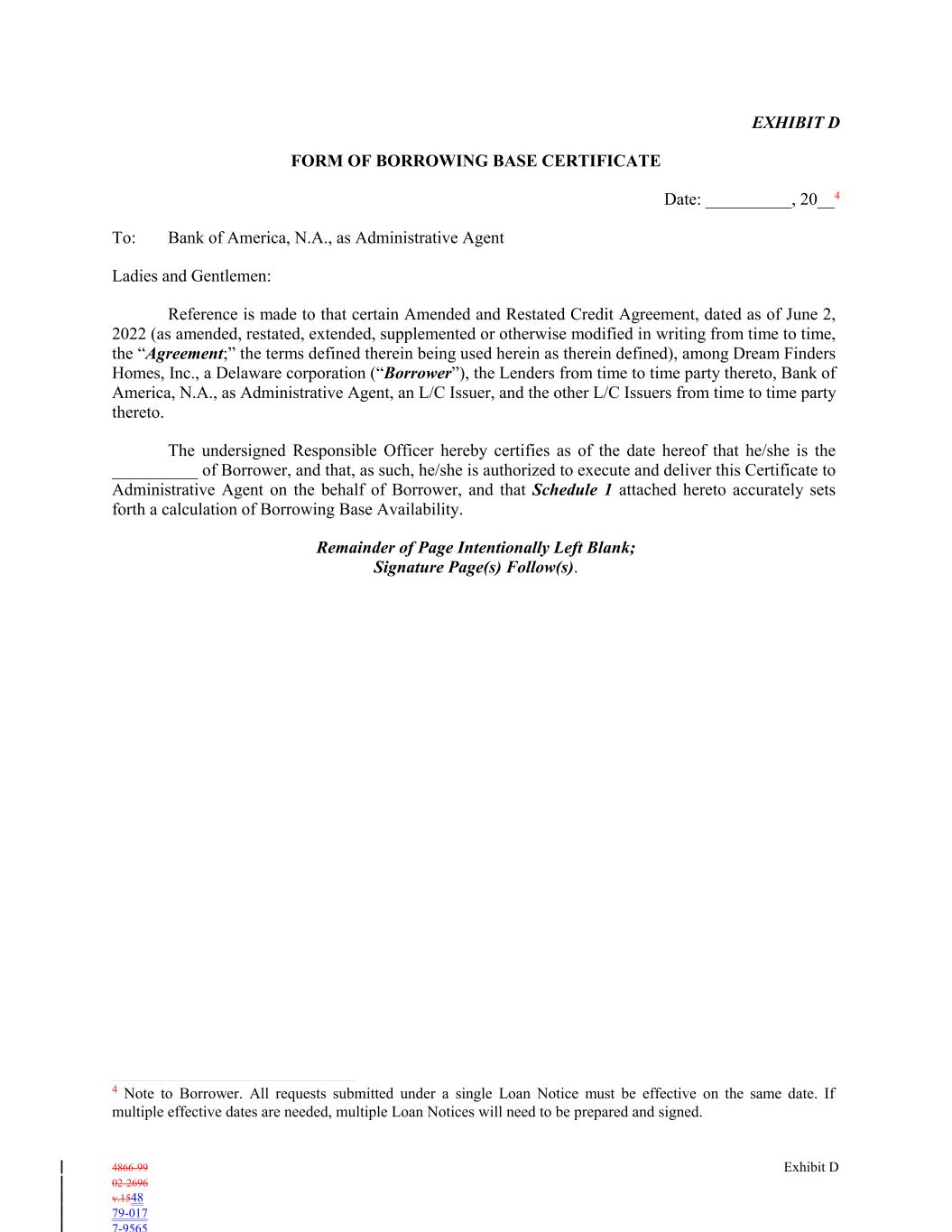 4866-99 02-2696 v.1548 79-017 7-9565 Exhibit D EXHIBIT D FORM OF BORROWING BASE CERTIFICATE Date: __________, 20__4 To: Bank of America, N.A., as Administrative Agent Ladies and Gentlemen: Reference is made to that certain Amended and Restated Credit Agreement, dated as of June 2, 2022 (as amended, restated, extended, supplemented or otherwise modified in writing from time to time, the “Agreement;” the terms defined therein being used herein as therein defined), among Dream Finders Homes, Inc., a Delaware corporation (“Borrower”), the Lenders from time to time party thereto, Bank of America, N.A., as Administrative Agent, an L/C Issuer, and the other L/C Issuers from time to time party thereto. The undersigned Responsible Officer hereby certifies as of the date hereof that he/she is the __________ of Borrower, and that, as such, he/she is authorized to execute and deliver this Certificate to Administrative Agent on the behalf of Borrower, and that Schedule 1 attached hereto accurately sets forth a calculation of Borrowing Base Availability. Remainder of Page Intentionally Left Blank; Signature Page(s) Follow(s). 4 Note to Borrower. All requests submitted under a single Loan Notice must be effective on the same date. If multiple effective dates are needed, multiple Loan Notices will need to be prepared and signed.