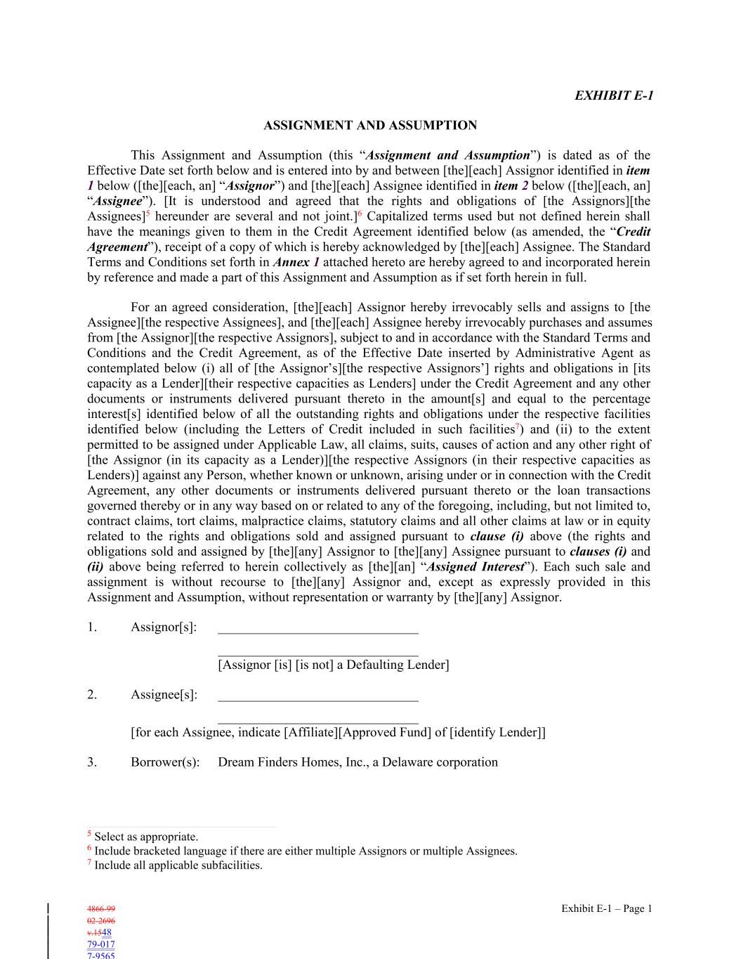 4866-99 02-2696 v.1548 79-017 7-9565 Exhibit E-1 – Page 1 EXHIBIT E-1 ASSIGNMENT AND ASSUMPTION This Assignment and Assumption (this “Assignment and Assumption”) is dated as of the Effective Date set forth below and is entered into by and between [the][each] Assignor identified in item 1 below ([the][each, an] “Assignor”) and [the][each] Assignee identified in item 2 below ([the][each, an] “Assignee”). [It is understood and agreed that the rights and obligations of [the Assignors][the Assignees]5 hereunder are several and not joint.]6 Capitalized terms used but not defined herein shall have the meanings given to them in the Credit Agreement identified below (as amended, the “Credit Agreement”), receipt of a copy of which is hereby acknowledged by [the][each] Assignee. The Standard Terms and Conditions set forth in Annex 1 attached hereto are hereby agreed to and incorporated herein by reference and made a part of this Assignment and Assumption as if set forth herein in full. For an agreed consideration, [the][each] Assignor hereby irrevocably sells and assigns to [the Assignee][the respective Assignees], and [the][each] Assignee hereby irrevocably purchases and assumes from [the Assignor][the respective Assignors], subject to and in accordance with the Standard Terms and Conditions and the Credit Agreement, as of the Effective Date inserted by Administrative Agent as contemplated below (i) all of [the Assignor’s][the respective Assignors’] rights and obligations in [its capacity as a Lender][their respective capacities as Lenders] under the Credit Agreement and any other documents or instruments delivered pursuant thereto in the amount[s] and equal to the percentage interest[s] identified below of all the outstanding rights and obligations under the respective facilities identified below (including the Letters of Credit included in such facilities7) and (ii) to the extent permitted to be assigned under Applicable Law, all claims, suits, causes of action and any other right of [the Assignor (in its capacity as a Lender)][the respective Assignors (in their respective capacities as Lenders)] against any Person, whether known or unknown, arising under or in connection with the Credit Agreement, any other documents or instruments delivered pursuant thereto or the loan transactions governed thereby or in any way based on or related to any of the foregoing, including, but not limited to, contract claims, tort claims, malpractice claims, statutory claims and all other claims at law or in equity related to the rights and obligations sold and assigned pursuant to clause (i) above (the rights and obligations sold and assigned by [the][any] Assignor to [the][any] Assignee pursuant to clauses (i) and (ii) above being referred to herein collectively as [the][an] “Assigned Interest”). Each such sale and assignment is without recourse to [the][any] Assignor and, except as expressly provided in this Assignment and Assumption, without representation or warranty by [the][any] Assignor. 1. Assignor[s]: ______________________________ ______________________________ [Assignor [is] [is not] a Defaulting Lender] 2. Assignee[s]: ______________________________ ______________________________ [for each Assignee, indicate [Affiliate][Approved Fund] of [identify Lender]] 3. Borrower(s): Dream Finders Homes, Inc., a Delaware corporation 5 Select as appropriate. 6 Include bracketed language if there are either multiple Assignors or multiple Assignees. 7 Include all applicable subfacilities.