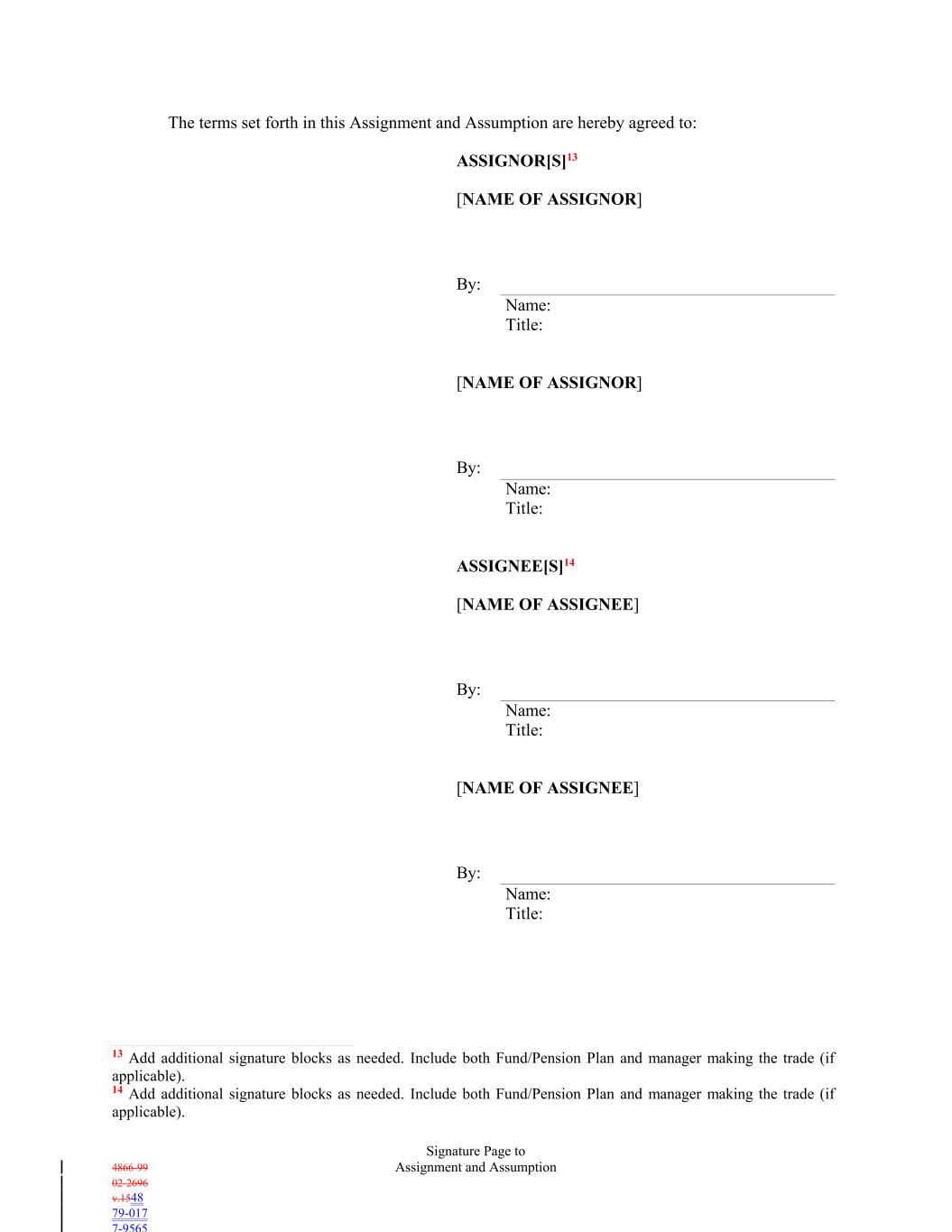 4866-99 02-2696 v.1548 79-017 7-9565 Signature Page to Assignment and Assumption ASSIGNEE[S]14 Title: [NAME OF ASSIGNEE] By: By: Name: [NAME OF ASSIGNOR] ASSIGNOR[S]13 Title: By: [NAME OF ASSIGNEE] By: Name: Name: Name: The terms set forth in this Assignment and Assumption are hereby agreed to: Title: [NAME OF ASSIGNOR] Title: 13 Add additional signature blocks as needed. Include both Fund/Pension Plan and manager making the trade (if applicable). 14 Add additional signature blocks as needed. Include both Fund/Pension Plan and manager making the trade (if applicable).