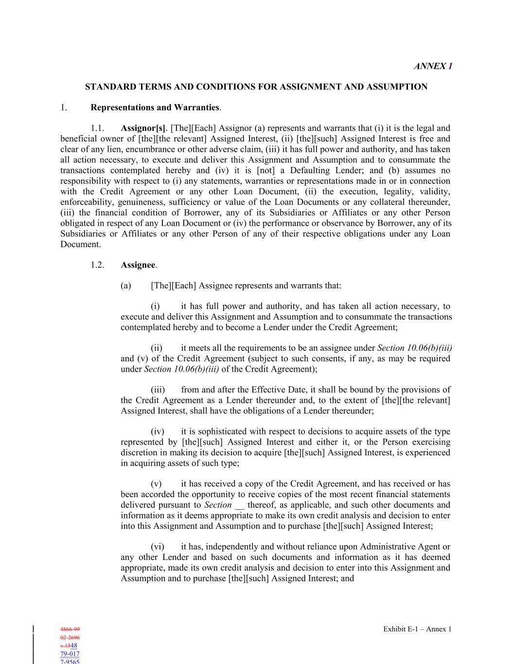 4866-99 02-2696 v.1548 79-017 7-9565 Exhibit E-1 – Annex 1 ANNEX 1 STANDARD TERMS AND CONDITIONS FOR ASSIGNMENT AND ASSUMPTION 1. Representations and Warranties. 1.1. Assignor[s]. [The][Each] Assignor (a) represents and warrants that (i) it is the legal and beneficial owner of [the][the relevant] Assigned Interest, (ii) [the][such] Assigned Interest is free and clear of any lien, encumbrance or other adverse claim, (iii) it has full power and authority, and has taken all action necessary, to execute and deliver this Assignment and Assumption and to consummate the transactions contemplated hereby and (iv) it is [not] a Defaulting Lender; and (b) assumes no responsibility with respect to (i) any statements, warranties or representations made in or in connection with the Credit Agreement or any other Loan Document, (ii) the execution, legality, validity, enforceability, genuineness, sufficiency or value of the Loan Documents or any collateral thereunder, (iii) the financial condition of Borrower, any of its Subsidiaries or Affiliates or any other Person obligated in respect of any Loan Document or (iv) the performance or observance by Borrower, any of its Subsidiaries or Affiliates or any other Person of any of their respective obligations under any Loan Document. 1.2. Assignee. (a) [The][Each] Assignee represents and warrants that: (i) it has full power and authority, and has taken all action necessary, to execute and deliver this Assignment and Assumption and to consummate the transactions contemplated hereby and to become a Lender under the Credit Agreement; (ii) it meets all the requirements to be an assignee under Section 10.06(b)(iii) and (v) of the Credit Agreement (subject to such consents, if any, as may be required under Section 10.06(b)(iii) of the Credit Agreement); (iii) from and after the Effective Date, it shall be bound by the provisions of the Credit Agreement as a Lender thereunder and, to the extent of [the][the relevant] Assigned Interest, shall have the obligations of a Lender thereunder; (iv) it is sophisticated with respect to decisions to acquire assets of the type represented by [the][such] Assigned Interest and either it, or the Person exercising discretion in making its decision to acquire [the][such] Assigned Interest, is experienced in acquiring assets of such type; (v) it has received a copy of the Credit Agreement, and has received or has been accorded the opportunity to receive copies of the most recent financial statements delivered pursuant to Section __ thereof, as applicable, and such other documents and information as it deems appropriate to make its own credit analysis and decision to enter into this Assignment and Assumption and to purchase [the][such] Assigned Interest; (vi) it has, independently and without reliance upon Administrative Agent or any other Lender and based on such documents and information as it has deemed appropriate, made its own credit analysis and decision to enter into this Assignment and Assumption and to purchase [the][such] Assigned Interest; and