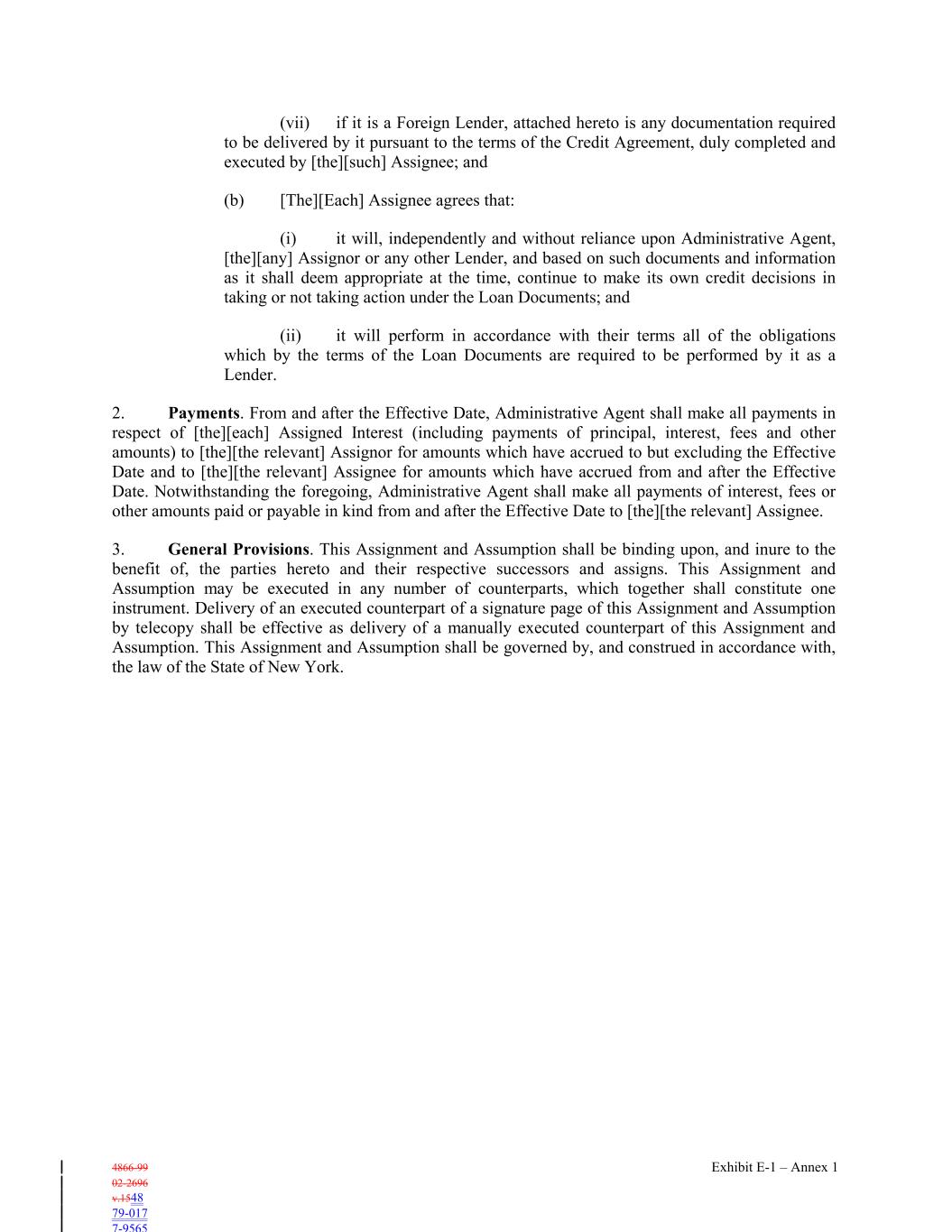 4866-99 02-2696 v.1548 79-017 7-9565 Exhibit E-1 – Annex 1 (vii) if it is a Foreign Lender, attached hereto is any documentation required to be delivered by it pursuant to the terms of the Credit Agreement, duly completed and executed by [the][such] Assignee; and (b) [The][Each] Assignee agrees that: (i) it will, independently and without reliance upon Administrative Agent, [the][any] Assignor or any other Lender, and based on such documents and information as it shall deem appropriate at the time, continue to make its own credit decisions in taking or not taking action under the Loan Documents; and (ii) it will perform in accordance with their terms all of the obligations which by the terms of the Loan Documents are required to be performed by it as a Lender. 2. Payments. From and after the Effective Date, Administrative Agent shall make all payments in respect of [the][each] Assigned Interest (including payments of principal, interest, fees and other amounts) to [the][the relevant] Assignor for amounts which have accrued to but excluding the Effective Date and to [the][the relevant] Assignee for amounts which have accrued from and after the Effective Date. Notwithstanding the foregoing, Administrative Agent shall make all payments of interest, fees or other amounts paid or payable in kind from and after the Effective Date to [the][the relevant] Assignee. 3. General Provisions. This Assignment and Assumption shall be binding upon, and inure to the benefit of, the parties hereto and their respective successors and assigns. This Assignment and Assumption may be executed in any number of counterparts, which together shall constitute one instrument. Delivery of an executed counterpart of a signature page of this Assignment and Assumption by telecopy shall be effective as delivery of a manually executed counterpart of this Assignment and Assumption. This Assignment and Assumption shall be governed by, and construed in accordance with, the law of the State of New York.