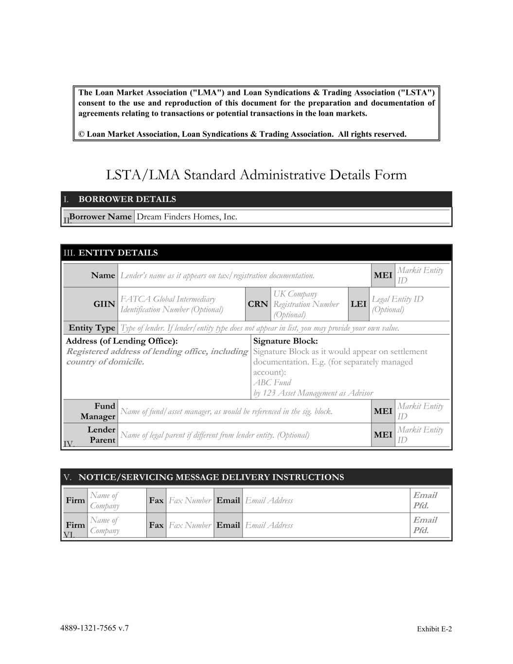 4889-1321-7565 v.7 Exhibit E-2 The Loan Market Association ("LMA") and Loan Syndications & Trading Association ("LSTA") consent to the use and reproduction of this document for the preparation and documentation of agreements relating to transactions or potential transactions in the loan markets. © Loan Market Association, Loan Syndications & Trading Association. All rights reserved. LSTA/LMA Standard Administrative Details Form I. BORROWER DETAILS Borrower Name Dream Finders Homes, Inc. II. III. ENTITY DETAILS Name Lender’s name as it appears on tax/registration documentation. MEI Markit Entity ID GIIN FATCA Global Intermediary Identification Number (Optional) CRN UK Company Registration Number (Optional) LEI Legal Entity ID (Optional) Entity Type Type of lender. If lender/entity type does not appear in list, you may provide your own value. Address (of Lending Office): Registered address of lending office, including country of domicile. Signature Block: Signature Block as it would appear on settlement documentation. E.g. (for separately managed account): ABC Fund by 123 Asset Management as Advisor Fund Manager Name of fund/asset manager, as would be referenced in the sig. block. MEI Markit Entity ID Lender Parent Name of legal parent if different from lender entity. (Optional) MEI Markit Entity ID IV. V. NOTICE/SERVICING MESSAGE DELIVERY INSTRUCTIONS Firm Name of Company Fax Fax Number Email Email Address Email Pfd. Firm Name of Company Fax Fax Number Email Email Address Email Pfd. VI.