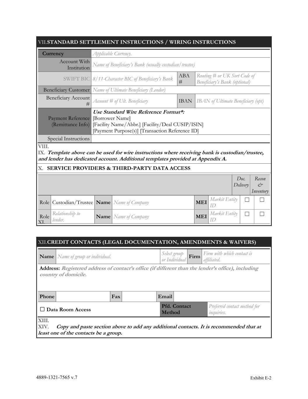 4889-1321-7565 v.7 Exhibit E-2 VII. STANDARD SETTLEMENT INSTRUCTIONS / WIRING INSTRUCTIONS Currency Applicable Currency. Account With Institution Name of Beneficiary’s Bank (usually custodian/trustee) SWIFT BIC 8/11-Character BIC of Beneficiary’s Bank ABA # Routing # or UK Sort Code of Beneficiary’s Bank (optional) Beneficiary Customer Name of Ultimate Beneficiary (Lender) Beneficiary Account # Account # of Ult. Beneficiary IBAN IBAN of Ultimate Beneficiary (opt) Payment Reference (Remittance Info) Use Standard Wire Reference Format*: [Borrower Name] [Facility Name/Abbr.] [Facility/Deal CUSIP/ISIN] [Payment Purpose(s)] [Transaction Reference ID] Special Instructions VIII. IX. Template above can be used for wire instructions where receiving bank is custodian/trustee, and lender has dedicated account. Additional templates provided at Appendix A. X. SERVICE PROVIDERS & THIRD-PARTY DATA ACCESS Doc. Delivery Recon & Inventory Role Custodian/Trustee Name Name of Company MEI Markit Entity ID ☐ ☐ Role Relationship to lender. Name Name of Company MEI Markit Entity ID ☐ ☐ XI. XII. CREDIT CONTACTS (LEGAL DOCUMENTATION, AMENDMENTS & WAIVERS) Name Name of group or individual. Select group or Individual Firm Firm with which contact is affiliated. Address: Registered address of contact’s office (if different than the lender’s office), including country of domicile. Phone Fax Email ☐ Data Room Access Pfd. Contact Method Preferred contact method for inquiries. XIII. XIV. Copy and paste section above to add any additional contacts. It is recommended that at least one of the contacts be a group.