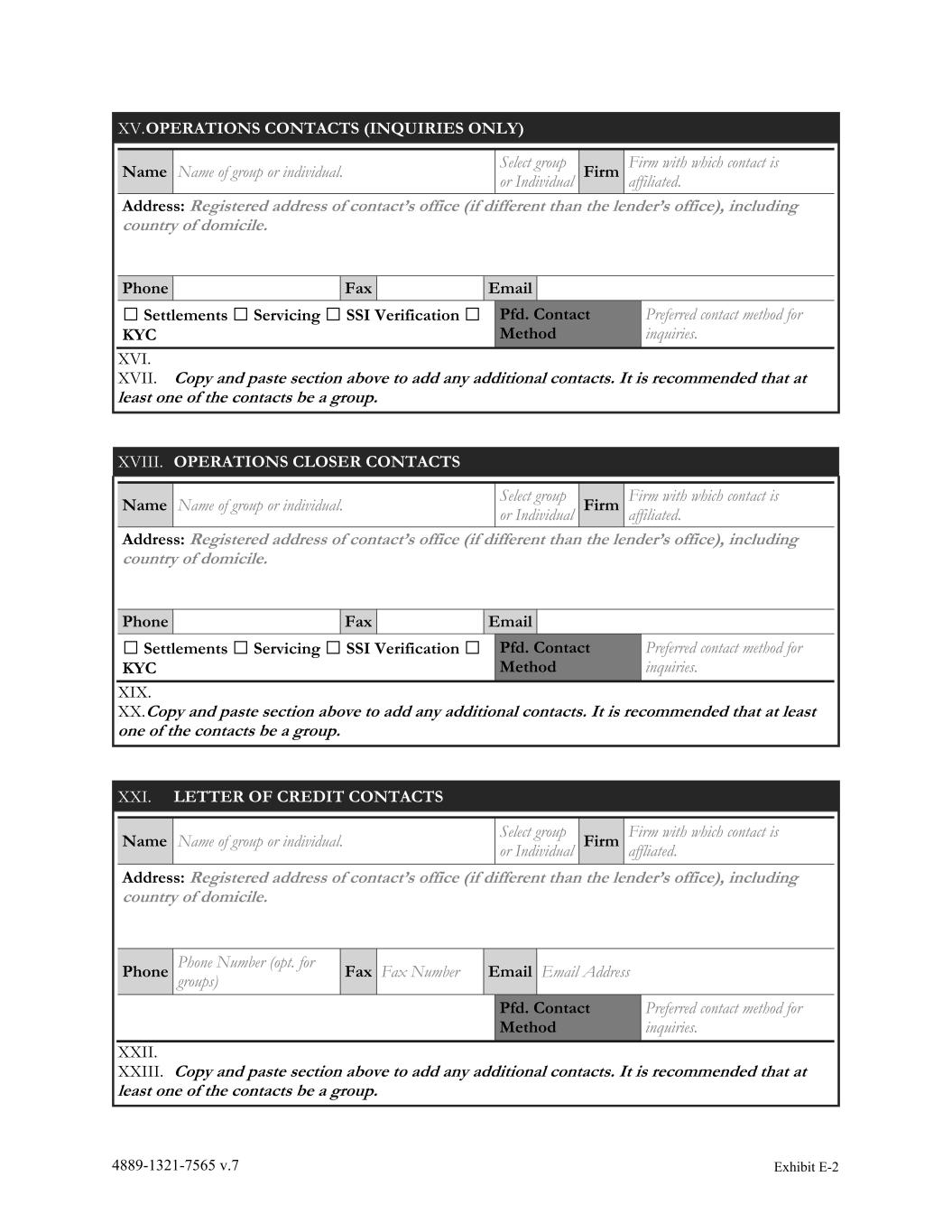 4889-1321-7565 v.7 Exhibit E-2 XV. OPERATIONS CONTACTS (INQUIRIES ONLY) Name Name of group or individual. Select group or Individual Firm Firm with which contact is affiliated. Address: Registered address of contact’s office (if different than the lender’s office), including country of domicile. Phone Fax Email ☐ Settlements ☐ Servicing ☐ SSI Verification ☐ KYC Pfd. Contact Method Preferred contact method for inquiries. XVI. XVII. Copy and paste section above to add any additional contacts. It is recommended that at least one of the contacts be a group. XVIII. OPERATIONS CLOSER CONTACTS Name Name of group or individual. Select group or Individual Firm Firm with which contact is affiliated. Address: Registered address of contact’s office (if different than the lender’s office), including country of domicile. Phone Fax Email ☐ Settlements ☐ Servicing ☐ SSI Verification ☐ KYC Pfd. Contact Method Preferred contact method for inquiries. XIX. XX. Copy and paste section above to add any additional contacts. It is recommended that at least one of the contacts be a group. XXI. LETTER OF CREDIT CONTACTS Name Name of group or individual. Select group or Individual Firm Firm with which contact is affliated. Address: Registered address of contact’s office (if different than the lender’s office), including country of domicile. Phone Phone Number (opt. for groups) Fax Fax Number Email Email Address Pfd. Contact Method Preferred contact method for inquiries. XXII. XXIII. Copy and paste section above to add any additional contacts. It is recommended that at least one of the contacts be a group.