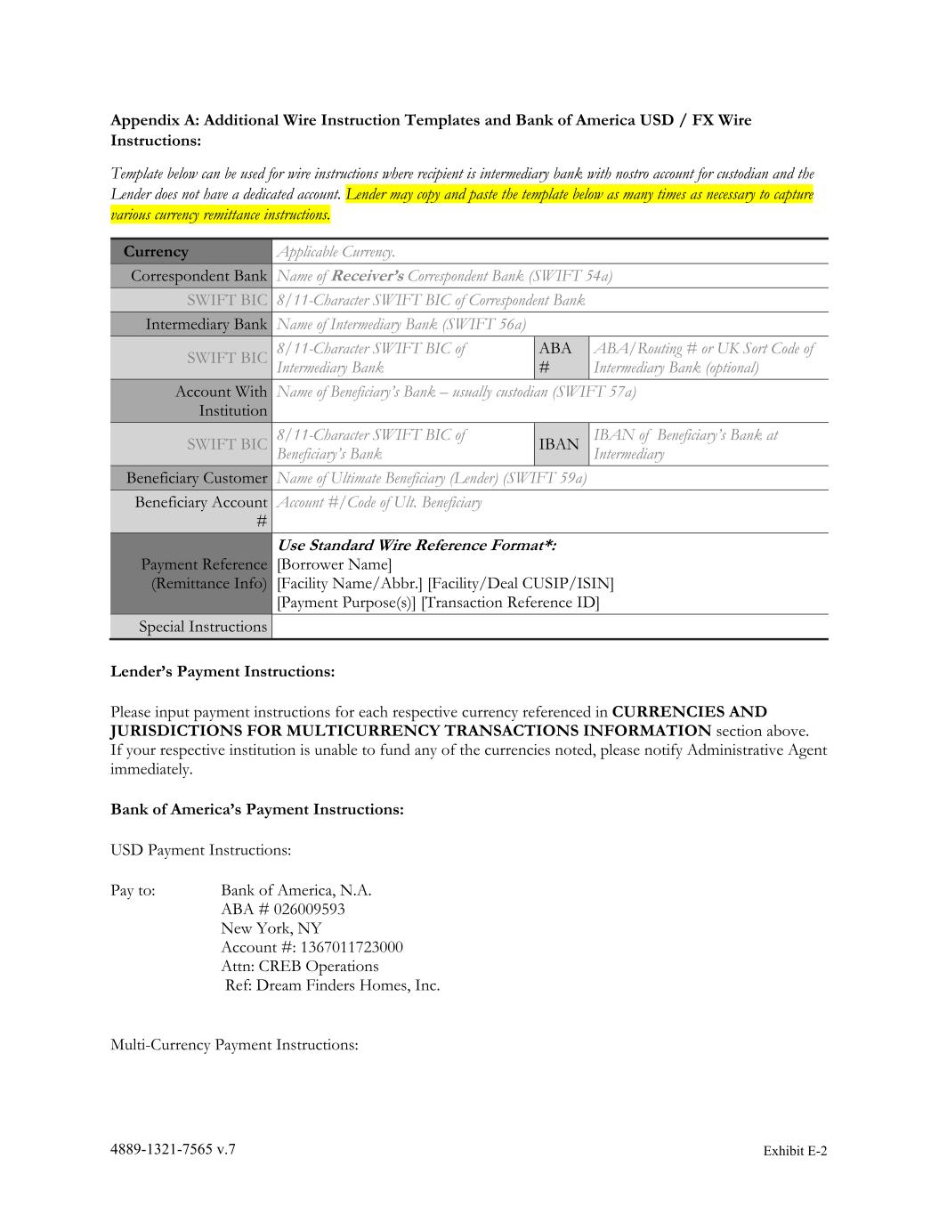 4889-1321-7565 v.7 Exhibit E-2 Appendix A: Additional Wire Instruction Templates and Bank of America USD / FX Wire Instructions: Template below can be used for wire instructions where recipient is intermediary bank with nostro account for custodian and the Lender does not have a dedicated account. Lender may copy and paste the template below as many times as necessary to capture various currency remittance instructions. Currency Applicable Currency. Correspondent Bank Name of Receiver’s Correspondent Bank (SWIFT 54a) SWIFT BIC 8/11-Character SWIFT BIC of Correspondent Bank Intermediary Bank Name of Intermediary Bank (SWIFT 56a) SWIFT BIC 8/11-Character SWIFT BIC of Intermediary Bank ABA # ABA/Routing # or UK Sort Code of Intermediary Bank (optional) Account With Institution Name of Beneficiary’s Bank – usually custodian (SWIFT 57a) SWIFT BIC 8/11-Character SWIFT BIC of Beneficiary’s Bank IBAN IBAN of Beneficiary’s Bank at Intermediary Beneficiary Customer Name of Ultimate Beneficiary (Lender) (SWIFT 59a) Beneficiary Account # Account #/Code of Ult. Beneficiary Payment Reference (Remittance Info) Use Standard Wire Reference Format*: [Borrower Name] [Facility Name/Abbr.] [Facility/Deal CUSIP/ISIN] [Payment Purpose(s)] [Transaction Reference ID] Special Instructions Lender’s Payment Instructions: Please input payment instructions for each respective currency referenced in CURRENCIES AND JURISDICTIONS FOR MULTICURRENCY TRANSACTIONS INFORMATION section above. If your respective institution is unable to fund any of the currencies noted, please notify Administrative Agent immediately. Bank of America’s Payment Instructions: USD Payment Instructions: Pay to: Bank of America, N.A. ABA # 026009593 New York, NY Account #: 1367011723000 Attn: CREB Operations Ref: Dream Finders Homes, Inc. Multi-Currency Payment Instructions:
