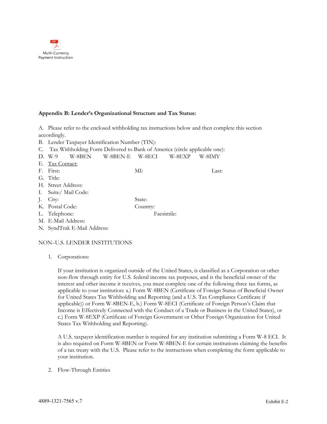 4889-1321-7565 v.7 Exhibit E-2 Multi-Currency Payment Instruction Appendix B: Lender’s Organizational Structure and Tax Status: A. Please refer to the enclosed withholding tax instructions below and then complete this section accordingly. B. Lender Taxpayer Identification Number (TIN): C. Tax Withholding Form Delivered to Bank of America (circle applicable one): D. W-9 W-8BEN W-8BEN-E W-8ECI W-8EXP W-8IMY E. Tax Contact: F. First: MI: Last: G. Title: H. Street Address: I. Suite/ Mail Code: J. City: State: K. Postal Code: Country: L. Telephone: Facsimile: M. E-Mail Address: N. SyndTrak E-Mail Address: NON–U.S. LENDER INSTITUTIONS 1. Corporations: If your institution is organized outside of the United States, is classified as a Corporation or other non-flow through entity for U.S. federal income tax purposes, and is the beneficial owner of the interest and other income it receives, you must complete one of the following three tax forms, as applicable to your institution: a.) Form W-8BEN (Certificate of Foreign Status of Beneficial Owner for United States Tax Withholding and Reporting (and a U.S. Tax Compliance Certificate if applicable)) or Form W-8BEN-E, b.) Form W-8ECI (Certificate of Foreign Person’s Claim that Income is Effectively Connected with the Conduct of a Trade or Business in the United States), or c.) Form W-8EXP (Certificate of Foreign Government or Other Foreign Organization for United States Tax Withholding and Reporting). A U.S. taxpayer identification number is required for any institution submitting a Form W-8 ECI. It is also required on Form W-8BEN or Form W-8BEN-E for certain institutions claiming the benefits of a tax treaty with the U.S. Please refer to the instructions when completing the form applicable to your institution. 2. Flow-Through Entities