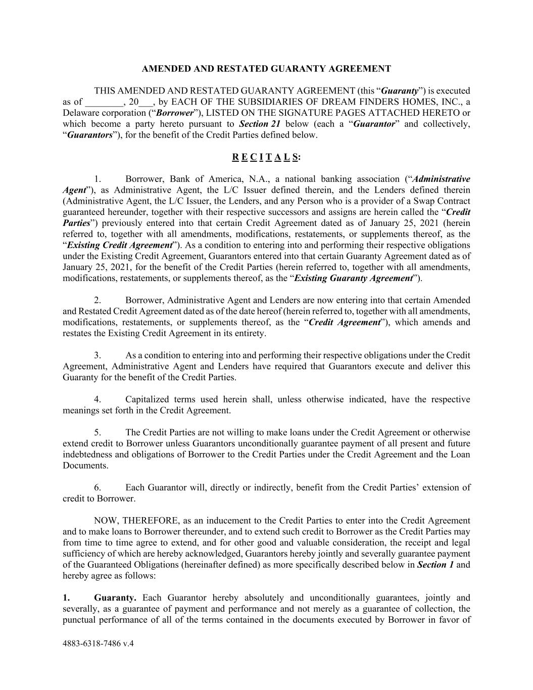 4883-6318-7486 v.4 AMENDED AND RESTATED GUARANTY AGREEMENT THIS AMENDED AND RESTATED GUARANTY AGREEMENT (this “Guaranty”) is executed as of ________, 20___, by EACH OF THE SUBSIDIARIES OF DREAM FINDERS HOMES, INC., a Delaware corporation (“Borrower”), LISTED ON THE SIGNATURE PAGES ATTACHED HERETO or which become a party hereto pursuant to Section 21 below (each a “Guarantor” and collectively, “Guarantors”), for the benefit of the Credit Parties defined below. R E C I T A L S: 1. Borrower, Bank of America, N.A., a national banking association (“Administrative Agent”), as Administrative Agent, the L/C Issuer defined therein, and the Lenders defined therein (Administrative Agent, the L/C Issuer, the Lenders, and any Person who is a provider of a Swap Contract guaranteed hereunder, together with their respective successors and assigns are herein called the “Credit Parties”) previously entered into that certain Credit Agreement dated as of January 25, 2021 (herein referred to, together with all amendments, modifications, restatements, or supplements thereof, as the “Existing Credit Agreement”). As a condition to entering into and performing their respective obligations under the Existing Credit Agreement, Guarantors entered into that certain Guaranty Agreement dated as of January 25, 2021, for the benefit of the Credit Parties (herein referred to, together with all amendments, modifications, restatements, or supplements thereof, as the “Existing Guaranty Agreement”). 2. Borrower, Administrative Agent and Lenders are now entering into that certain Amended and Restated Credit Agreement dated as of the date hereof (herein referred to, together with all amendments, modifications, restatements, or supplements thereof, as the “Credit Agreement”), which amends and restates the Existing Credit Agreement in its entirety. 3. As a condition to entering into and performing their respective obligations under the Credit Agreement, Administrative Agent and Lenders have required that Guarantors execute and deliver this Guaranty for the benefit of the Credit Parties. 4. Capitalized terms used herein shall, unless otherwise indicated, have the respective meanings set forth in the Credit Agreement. 5. The Credit Parties are not willing to make loans under the Credit Agreement or otherwise extend credit to Borrower unless Guarantors unconditionally guarantee payment of all present and future indebtedness and obligations of Borrower to the Credit Parties under the Credit Agreement and the Loan Documents. 6. Each Guarantor will, directly or indirectly, benefit from the Credit Parties’ extension of credit to Borrower. NOW, THEREFORE, as an inducement to the Credit Parties to enter into the Credit Agreement and to make loans to Borrower thereunder, and to extend such credit to Borrower as the Credit Parties may from time to time agree to extend, and for other good and valuable consideration, the receipt and legal sufficiency of which are hereby acknowledged, Guarantors hereby jointly and severally guarantee payment of the Guaranteed Obligations (hereinafter defined) as more specifically described below in Section 1 and hereby agree as follows: 1. Guaranty. Each Guarantor hereby absolutely and unconditionally guarantees, jointly and severally, as a guarantee of payment and performance and not merely as a guarantee of collection, the punctual performance of all of the terms contained in the documents executed by Borrower in favor of