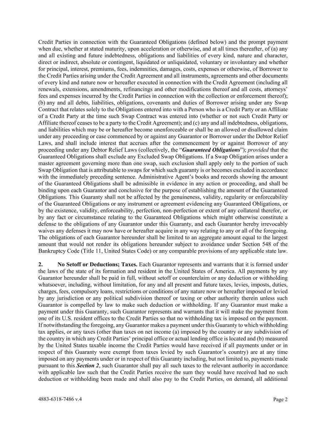 4883-6318-7486 v.4 Page 2 Credit Parties in connection with the Guaranteed Obligations (defined below) and the prompt payment when due, whether at stated maturity, upon acceleration or otherwise, and at all times thereafter, of (a) any and all existing and future indebtedness, obligations and liabilities of every kind, nature and character, direct or indirect, absolute or contingent, liquidated or unliquidated, voluntary or involuntary and whether for principal, interest, premiums, fees, indemnities, damages, costs, expenses or otherwise, of Borrower to the Credit Parties arising under the Credit Agreement and all instruments, agreements and other documents of every kind and nature now or hereafter executed in connection with the Credit Agreement (including all renewals, extensions, amendments, refinancings and other modifications thereof and all costs, attorneys’ fees and expenses incurred by the Credit Parties in connection with the collection or enforcement thereof); (b) any and all debts, liabilities, obligations, covenants and duties of Borrower arising under any Swap Contract that relates solely to the Obligations entered into with a Person who is a Credit Party or an Affiliate of a Credit Party at the time such Swap Contract was entered into (whether or not such Credit Party or Affiliate thereof ceases to be a party to the Credit Agreement); and (c) any and all indebtedness, obligations, and liabilities which may be or hereafter become unenforceable or shall be an allowed or disallowed claim under any proceeding or case commenced by or against any Guarantor or Borrower under the Debtor Relief Laws, and shall include interest that accrues after the commencement by or against Borrower of any proceeding under any Debtor Relief Laws (collectively, the “Guaranteed Obligations”); provided that the Guaranteed Obligations shall exclude any Excluded Swap Obligations. If a Swap Obligation arises under a master agreement governing more than one swap, such exclusion shall apply only to the portion of such Swap Obligation that is attributable to swaps for which such guaranty is or becomes excluded in accordance with the immediately preceding sentence. Administrative Agent’s books and records showing the amount of the Guaranteed Obligations shall be admissible in evidence in any action or proceeding, and shall be binding upon each Guarantor and conclusive for the purpose of establishing the amount of the Guaranteed Obligations. This Guaranty shall not be affected by the genuineness, validity, regularity or enforceability of the Guaranteed Obligations or any instrument or agreement evidencing any Guaranteed Obligations, or by the existence, validity, enforceability, perfection, non-perfection or extent of any collateral therefor, or by any fact or circumstance relating to the Guaranteed Obligations which might otherwise constitute a defense to the obligations of any Guarantor under this Guaranty, and each Guarantor hereby irrevocably waives any defenses it may now have or hereafter acquire in any way relating to any or all of the foregoing. The obligations of each Guarantor hereunder shall be limited to an aggregate amount equal to the largest amount that would not render its obligations hereunder subject to avoidance under Section 548 of the Bankruptcy Code (Title 11, United States Code) or any comparable provisions of any applicable state law. 2. No Setoff or Deductions; Taxes. Each Guarantor represents and warrants that it is formed under the laws of the state of its formation and resident in the United States of America. All payments by any Guarantor hereunder shall be paid in full, without setoff or counterclaim or any deduction or withholding whatsoever, including, without limitation, for any and all present and future taxes, levies, imposts, duties, charges, fees, compulsory loans, restrictions or conditions of any nature now or hereafter imposed or levied by any jurisdiction or any political subdivision thereof or taxing or other authority therein unless such Guarantor is compelled by law to make such deduction or withholding. If any Guarantor must make a payment under this Guaranty, such Guarantor represents and warrants that it will make the payment from one of its U.S. resident offices to the Credit Parties so that no withholding tax is imposed on the payment. If notwithstanding the foregoing, any Guarantor makes a payment under this Guaranty to which withholding tax applies, or any taxes (other than taxes on net income (a) imposed by the country or any subdivision of the country in which any Credit Parties’ principal office or actual lending office is located and (b) measured by the United States taxable income the Credit Parties would have received if all payments under or in respect of this Guaranty were exempt from taxes levied by such Guarantor’s country) are at any time imposed on any payments under or in respect of this Guaranty including, but not limited to, payments made pursuant to this Section 2, such Guarantor shall pay all such taxes to the relevant authority in accordance with applicable law such that the Credit Parties receive the sum they would have received had no such deduction or withholding been made and shall also pay to the Credit Parties, on demand, all additional