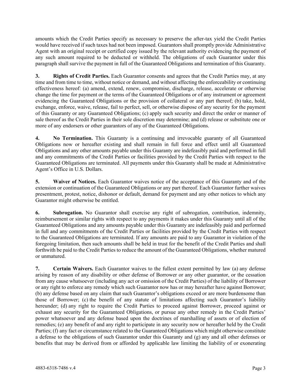 4883-6318-7486 v.4 Page 3 amounts which the Credit Parties specify as necessary to preserve the after-tax yield the Credit Parties would have received if such taxes had not been imposed. Guarantors shall promptly provide Administrative Agent with an original receipt or certified copy issued by the relevant authority evidencing the payment of any such amount required to be deducted or withheld. The obligations of each Guarantor under this paragraph shall survive the payment in full of the Guaranteed Obligations and termination of this Guaranty. 3. Rights of Credit Parties. Each Guarantor consents and agrees that the Credit Parties may, at any time and from time to time, without notice or demand, and without affecting the enforceability or continuing effectiveness hereof: (a) amend, extend, renew, compromise, discharge, release, accelerate or otherwise change the time for payment or the terms of the Guaranteed Obligations or of any instrument or agreement evidencing the Guaranteed Obligations or the provision of collateral or any part thereof; (b) take, hold, exchange, enforce, waive, release, fail to perfect, sell, or otherwise dispose of any security for the payment of this Guaranty or any Guaranteed Obligations; (c) apply such security and direct the order or manner of sale thereof as the Credit Parties in their sole discretion may determine; and (d) release or substitute one or more of any endorsers or other guarantors of any of the Guaranteed Obligations. 4. No Termination. This Guaranty is a continuing and irrevocable guaranty of all Guaranteed Obligations now or hereafter existing and shall remain in full force and effect until all Guaranteed Obligations and any other amounts payable under this Guaranty are indefeasibly paid and performed in full and any commitments of the Credit Parties or facilities provided by the Credit Parties with respect to the Guaranteed Obligations are terminated. All payments under this Guaranty shall be made at Administrative Agent’s Office in U.S. Dollars. 5. Waiver of Notices. Each Guarantor waives notice of the acceptance of this Guaranty and of the extension or continuation of the Guaranteed Obligations or any part thereof. Each Guarantor further waives presentment, protest, notice, dishonor or default, demand for payment and any other notices to which any Guarantor might otherwise be entitled. 6. Subrogation. No Guarantor shall exercise any right of subrogation, contribution, indemnity, reimbursement or similar rights with respect to any payments it makes under this Guaranty until all of the Guaranteed Obligations and any amounts payable under this Guaranty are indefeasibly paid and performed in full and any commitments of the Credit Parties or facilities provided by the Credit Parties with respect to the Guaranteed Obligations are terminated. If any amounts are paid to any Guarantor in violation of the foregoing limitation, then such amounts shall be held in trust for the benefit of the Credit Parties and shall forthwith be paid to the Credit Parties to reduce the amount of the Guaranteed Obligations, whether matured or unmatured. 7. Certain Waivers. Each Guarantor waives to the fullest extent permitted by law (a) any defense arising by reason of any disability or other defense of Borrower or any other guarantor, or the cessation from any cause whatsoever (including any act or omission of the Credit Parties) of the liability of Borrower or any right to enforce any remedy which such Guarantor now has or may hereafter have against Borrower; (b) any defense based on any claim that such Guarantor’s obligations exceed or are more burdensome than those of Borrower; (c) the benefit of any statute of limitations affecting such Guarantor’s liability hereunder; (d) any right to require the Credit Parties to proceed against Borrower, proceed against or exhaust any security for the Guaranteed Obligations, or pursue any other remedy in the Credit Parties’ power whatsoever and any defense based upon the doctrines of marshalling of assets or of election of remedies; (e) any benefit of and any right to participate in any security now or hereafter held by the Credit Parties; (f) any fact or circumstance related to the Guaranteed Obligations which might otherwise constitute a defense to the obligations of such Guarantor under this Guaranty and (g) any and all other defenses or benefits that may be derived from or afforded by applicable law limiting the liability of or exonerating