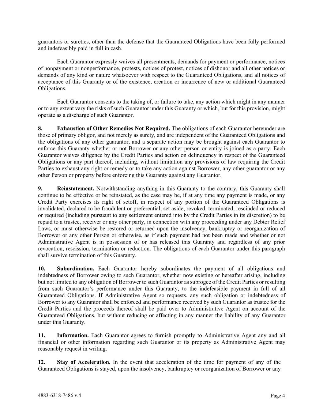 4883-6318-7486 v.4 Page 4 guarantors or sureties, other than the defense that the Guaranteed Obligations have been fully performed and indefeasibly paid in full in cash. Each Guarantor expressly waives all presentments, demands for payment or performance, notices of nonpayment or nonperformance, protests, notices of protest, notices of dishonor and all other notices or demands of any kind or nature whatsoever with respect to the Guaranteed Obligations, and all notices of acceptance of this Guaranty or of the existence, creation or incurrence of new or additional Guaranteed Obligations. Each Guarantor consents to the taking of, or failure to take, any action which might in any manner or to any extent vary the risks of such Guarantor under this Guaranty or which, but for this provision, might operate as a discharge of such Guarantor. 8. Exhaustion of Other Remedies Not Required. The obligations of each Guarantor hereunder are those of primary obligor, and not merely as surety, and are independent of the Guaranteed Obligations and the obligations of any other guarantor, and a separate action may be brought against each Guarantor to enforce this Guaranty whether or not Borrower or any other person or entity is joined as a party. Each Guarantor waives diligence by the Credit Parties and action on delinquency in respect of the Guaranteed Obligations or any part thereof, including, without limitation any provisions of law requiring the Credit Parties to exhaust any right or remedy or to take any action against Borrower, any other guarantor or any other Person or property before enforcing this Guaranty against any Guarantor. 9. Reinstatement. Notwithstanding anything in this Guaranty to the contrary, this Guaranty shall continue to be effective or be reinstated, as the case may be, if at any time any payment is made, or any Credit Party exercises its right of setoff, in respect of any portion of the Guaranteed Obligations is invalidated, declared to be fraudulent or preferential, set aside, revoked, terminated, rescinded or reduced or required (including pursuant to any settlement entered into by the Credit Parties in its discretion) to be repaid to a trustee, receiver or any other party, in connection with any proceeding under any Debtor Relief Laws, or must otherwise be restored or returned upon the insolvency, bankruptcy or reorganization of Borrower or any other Person or otherwise, as if such payment had not been made and whether or not Administrative Agent is in possession of or has released this Guaranty and regardless of any prior revocation, rescission, termination or reduction. The obligations of each Guarantor under this paragraph shall survive termination of this Guaranty. 10. Subordination. Each Guarantor hereby subordinates the payment of all obligations and indebtedness of Borrower owing to such Guarantor, whether now existing or hereafter arising, including but not limited to any obligation of Borrower to such Guarantor as subrogee of the Credit Parties or resulting from such Guarantor’s performance under this Guaranty, to the indefeasible payment in full of all Guaranteed Obligations. If Administrative Agent so requests, any such obligation or indebtedness of Borrower to any Guarantor shall be enforced and performance received by such Guarantor as trustee for the Credit Parties and the proceeds thereof shall be paid over to Administrative Agent on account of the Guaranteed Obligations, but without reducing or affecting in any manner the liability of any Guarantor under this Guaranty. 11. Information. Each Guarantor agrees to furnish promptly to Administrative Agent any and all financial or other information regarding such Guarantor or its property as Administrative Agent may reasonably request in writing. 12. Stay of Acceleration. In the event that acceleration of the time for payment of any of the Guaranteed Obligations is stayed, upon the insolvency, bankruptcy or reorganization of Borrower or any