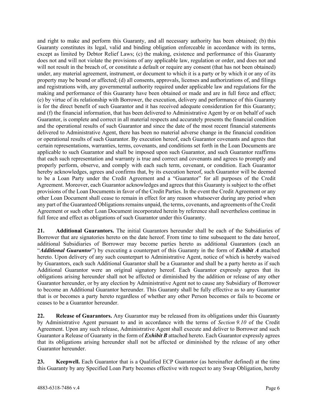4883-6318-7486 v.4 Page 6 and right to make and perform this Guaranty, and all necessary authority has been obtained; (b) this Guaranty constitutes its legal, valid and binding obligation enforceable in accordance with its terms, except as limited by Debtor Relief Laws; (c) the making, existence and performance of this Guaranty does not and will not violate the provisions of any applicable law, regulation or order, and does not and will not result in the breach of, or constitute a default or require any consent (that has not been obtained) under, any material agreement, instrument, or document to which it is a party or by which it or any of its property may be bound or affected; (d) all consents, approvals, licenses and authorizations of, and filings and registrations with, any governmental authority required under applicable law and regulations for the making and performance of this Guaranty have been obtained or made and are in full force and effect; (e) by virtue of its relationship with Borrower, the execution, delivery and performance of this Guaranty is for the direct benefit of such Guarantor and it has received adequate consideration for this Guaranty; and (f) the financial information, that has been delivered to Administrative Agent by or on behalf of such Guarantor, is complete and correct in all material respects and accurately presents the financial condition and the operational results of such Guarantor and since the date of the most recent financial statements delivered to Administrative Agent, there has been no material adverse change in the financial condition or operational results of such Guarantor. By execution hereof, each Guarantor covenants and agrees that certain representations, warranties, terms, covenants, and conditions set forth in the Loan Documents are applicable to such Guarantor and shall be imposed upon such Guarantor, and such Guarantor reaffirms that each such representation and warranty is true and correct and covenants and agrees to promptly and properly perform, observe, and comply with each such term, covenant, or condition. Each Guarantor hereby acknowledges, agrees and confirms that, by its execution hereof, such Guarantor will be deemed to be a Loan Party under the Credit Agreement and a “Guarantor” for all purposes of the Credit Agreement. Moreover, each Guarantor acknowledges and agrees that this Guaranty is subject to the offset provisions of the Loan Documents in favor of the Credit Parties. In the event the Credit Agreement or any other Loan Document shall cease to remain in effect for any reason whatsoever during any period when any part of the Guaranteed Obligations remains unpaid, the terms, covenants, and agreements of the Credit Agreement or such other Loan Document incorporated herein by reference shall nevertheless continue in full force and effect as obligations of such Guarantor under this Guaranty. 21. Additional Guarantors. The initial Guarantors hereunder shall be each of the Subsidiaries of Borrower that are signatories hereto on the date hereof. From time to time subsequent to the date hereof, additional Subsidiaries of Borrower may become parties hereto as additional Guarantors (each an “Additional Guarantor”) by executing a counterpart of this Guaranty in the form of Exhibit A attached hereto. Upon delivery of any such counterpart to Administrative Agent, notice of which is hereby waived by Guarantors, each such Additional Guarantor shall be a Guarantor and shall be a party hereto as if such Additional Guarantor were an original signatory hereof. Each Guarantor expressly agrees that its obligations arising hereunder shall not be affected or diminished by the addition or release of any other Guarantor hereunder, or by any election by Administrative Agent not to cause any Subsidiary of Borrower to become an Additional Guarantor hereunder. This Guaranty shall be fully effective as to any Guarantor that is or becomes a party hereto regardless of whether any other Person becomes or fails to become or ceases to be a Guarantor hereunder. 22. Release of Guarantors. Any Guarantor may be released from its obligations under this Guaranty by Administrative Agent pursuant to and in accordance with the terms of Section 9.10 of the Credit Agreement. Upon any such release, Administrative Agent shall execute and deliver to Borrower and such Guarantor a Release of Guaranty in the form of Exhibit B attached hereto. Each Guarantor expressly agrees that its obligations arising hereunder shall not be affected or diminished by the release of any other Guarantor hereunder. 23. Keepwell. Each Guarantor that is a Qualified ECP Guarantor (as hereinafter defined) at the time this Guaranty by any Specified Loan Party becomes effective with respect to any Swap Obligation, hereby