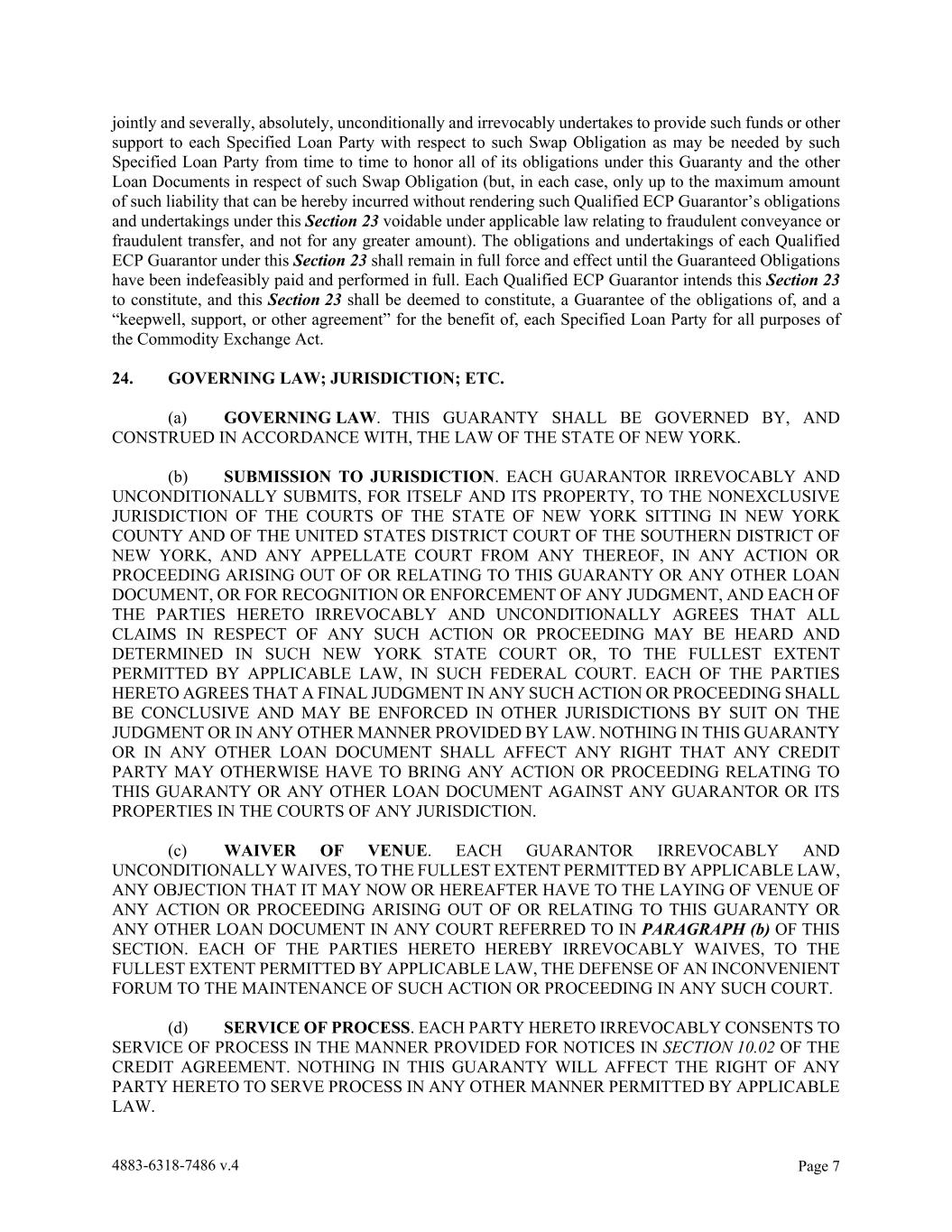 4883-6318-7486 v.4 Page 7 jointly and severally, absolutely, unconditionally and irrevocably undertakes to provide such funds or other support to each Specified Loan Party with respect to such Swap Obligation as may be needed by such Specified Loan Party from time to time to honor all of its obligations under this Guaranty and the other Loan Documents in respect of such Swap Obligation (but, in each case, only up to the maximum amount of such liability that can be hereby incurred without rendering such Qualified ECP Guarantor’s obligations and undertakings under this Section 23 voidable under applicable law relating to fraudulent conveyance or fraudulent transfer, and not for any greater amount). The obligations and undertakings of each Qualified ECP Guarantor under this Section 23 shall remain in full force and effect until the Guaranteed Obligations have been indefeasibly paid and performed in full. Each Qualified ECP Guarantor intends this Section 23 to constitute, and this Section 23 shall be deemed to constitute, a Guarantee of the obligations of, and a “keepwell, support, or other agreement” for the benefit of, each Specified Loan Party for all purposes of the Commodity Exchange Act. 24. GOVERNING LAW; JURISDICTION; ETC. (a) GOVERNING LAW. THIS GUARANTY SHALL BE GOVERNED BY, AND CONSTRUED IN ACCORDANCE WITH, THE LAW OF THE STATE OF NEW YORK. (b) SUBMISSION TO JURISDICTION. EACH GUARANTOR IRREVOCABLY AND UNCONDITIONALLY SUBMITS, FOR ITSELF AND ITS PROPERTY, TO THE NONEXCLUSIVE JURISDICTION OF THE COURTS OF THE STATE OF NEW YORK SITTING IN NEW YORK COUNTY AND OF THE UNITED STATES DISTRICT COURT OF THE SOUTHERN DISTRICT OF NEW YORK, AND ANY APPELLATE COURT FROM ANY THEREOF, IN ANY ACTION OR PROCEEDING ARISING OUT OF OR RELATING TO THIS GUARANTY OR ANY OTHER LOAN DOCUMENT, OR FOR RECOGNITION OR ENFORCEMENT OF ANY JUDGMENT, AND EACH OF THE PARTIES HERETO IRREVOCABLY AND UNCONDITIONALLY AGREES THAT ALL CLAIMS IN RESPECT OF ANY SUCH ACTION OR PROCEEDING MAY BE HEARD AND DETERMINED IN SUCH NEW YORK STATE COURT OR, TO THE FULLEST EXTENT PERMITTED BY APPLICABLE LAW, IN SUCH FEDERAL COURT. EACH OF THE PARTIES HERETO AGREES THAT A FINAL JUDGMENT IN ANY SUCH ACTION OR PROCEEDING SHALL BE CONCLUSIVE AND MAY BE ENFORCED IN OTHER JURISDICTIONS BY SUIT ON THE JUDGMENT OR IN ANY OTHER MANNER PROVIDED BY LAW. NOTHING IN THIS GUARANTY OR IN ANY OTHER LOAN DOCUMENT SHALL AFFECT ANY RIGHT THAT ANY CREDIT PARTY MAY OTHERWISE HAVE TO BRING ANY ACTION OR PROCEEDING RELATING TO THIS GUARANTY OR ANY OTHER LOAN DOCUMENT AGAINST ANY GUARANTOR OR ITS PROPERTIES IN THE COURTS OF ANY JURISDICTION. (c) WAIVER OF VENUE. EACH GUARANTOR IRREVOCABLY AND UNCONDITIONALLY WAIVES, TO THE FULLEST EXTENT PERMITTED BY APPLICABLE LAW, ANY OBJECTION THAT IT MAY NOW OR HEREAFTER HAVE TO THE LAYING OF VENUE OF ANY ACTION OR PROCEEDING ARISING OUT OF OR RELATING TO THIS GUARANTY OR ANY OTHER LOAN DOCUMENT IN ANY COURT REFERRED TO IN PARAGRAPH (b) OF THIS SECTION. EACH OF THE PARTIES HERETO HEREBY IRREVOCABLY WAIVES, TO THE FULLEST EXTENT PERMITTED BY APPLICABLE LAW, THE DEFENSE OF AN INCONVENIENT FORUM TO THE MAINTENANCE OF SUCH ACTION OR PROCEEDING IN ANY SUCH COURT. (d) SERVICE OF PROCESS. EACH PARTY HERETO IRREVOCABLY CONSENTS TO SERVICE OF PROCESS IN THE MANNER PROVIDED FOR NOTICES IN SECTION 10.02 OF THE CREDIT AGREEMENT. NOTHING IN THIS GUARANTY WILL AFFECT THE RIGHT OF ANY PARTY HERETO TO SERVE PROCESS IN ANY OTHER MANNER PERMITTED BY APPLICABLE LAW.