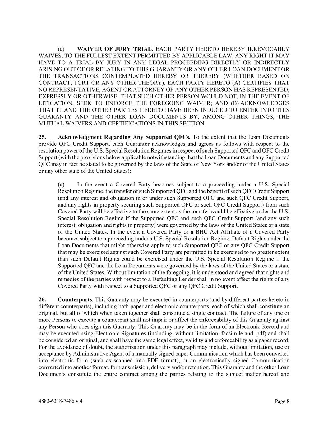 4883-6318-7486 v.4 Page 8 (e) WAIVER OF JURY TRIAL. EACH PARTY HERETO HEREBY IRREVOCABLY WAIVES, TO THE FULLEST EXTENT PERMITTED BY APPLICABLE LAW, ANY RIGHT IT MAY HAVE TO A TRIAL BY JURY IN ANY LEGAL PROCEEDING DIRECTLY OR INDIRECTLY ARISING OUT OF OR RELATING TO THIS GUARANTY OR ANY OTHER LOAN DOCUMENT OR THE TRANSACTIONS CONTEMPLATED HEREBY OR THEREBY (WHETHER BASED ON CONTRACT, TORT OR ANY OTHER THEORY). EACH PARTY HERETO (A) CERTIFIES THAT NO REPRESENTATIVE, AGENT OR ATTORNEY OF ANY OTHER PERSON HAS REPRESENTED, EXPRESSLY OR OTHERWISE, THAT SUCH OTHER PERSON WOULD NOT, IN THE EVENT OF LITIGATION, SEEK TO ENFORCE THE FOREGOING WAIVER; AND (B) ACKNOWLEDGES THAT IT AND THE OTHER PARTIES HERETO HAVE BEEN INDUCED TO ENTER INTO THIS GUARANTY AND THE OTHER LOAN DOCUMENTS BY, AMONG OTHER THINGS, THE MUTUAL WAIVERS AND CERTIFICATIONS IN THIS SECTION. 25. Acknowledgment Regarding Any Supported QFCs. To the extent that the Loan Documents provide QFC Credit Support, each Guarantor acknowledges and agrees as follows with respect to the resolution power of the U.S. Special Resolution Regimes in respect of such Supported QFC and QFC Credit Support (with the provisions below applicable notwithstanding that the Loan Documents and any Supported QFC may in fact be stated to be governed by the laws of the State of New York and/or of the United States or any other state of the United States): (a) In the event a Covered Party becomes subject to a proceeding under a U.S. Special Resolution Regime, the transfer of such Supported QFC and the benefit of such QFC Credit Support (and any interest and obligation in or under such Supported QFC and such QFC Credit Support, and any rights in property securing such Supported QFC or such QFC Credit Support) from such Covered Party will be effective to the same extent as the transfer would be effective under the U.S. Special Resolution Regime if the Supported QFC and such QFC Credit Support (and any such interest, obligation and rights in property) were governed by the laws of the United States or a state of the United States. In the event a Covered Party or a BHC Act Affiliate of a Covered Party becomes subject to a proceeding under a U.S. Special Resolution Regime, Default Rights under the Loan Documents that might otherwise apply to such Supported QFC or any QFC Credit Support that may be exercised against such Covered Party are permitted to be exercised to no greater extent than such Default Rights could be exercised under the U.S. Special Resolution Regime if the Supported QFC and the Loan Documents were governed by the laws of the United States or a state of the United States. Without limitation of the foregoing, it is understood and agreed that rights and remedies of the parties with respect to a Defaulting Lender shall in no event affect the rights of any Covered Party with respect to a Supported QFC or any QFC Credit Support. 26. Counterparts. This Guaranty may be executed in counterparts (and by different parties hereto in different counterparts), including both paper and electronic counterparts, each of which shall constitute an original, but all of which when taken together shall constitute a single contract. The failure of any one or more Persons to execute a counterpart shall not impair or affect the enforceability of this Guaranty against any Person who does sign this Guaranty. This Guaranty may be in the form of an Electronic Record and may be executed using Electronic Signatures (including, without limitation, facsimile and .pdf) and shall be considered an original, and shall have the same legal effect, validity and enforceability as a paper record. For the avoidance of doubt, the authorization under this paragraph may include, without limitation, use or acceptance by Administrative Agent of a manually signed paper Communication which has been converted into electronic form (such as scanned into PDF format), or an electronically signed Communication converted into another format, for transmission, delivery and/or retention. This Guaranty and the other Loan Documents constitute the entire contract among the parties relating to the subject matter hereof and